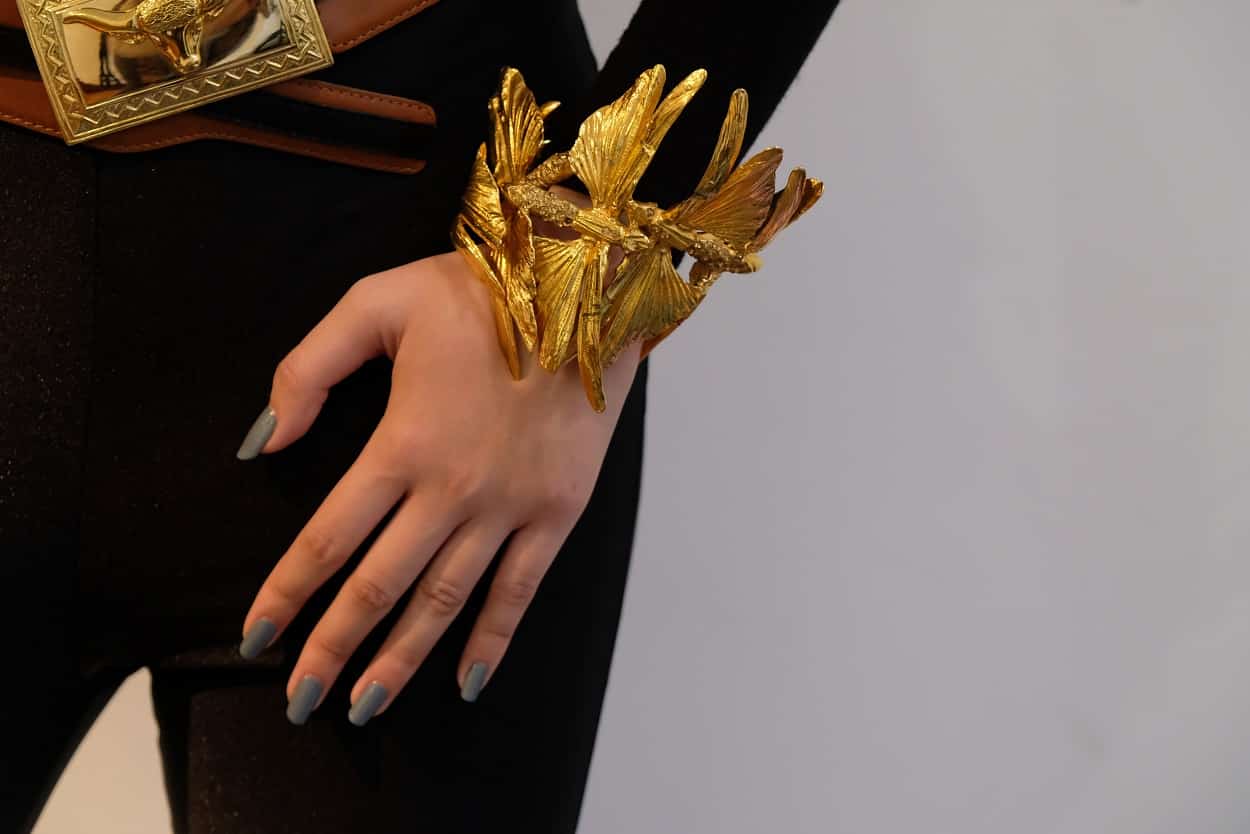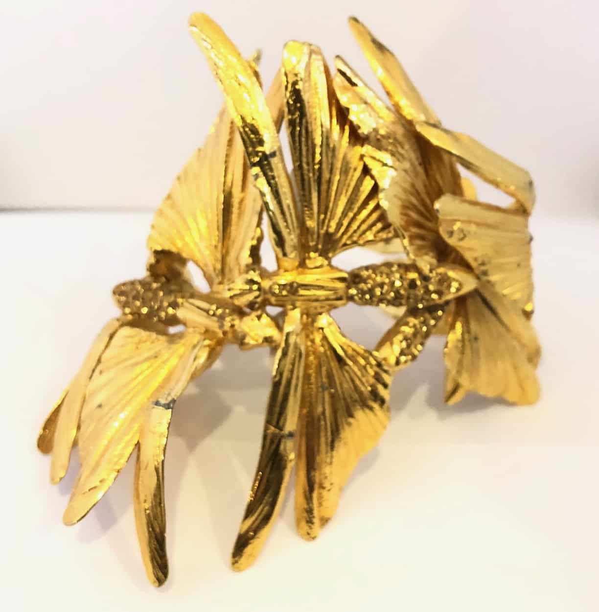 A statement catwalk piece trend. This amazing vintage armband bracelet is made of gilded gold tone with sculpted dragonfly. It is a unique piece, a work of art. the brand name is no longer visible.