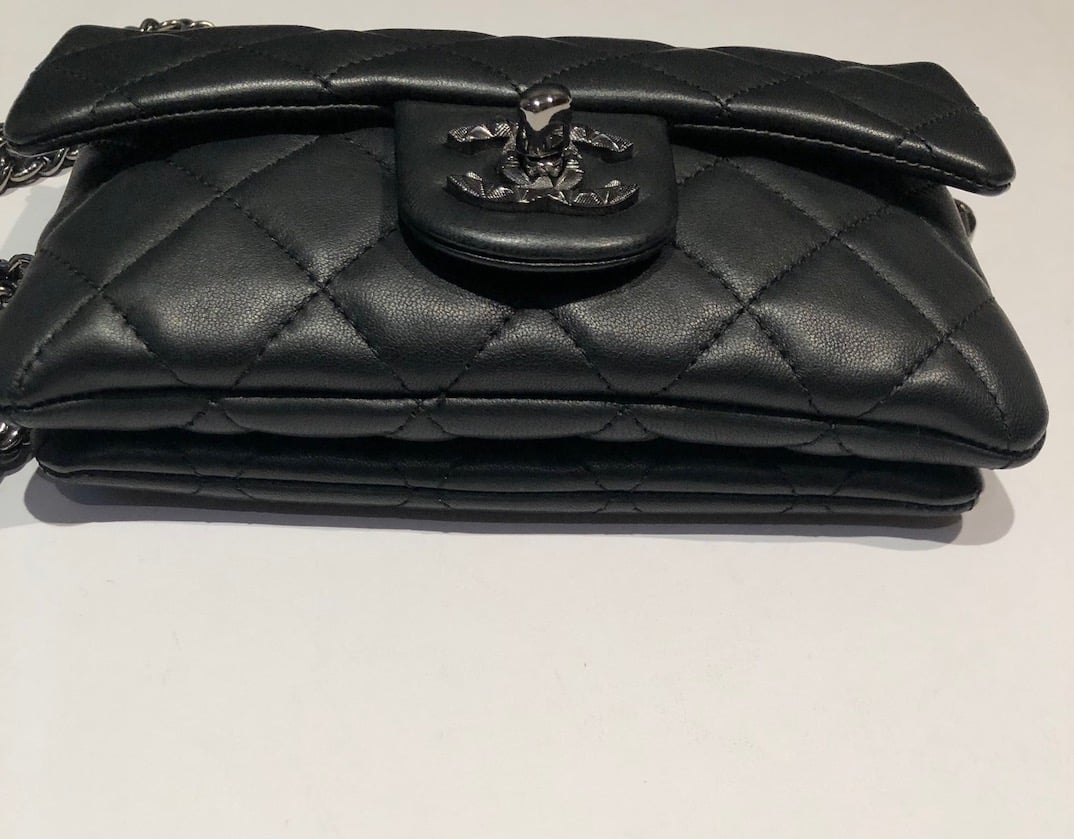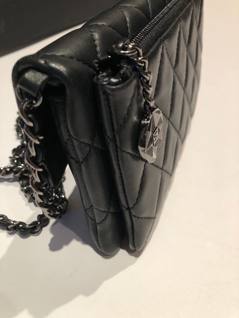 A very fashionable CHANEL 19 crossbody single flap bag with a back wallet. Handcrafted in classic lambskin quilted leather with glossy finished ruthenium hardware, crossbody interlaced leather and ruthenium chain, cc twist lock with carved finished in ruthenium. One back exterior (wallet style) zipped pocket with a pull out tag chain with a circular Chanel CC logo in ruthenium finished.