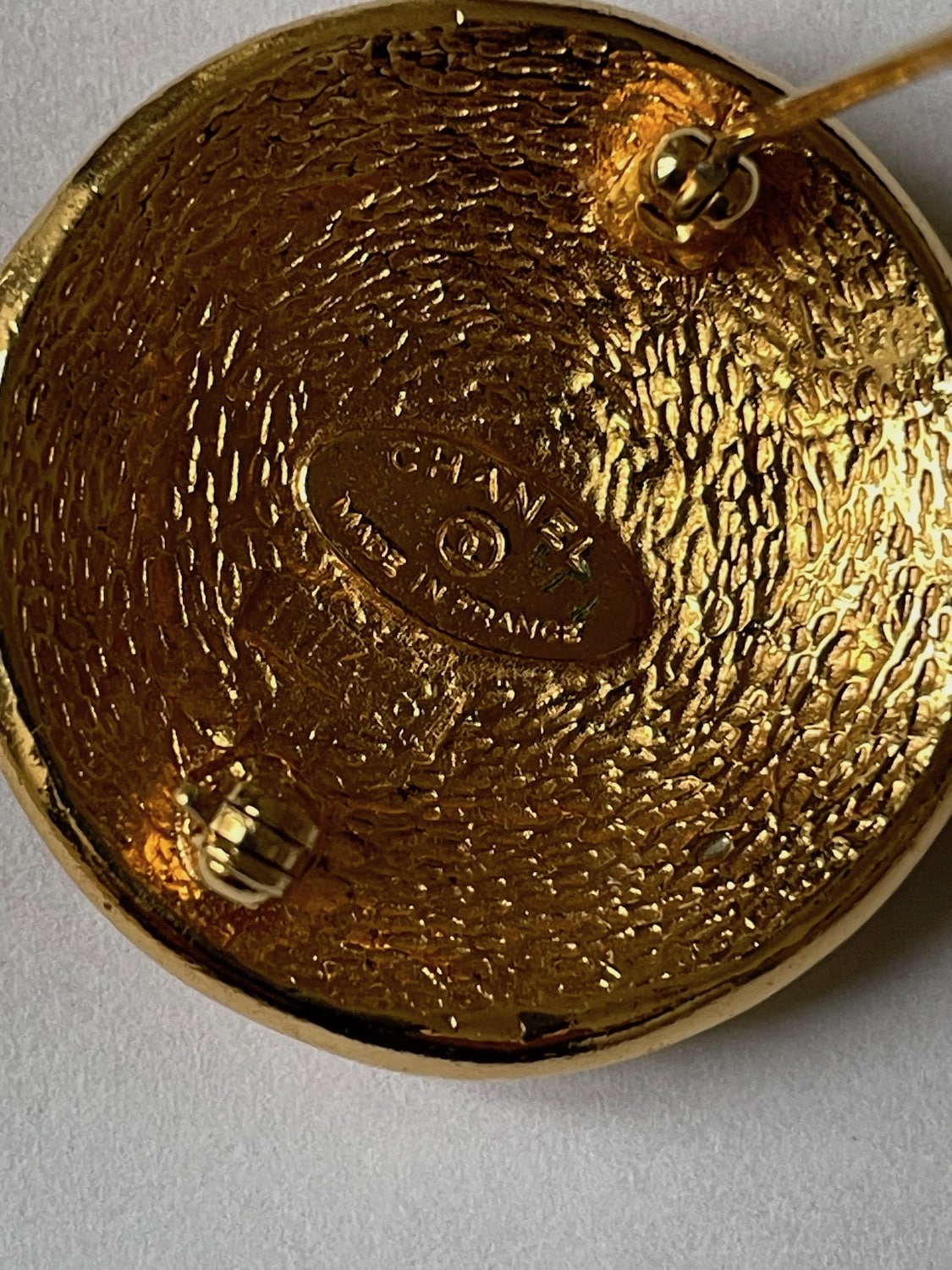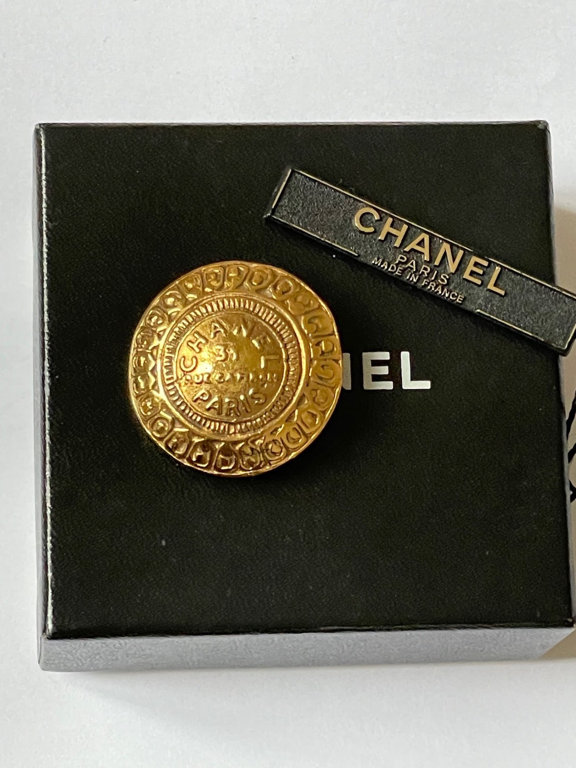 CHANEL 1980 31 Rue Cambon Round Brooch Gold Tone Vintage W/Box. A lovely very rare classic 31 Rue cambon Chanel Brooch, a tribute to Coco Chanel first Boutique in Paris, in Rue Cambon. Handcrafted with rich 18k gold plated, chiselled design with Chanel 31 Rue Cambon Paris. A ‘Must-Have’ very rare, Chanel highly collectable brooch!