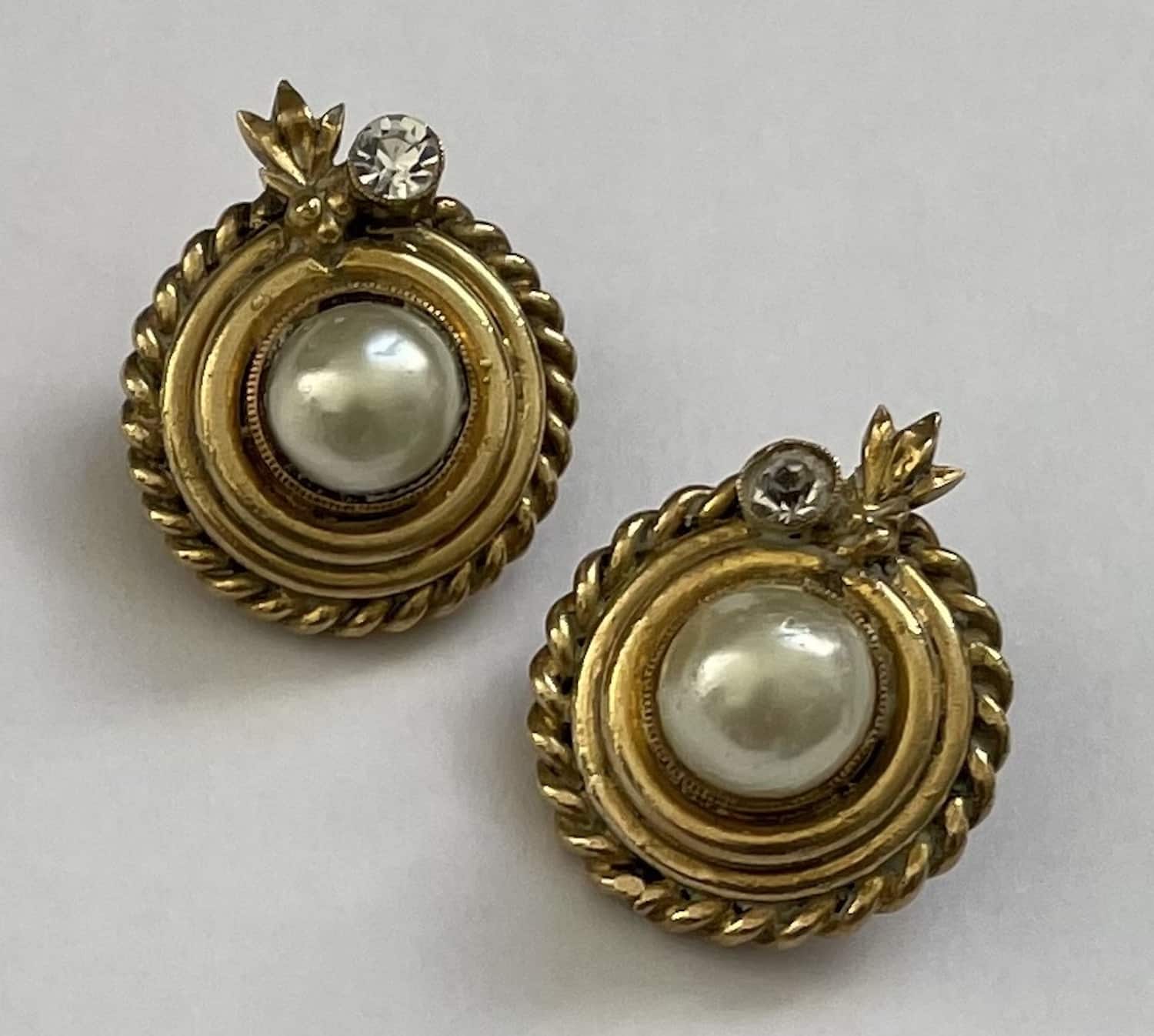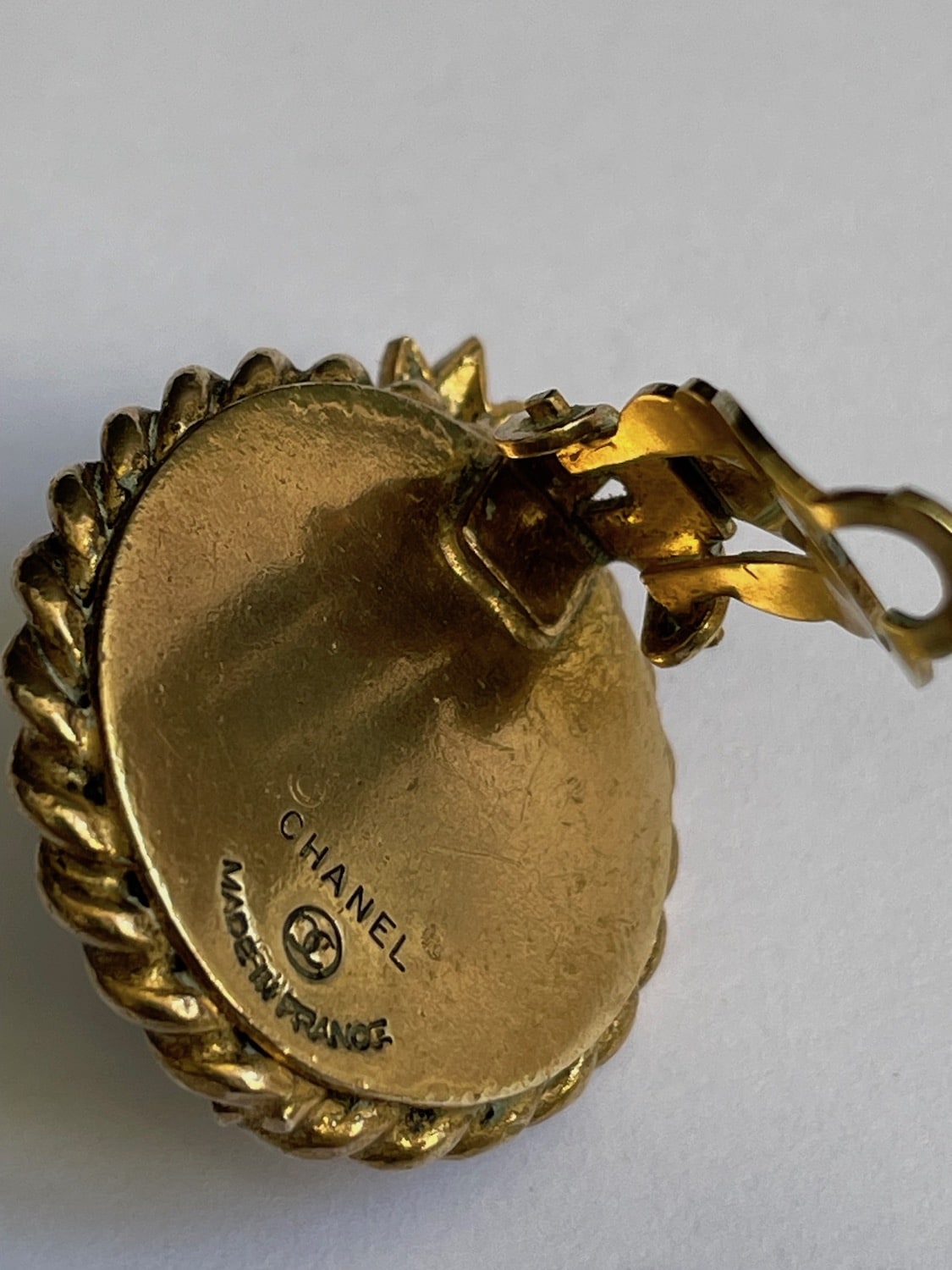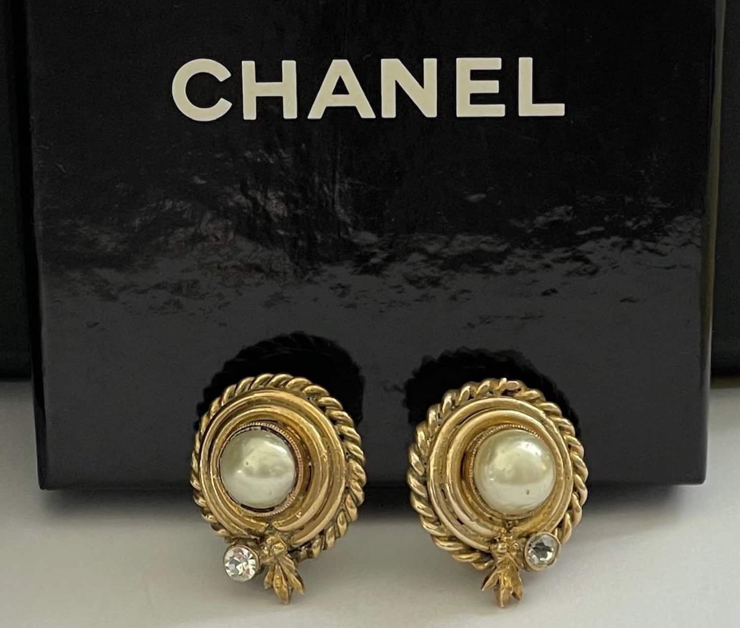 CHANEL 1980s 24K Gold Tone & Pearl Coco Chanel Sun Hat Earrings Vintage W/Box