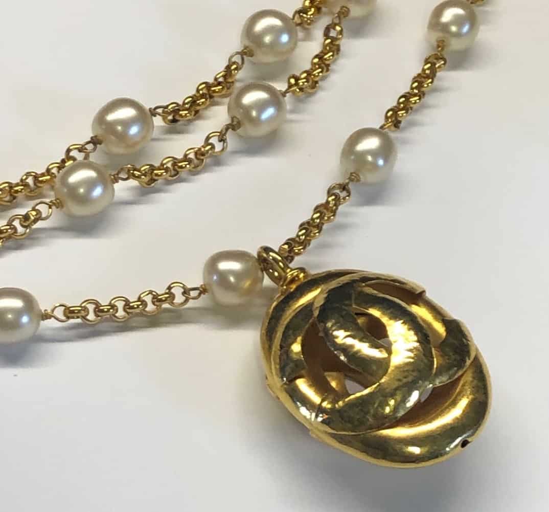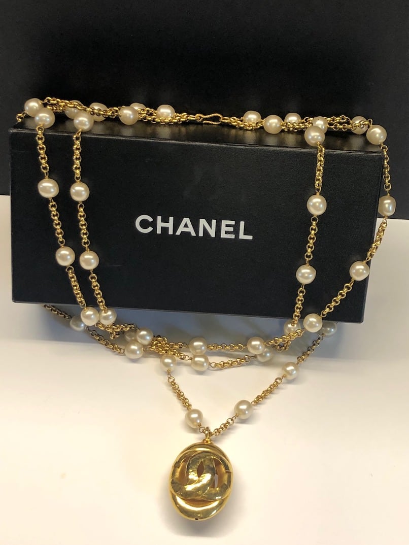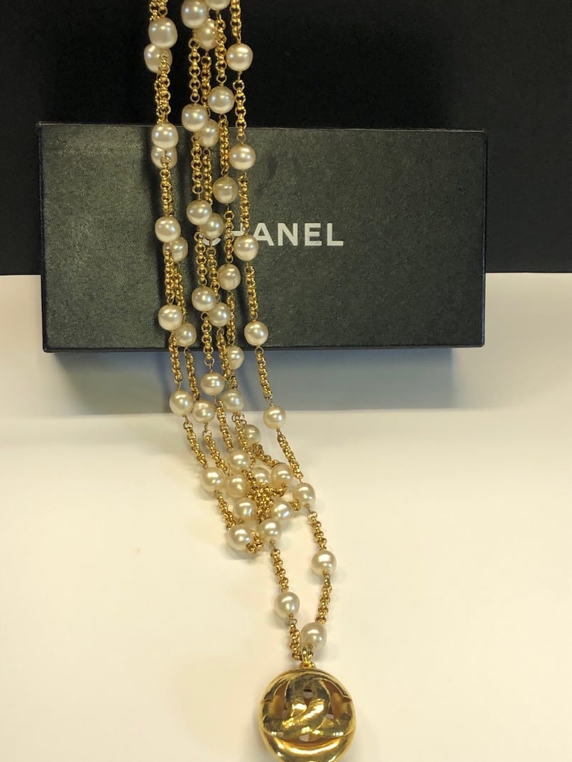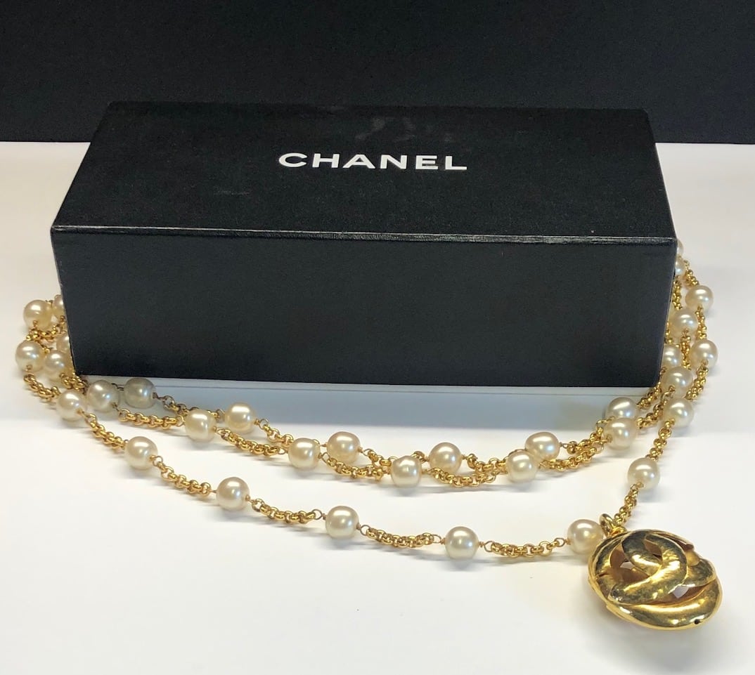 CHANEL 1980s Pearl Necklace CC Pendant 24K Gold Plated Rare Vintage