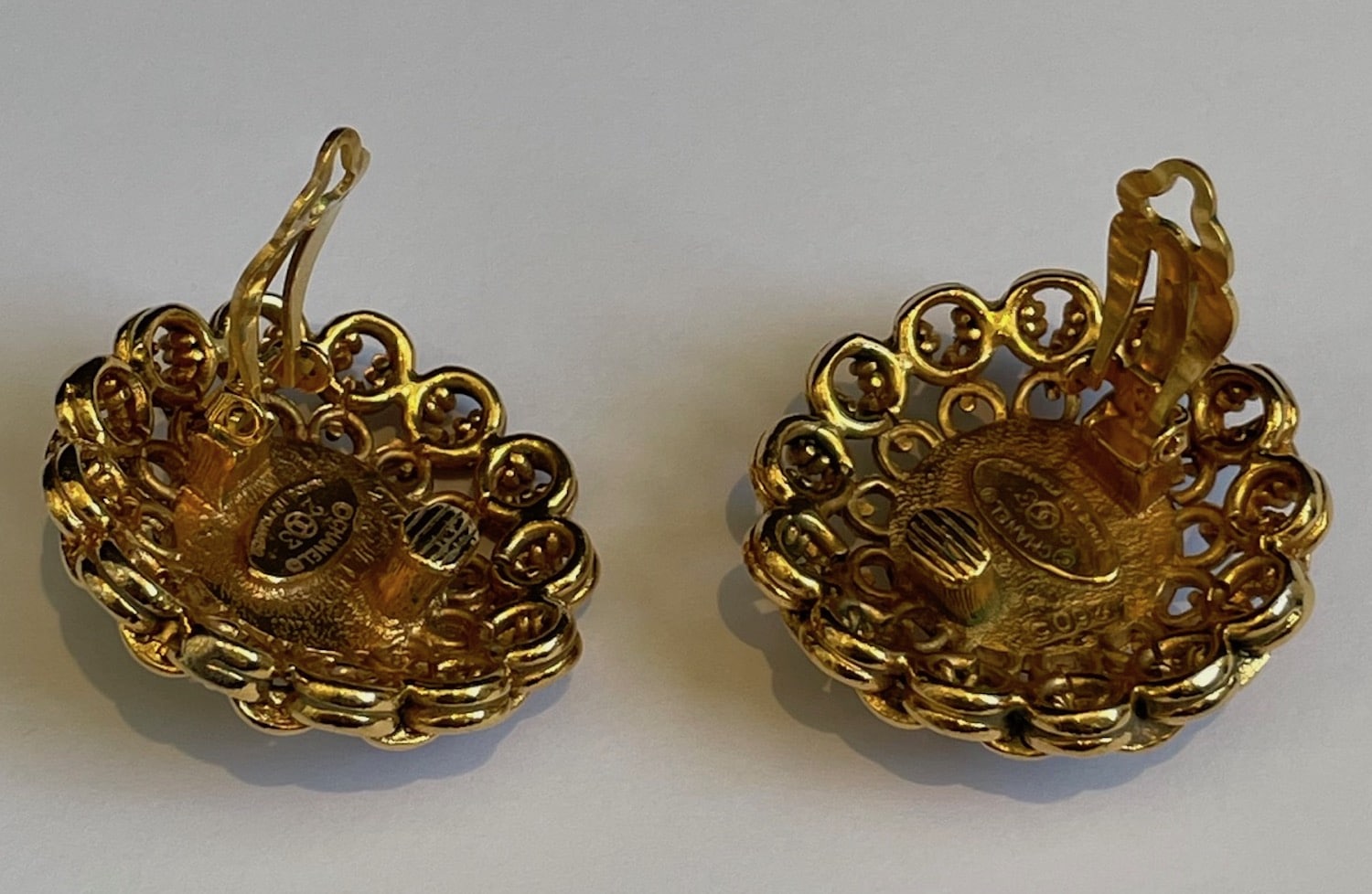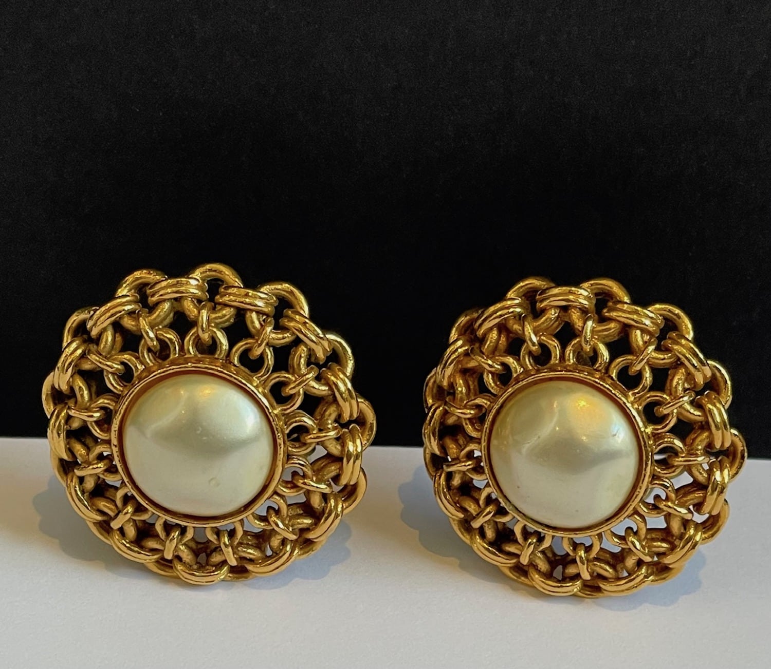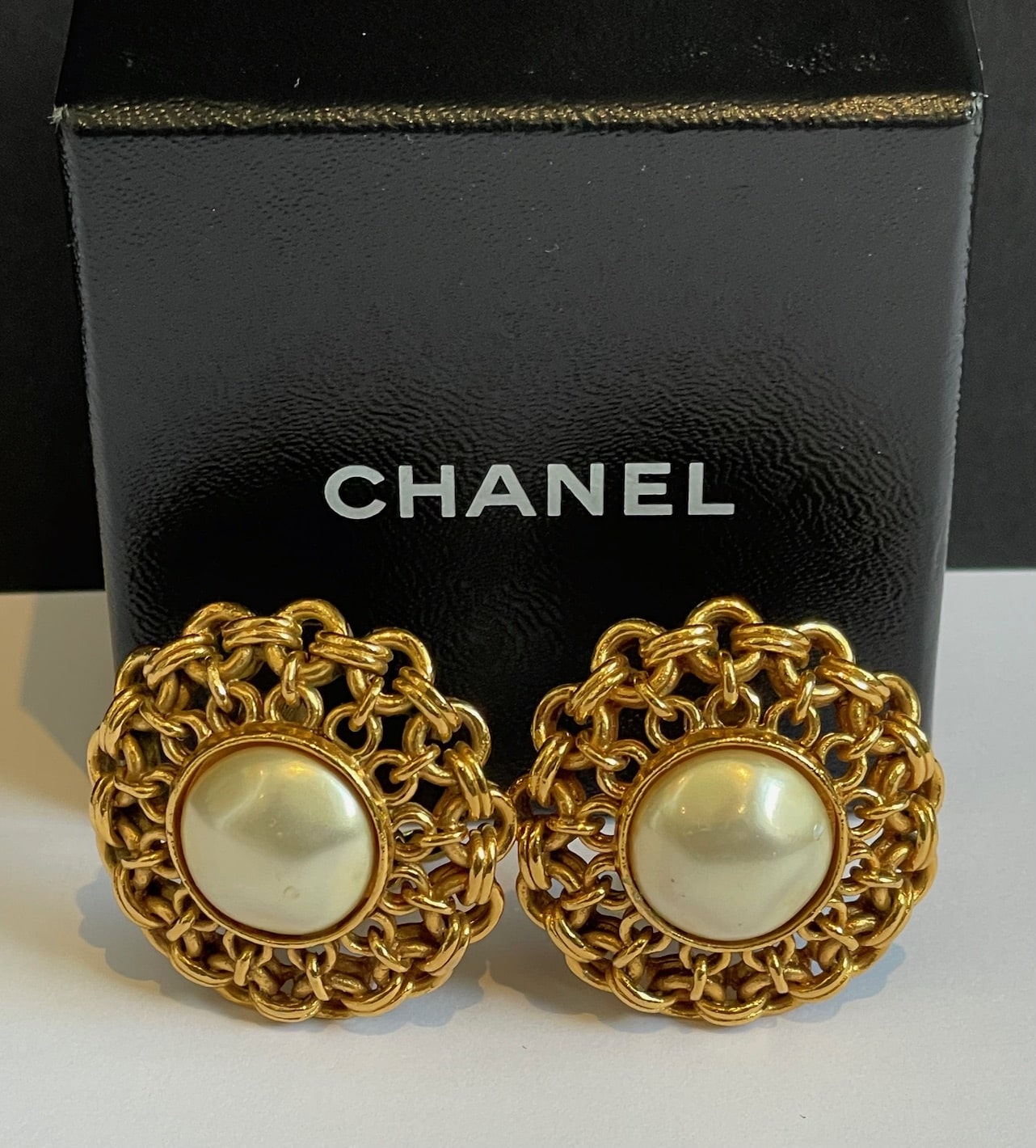 CHANEL 1980s Twisted Link Pearl & Gold Clip Earrings Vintage W/Box