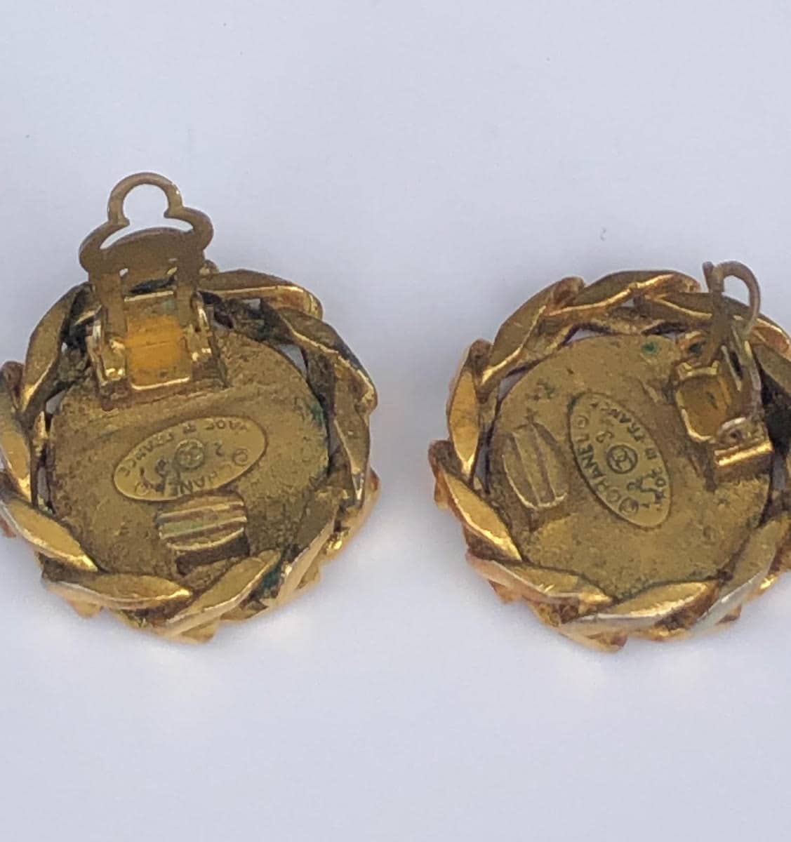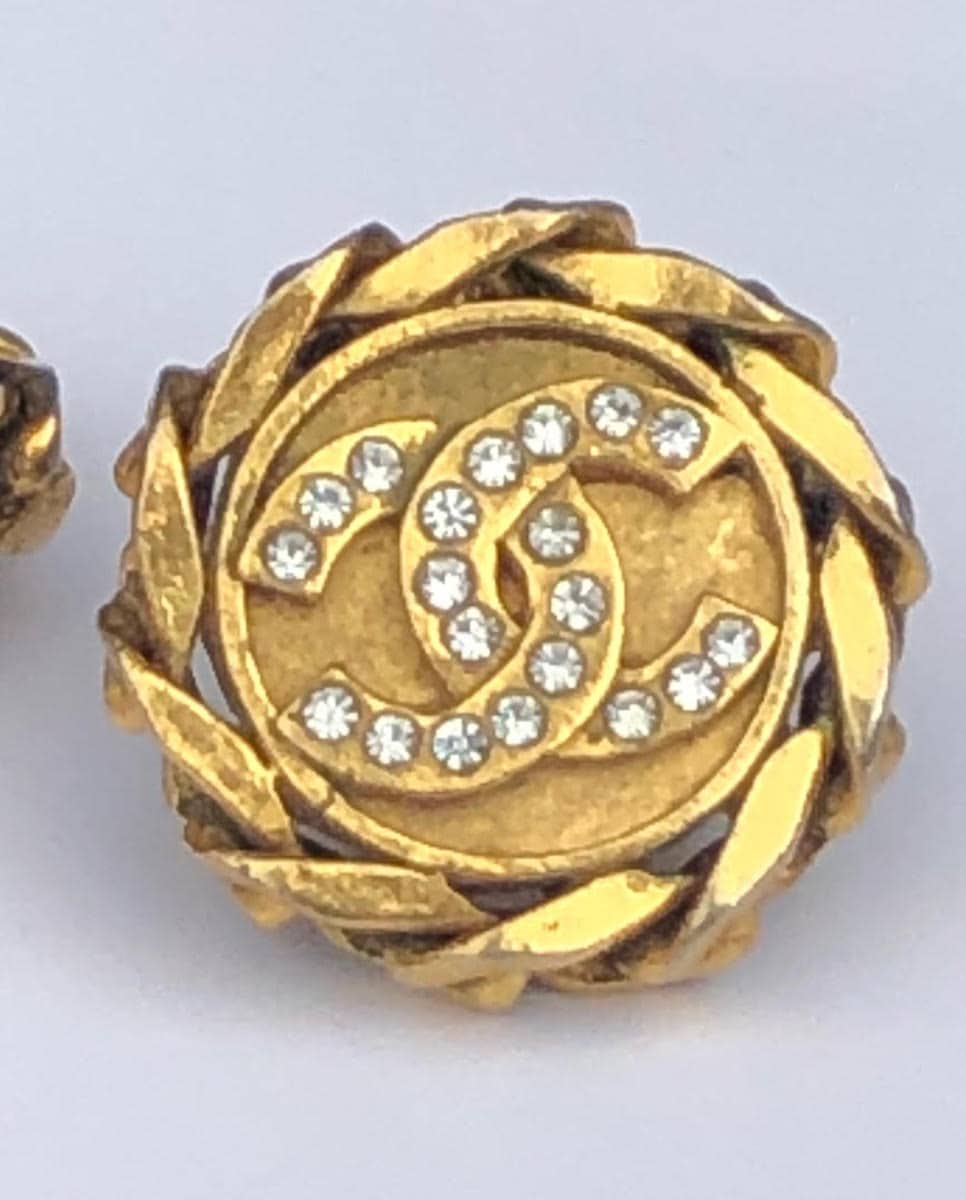 A rare vintage gold tone plated Chanel round chain link with CC logo crystals-rhinestones clip-on earrings. It is a beautiful Chanel CC logo Button motif rhinestone Earring and stamped behind with the collection number 23. ‘Must-Have’ in your wardrobe