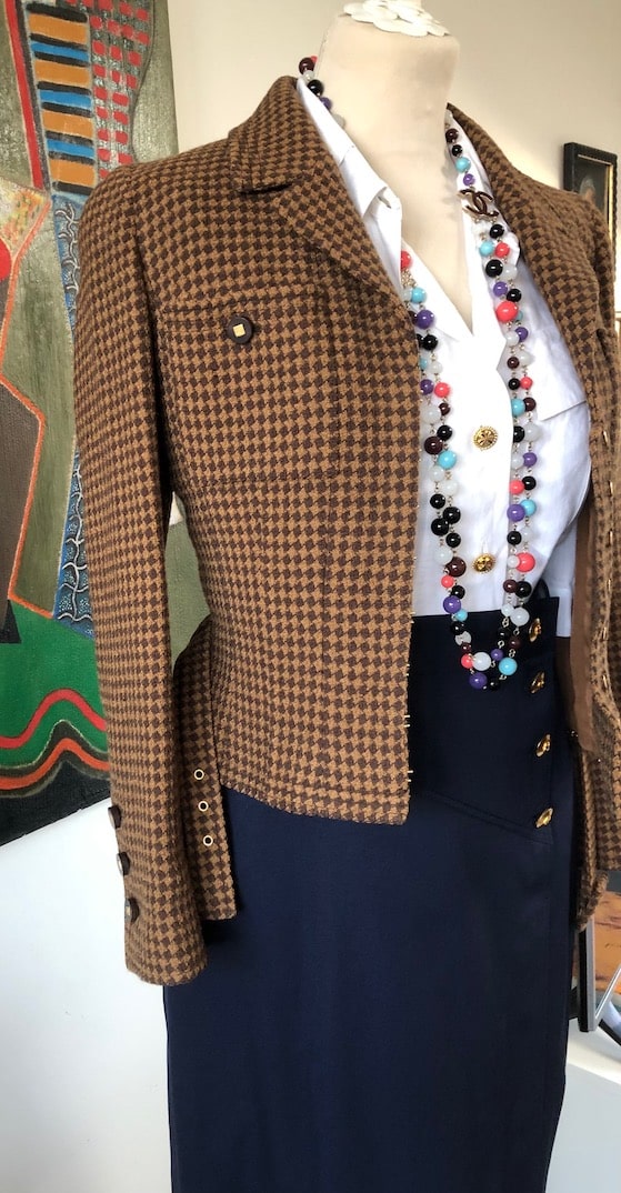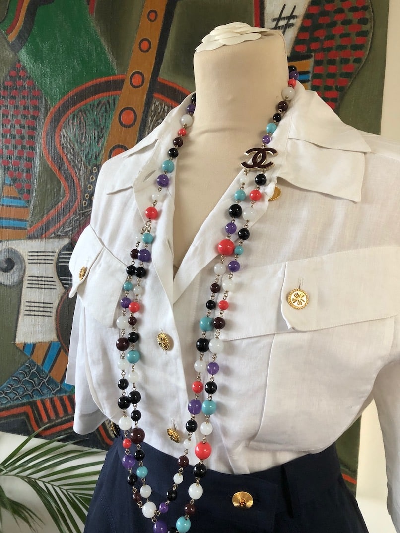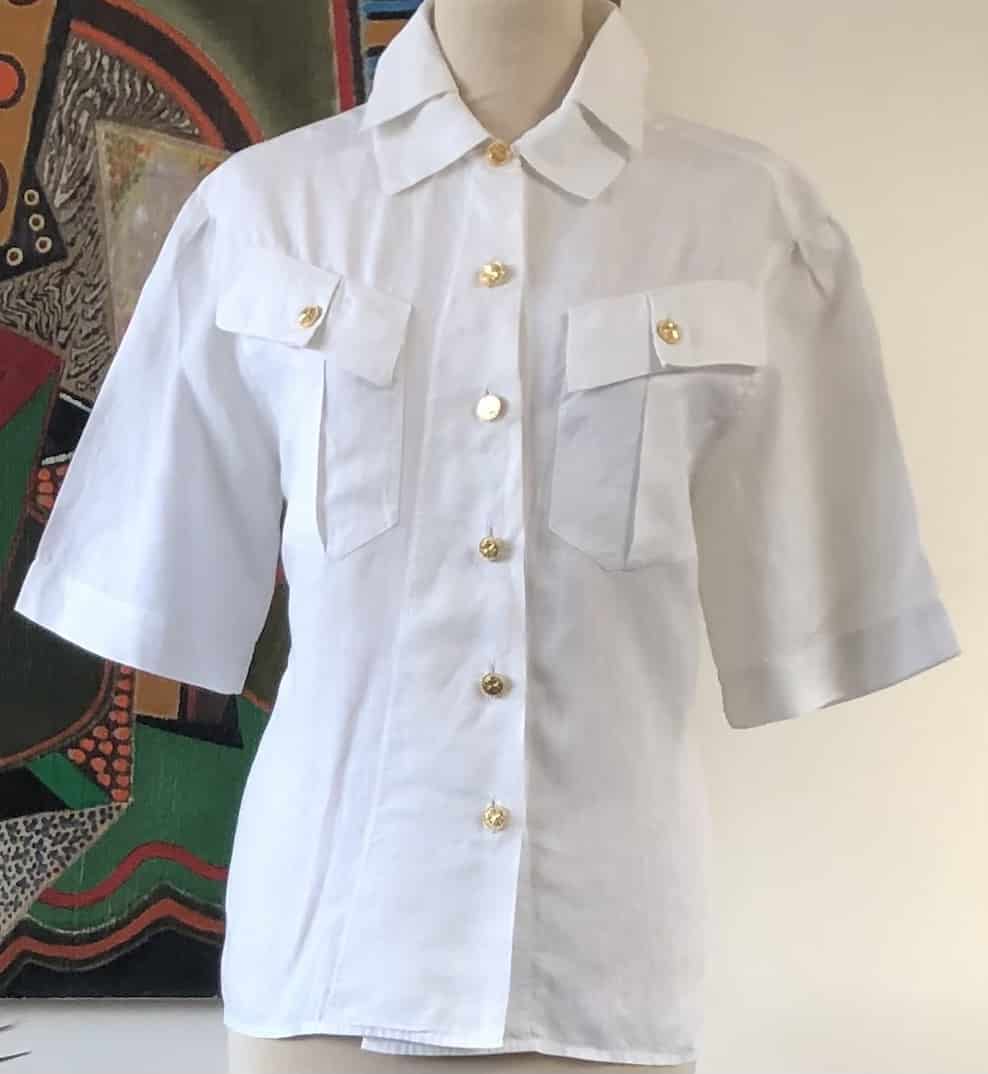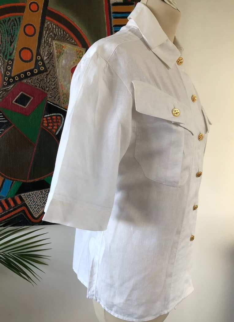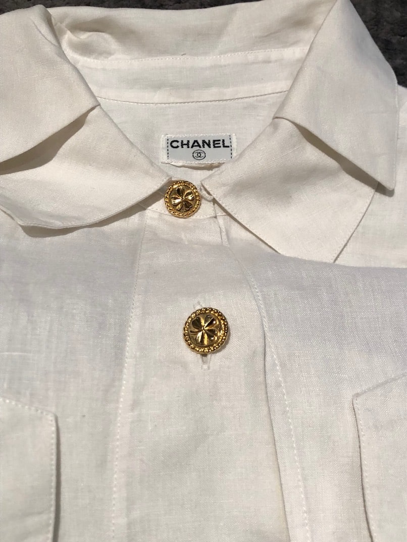 A beautiful Chanel 1990s white linen short sleeves shirt with Chanel gold buttons. A beautiful straight cut with a lovely pleated collar and pockets with six leaf clover gold tone Chanel buttons, in perfect condition. Two chest patch pockets with a gold leaf clover button. Safari summer style shirt. For everyday wear with a skirt, trousers or suit. Style in the photos with a Chanel tweed vintage 80’s skirt , a Chanel vintage 90s CC belt, a Chanel Mademoiselle navy blue classic CC logo skirt , a Chanel vintage tweed jacket (skirt suit), and with a Chanel double strand multi necklace.