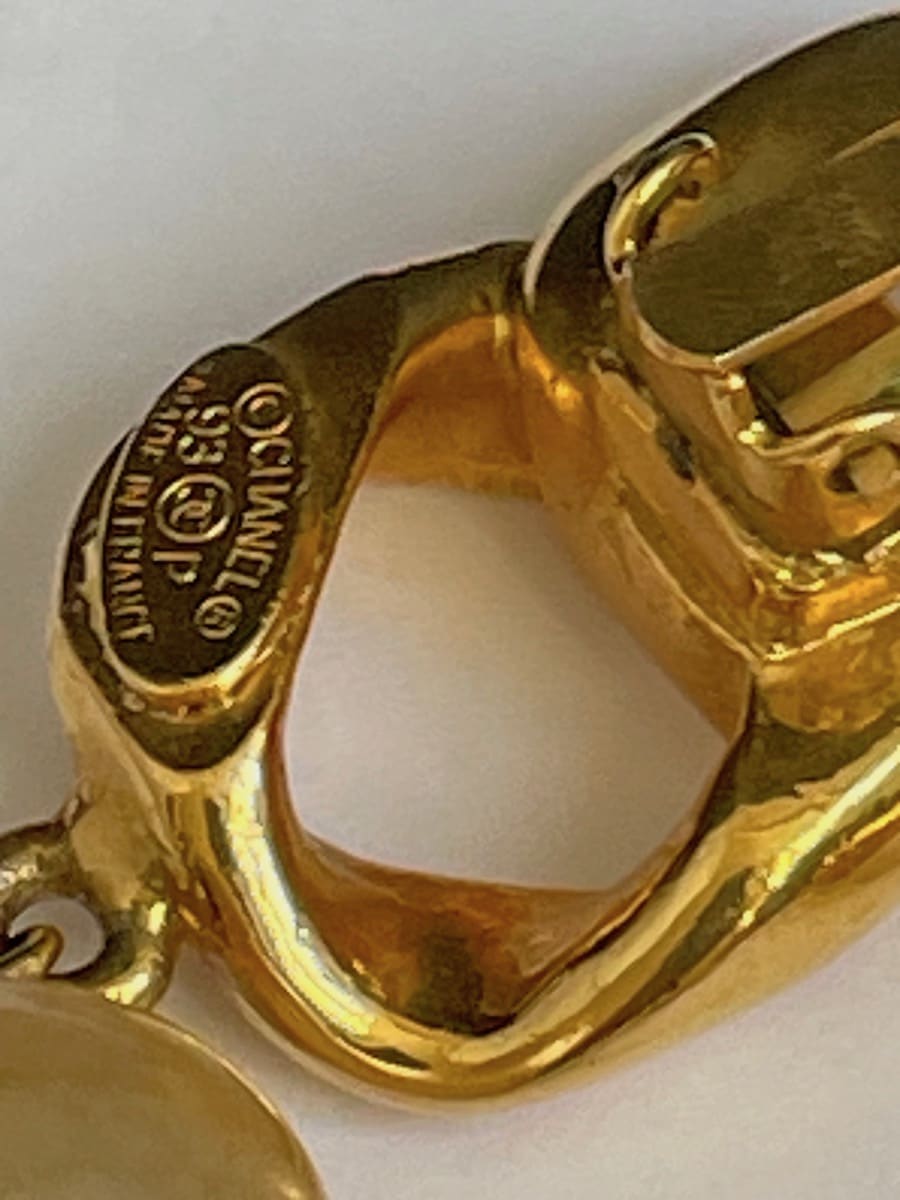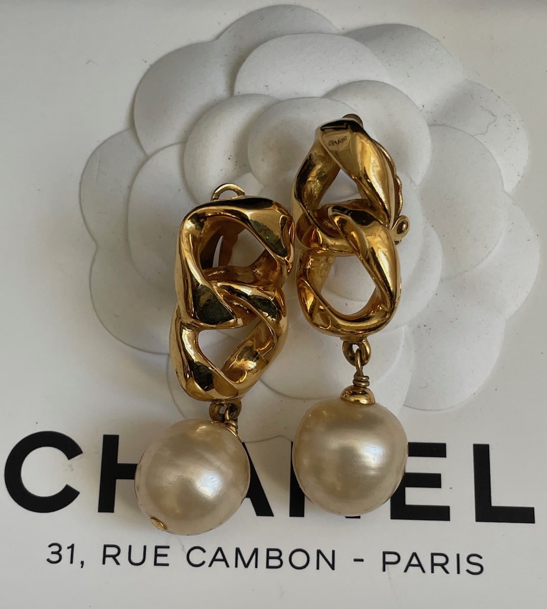 CHANEL 1993 Vintage Pearl Drop Earrings Gold Chain Links W/Box