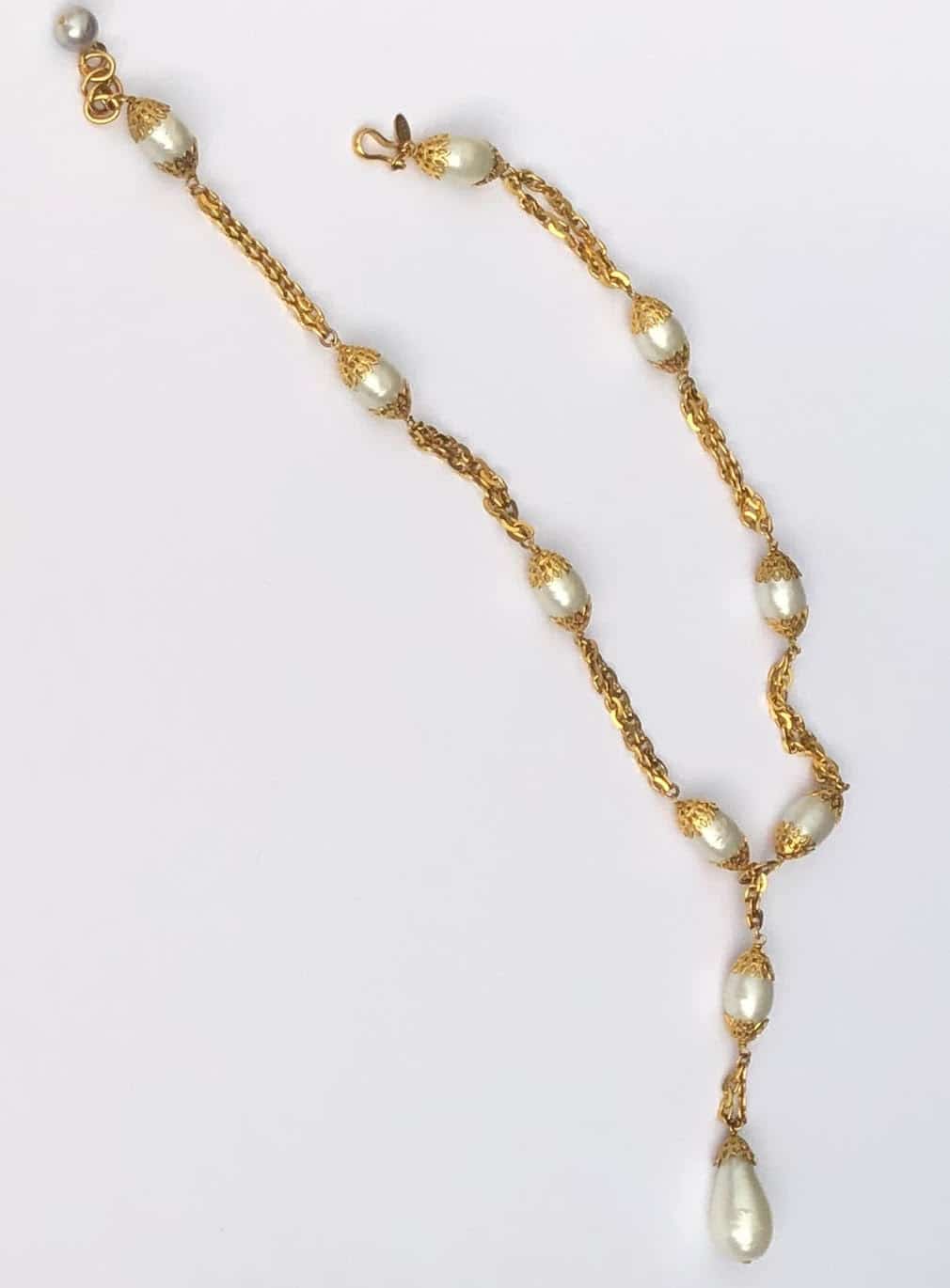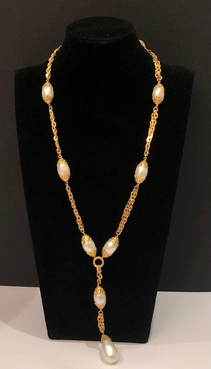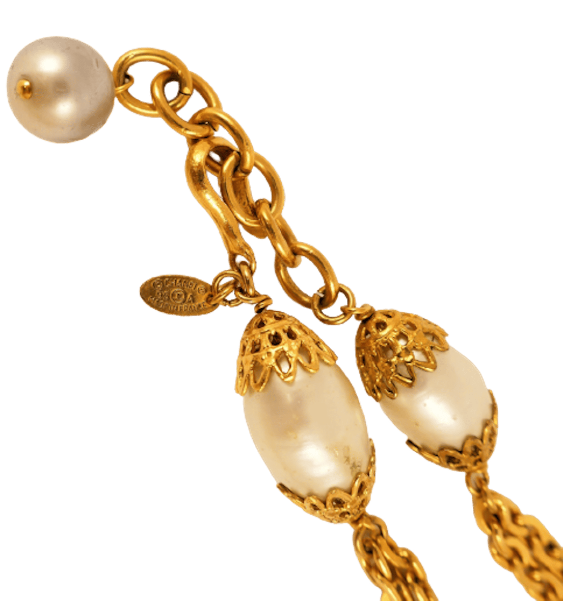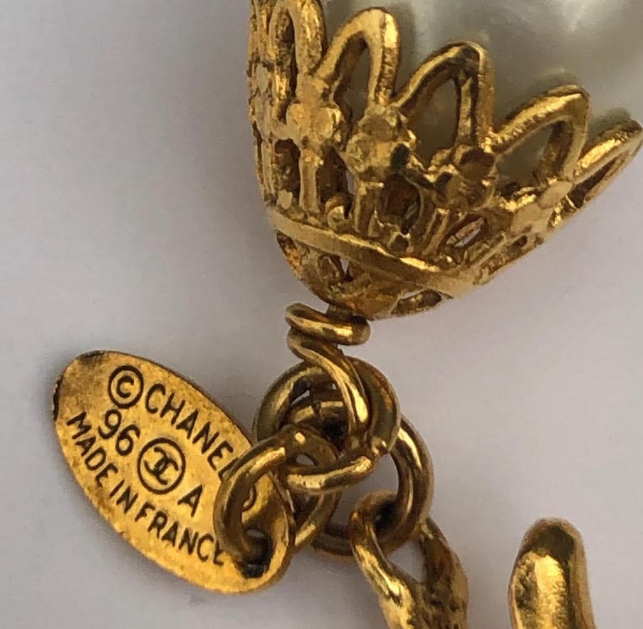 A very rare find, a 1996 Chanel double strand chain link in 18k gold tone metal plated with simulated pearls and a large baroque pearl drop pendant. The pearls (9) pearls are set in 18K French gold plated filigree metalwork. Each pearl is meticulously attached to a double strand chain link. Closing with a hook and a pearl with adjustable round link chain. Signed Chanel on a plate next to the hook closure.