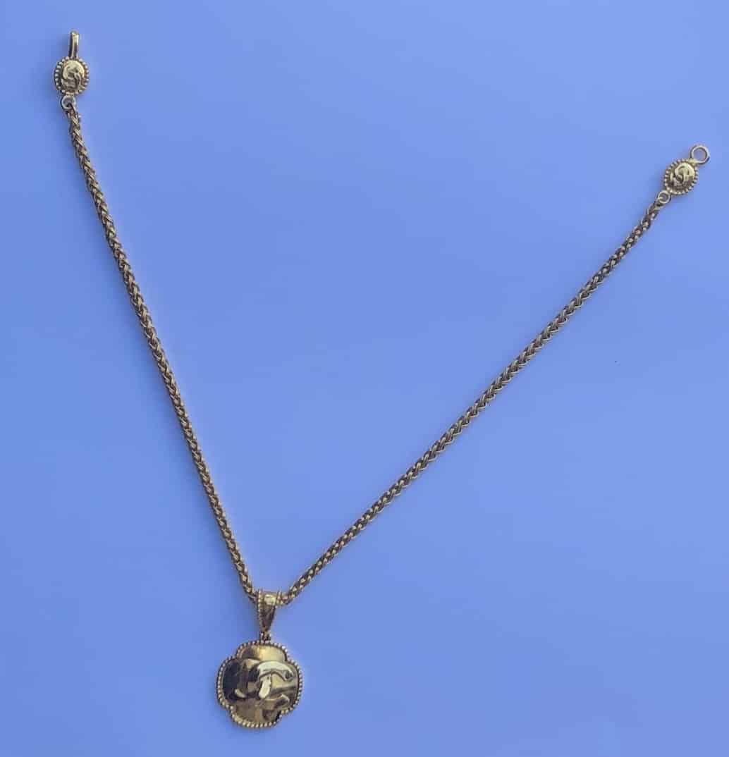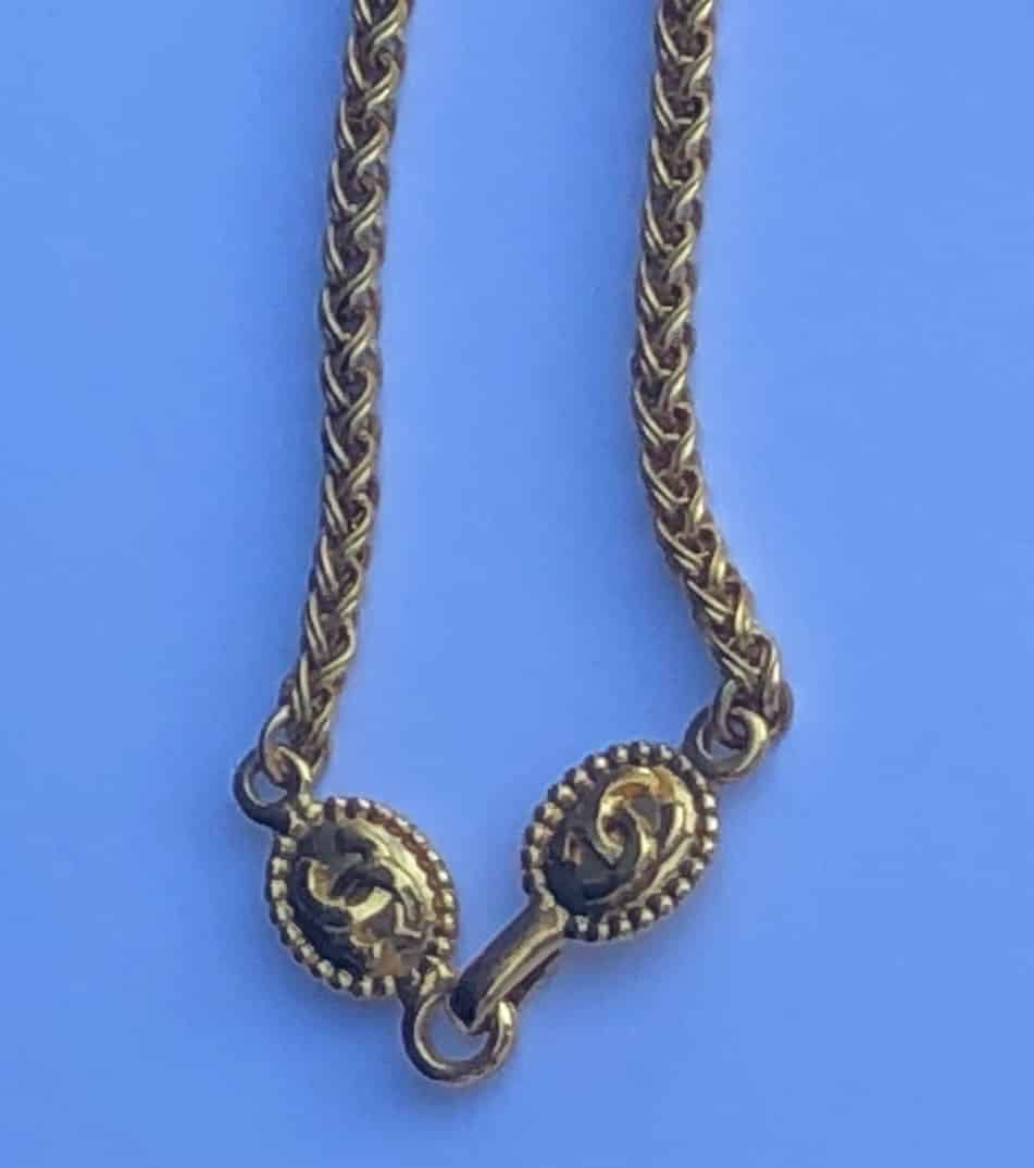 A very rare Chanel chain necklace, dated 1996, sculpted filigree medallion pendant with a large interlocking CC logo. Gold-tone colour 18K gold plated chain wheat link style. Closes with a single hook and two sculpted filigree medallions with CC Logo. It is a fabulous unique, timeless and sophisticated vintage Chanel piece. Stunning condition gold tone 18K gold plated, ‘Must-Have’, a collectible vintage rare piece.