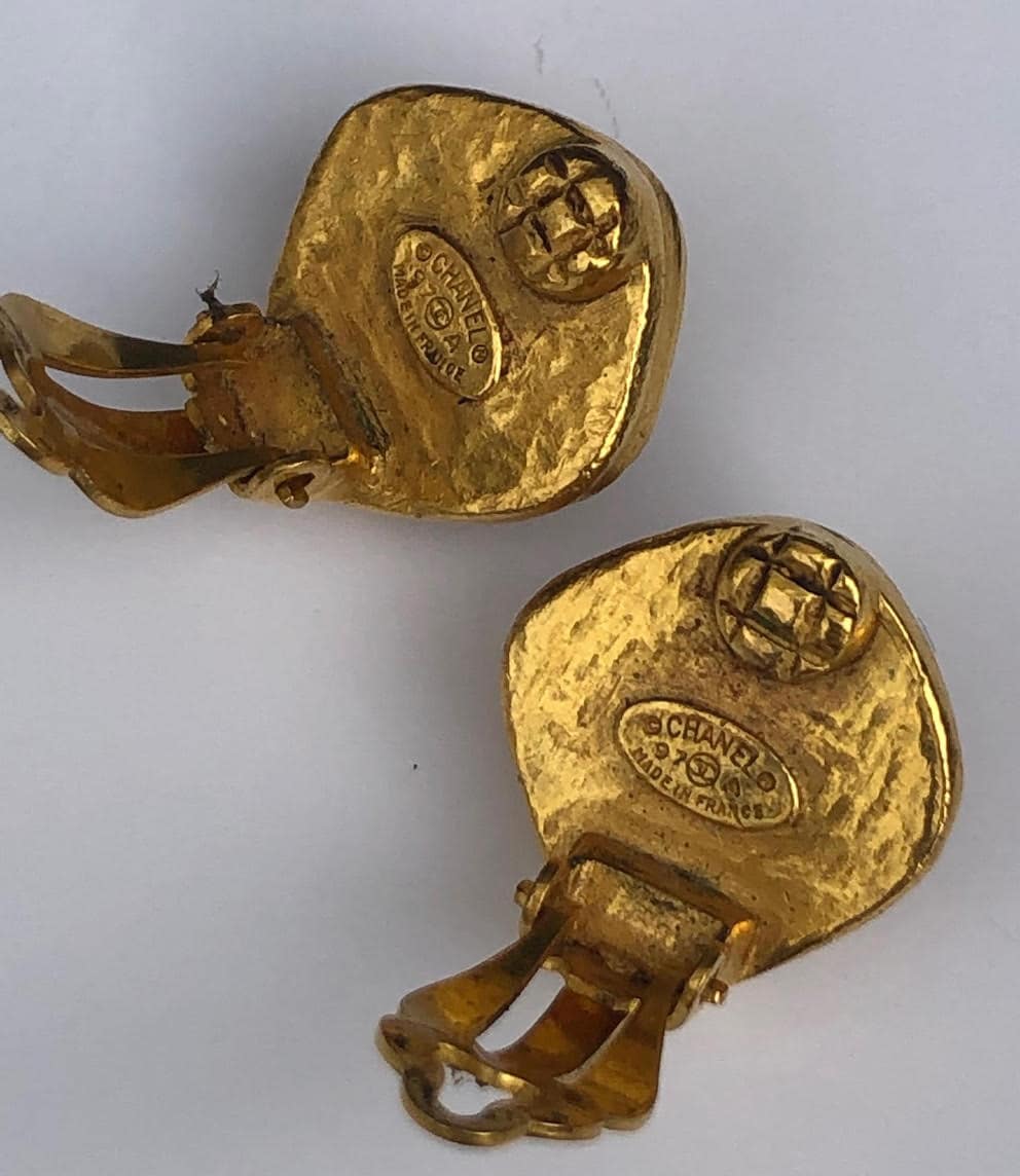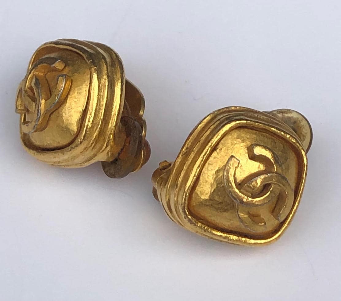 A rare find, a lovely vintage Autumn 1997 Chanel triangle diamond shape CC clip-on earrings in gold tone with interlocking CC logo. Signed behind on a plate.