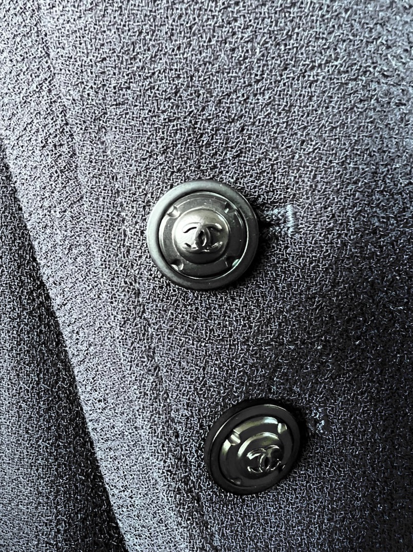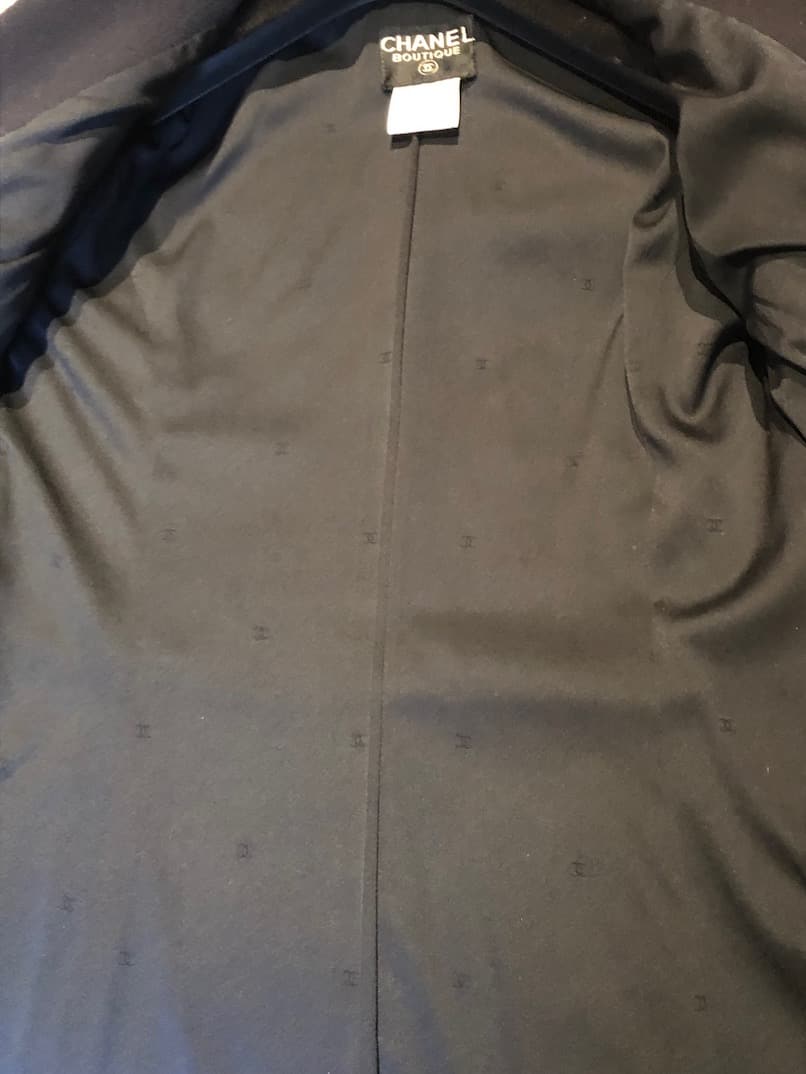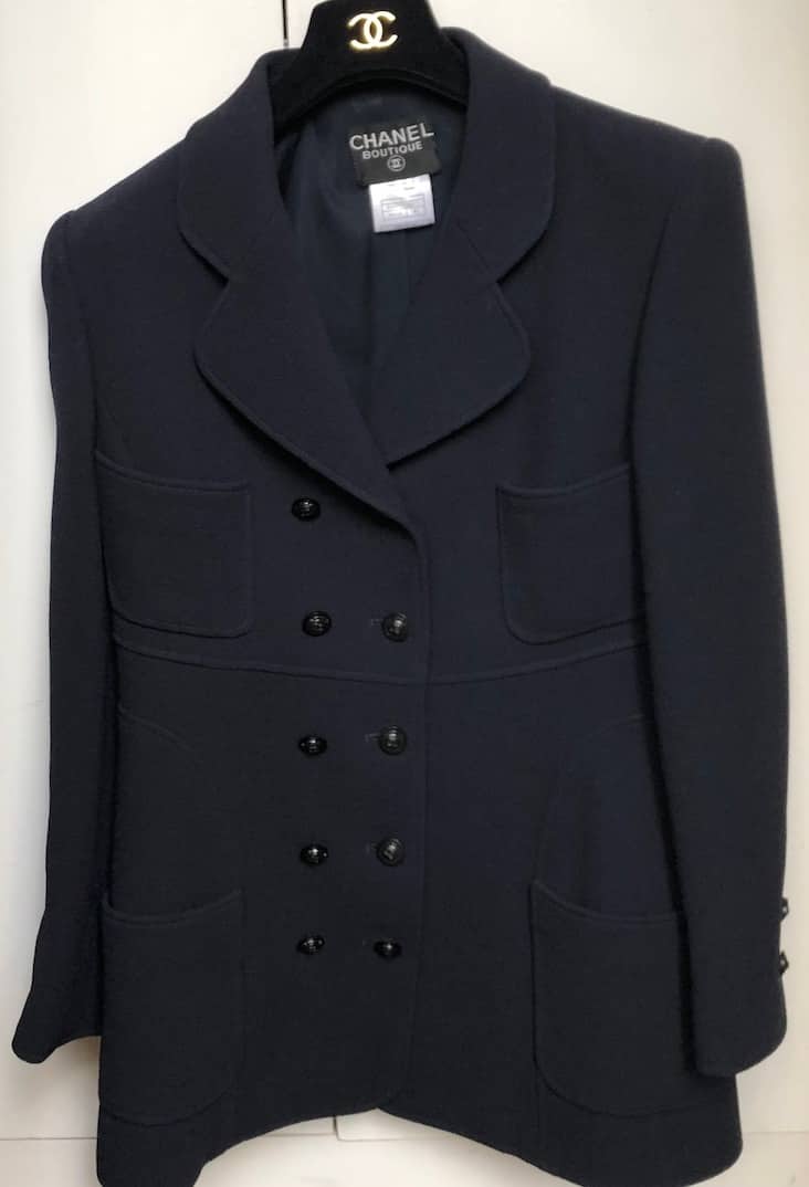 A classic, elegant Chanel double-breasted jacket from Autumn 1997, in excellent condition. Handcrafted in a cotton-wool blend in a deep navy blue shade (very close to black). Large pockets, long sleeves, closes with ten CC logo black buttons and two cc logo buttons on each of the sleeves. Lined with silk CC logo fabric, surrounded with a Chanel chain at the rear. Label size 42 (it’s sized small therefore more close to 38-40).