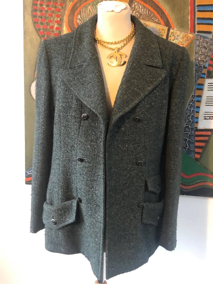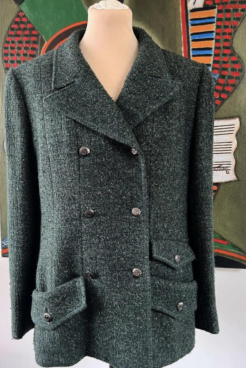 A classic rare vintage Chanel green, wool bouclé jacket from Autumn 1997 collection detailed with CC-logo embossed dark silver metal CC buttons and finished with a CC logo silk lining. Featuring a double breasted notched lapel jacket with three front large pockets with a CC logo flower buttons, six beautiful dark silver metal CC logo flower buttons fastening completed with a chain hem. Long sleeves with slit cut with three CC logo flower buttons on each sleeves. A double pleat behind. This jacket is fully lined with silk fabric CC logo. The label size is 44 French, more close to a 40. Style in the photos with a CHANEL 1994 CC Pendant Chain Necklace Vintage Gold Quilted for sale separately under Jewellery, Necklaces.