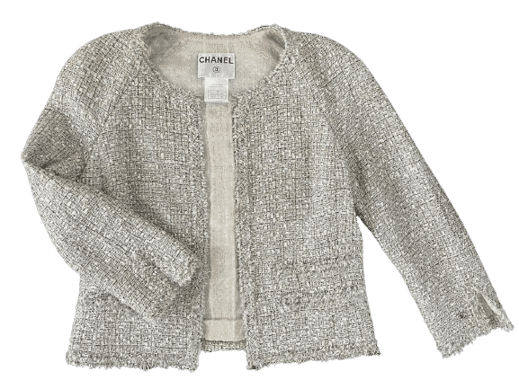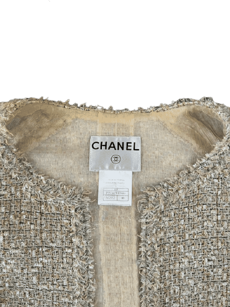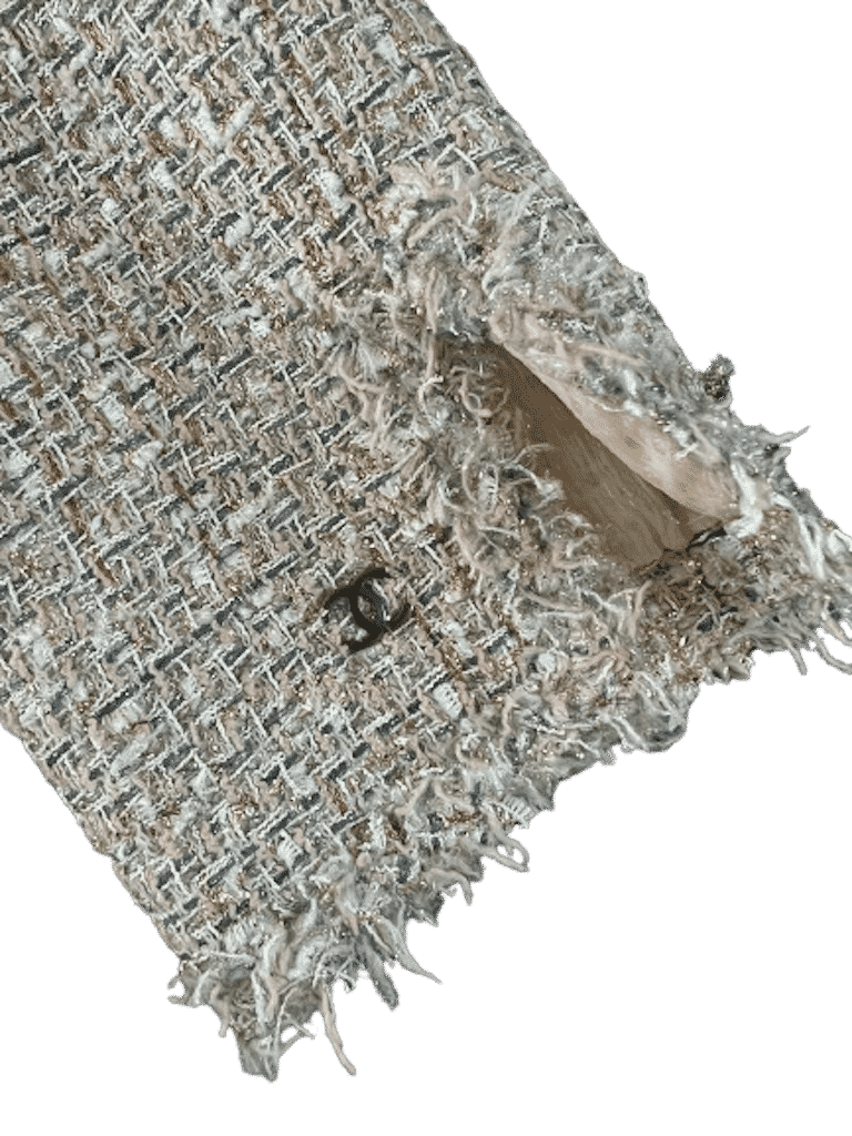 A lovely flirty silhouette Chanel spring 2005 tweed short vest jacket sparkling multicoloured fabric in silver, gold, bronze and pink metallic threads wool blend. Full length front open vent. Long sleeves with a slit, a CC logo on one of the sleeve. Two decorative sewn pockets on each side. Fully lined in silk with crystal diamonds effect. Interior finish with lower metallic gold chain. Label 40 but nowadays it is considered more like a 38.