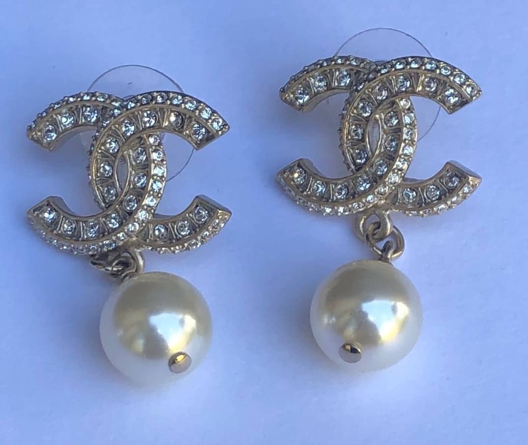 A beautiful classic gold-tone Chanel CC strass earrings featuring white faux pearl drops, strass-diamente details with pierce ears back closures. These drops became one of Chanel’s main signatures.