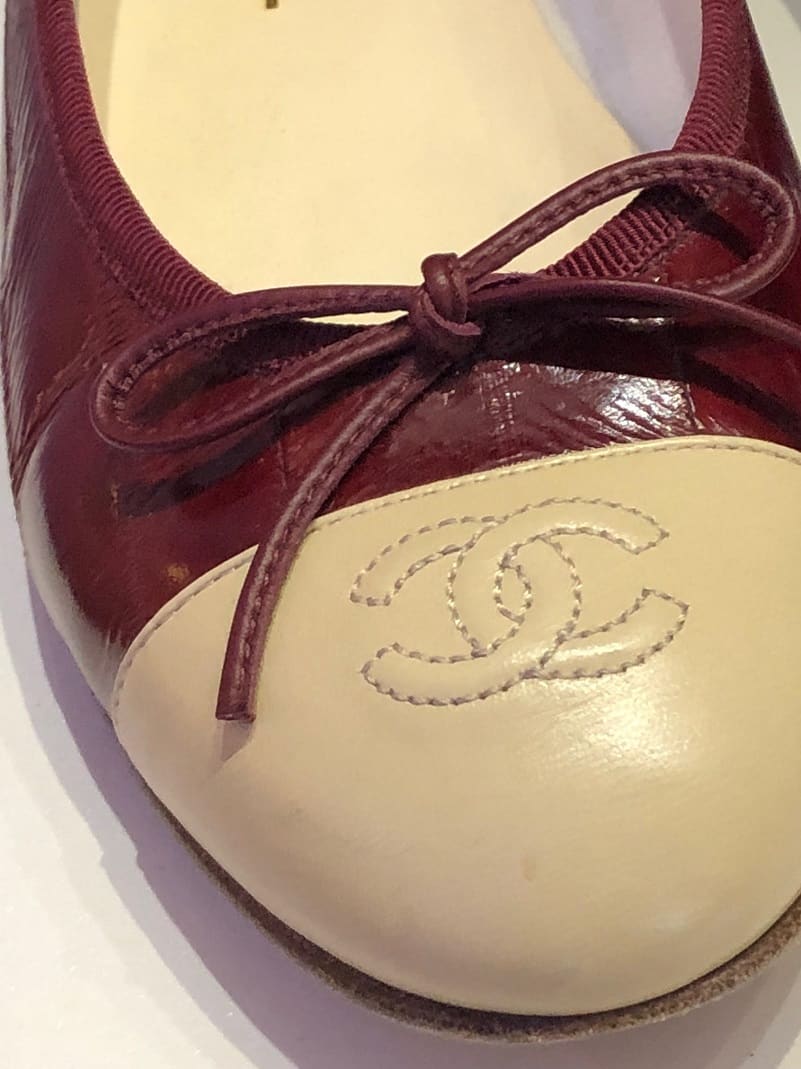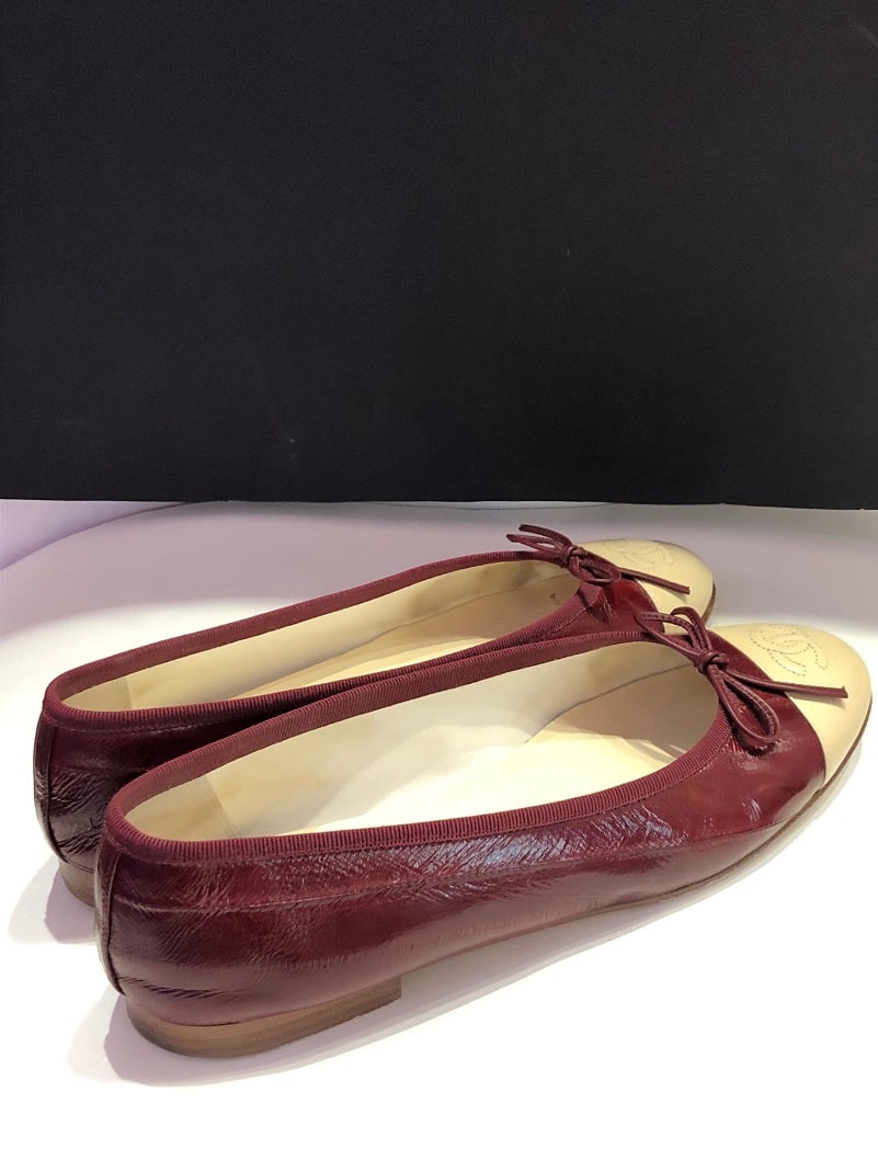 A very rare Chanel ballerina flats shoes, size 39.5 are designed in two-toned in beige and in Burgundy-Red patent stitching calfskin leather featuring a Burgundy-Red leather bow detail and ‘CC’ stitched logo on the cap toe. Collection 2018, the colour combination is very beautiful for everyday use.