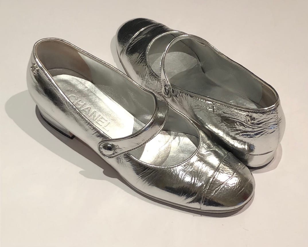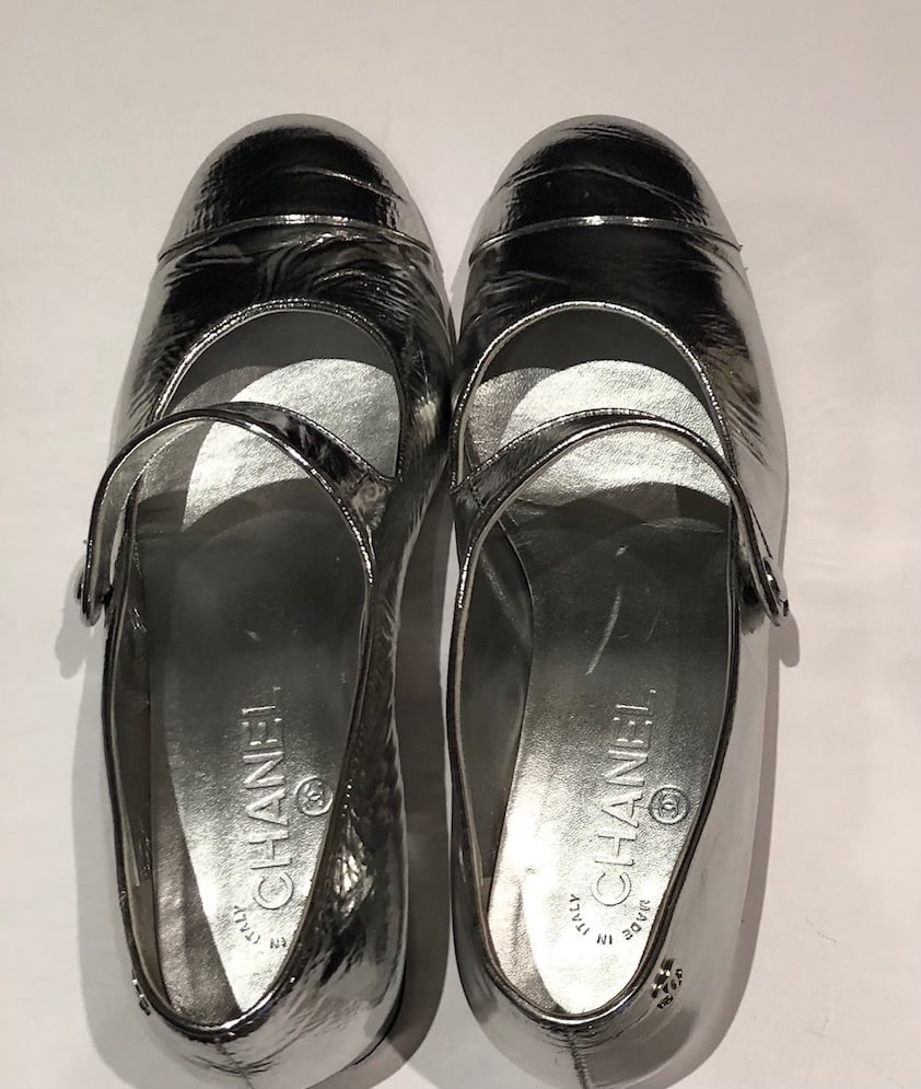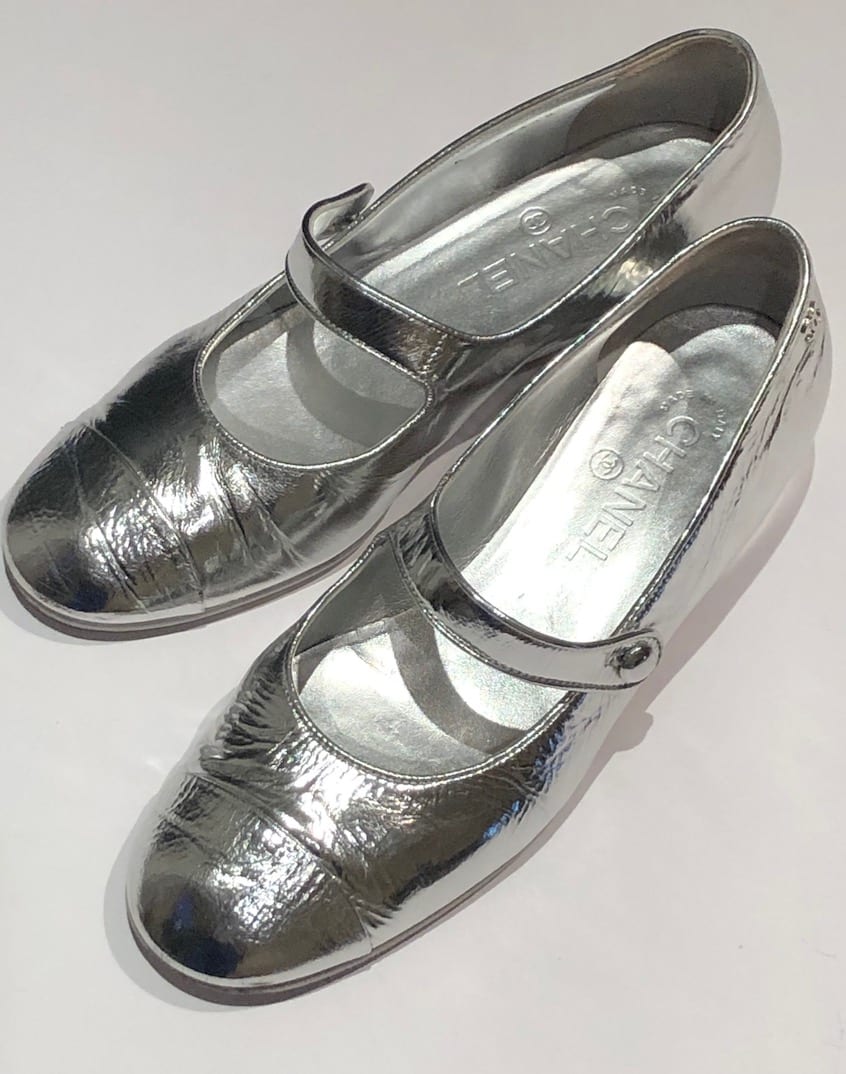 A very rare Silver Chanel ballerina flats shoes, size 38.5 in very good condition complete with box. These beautiful stylish ballerina is handcrafted in laminated calfskin leather, crossover button strap with cap toe and CC logo on each shoe side. A 3 cm square heels for cosy comfort and elegance. Rare, Must-Have!