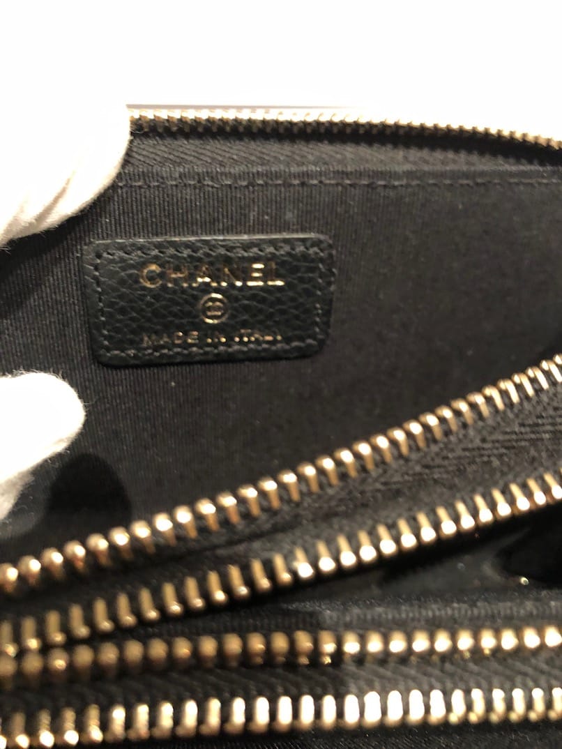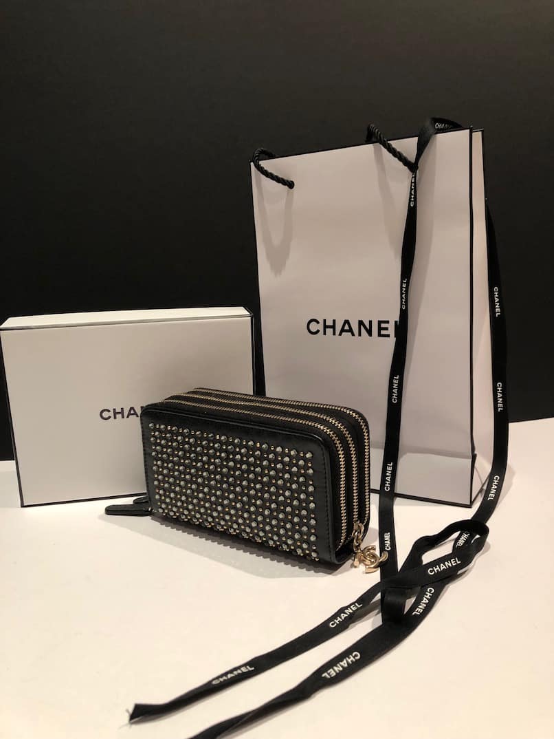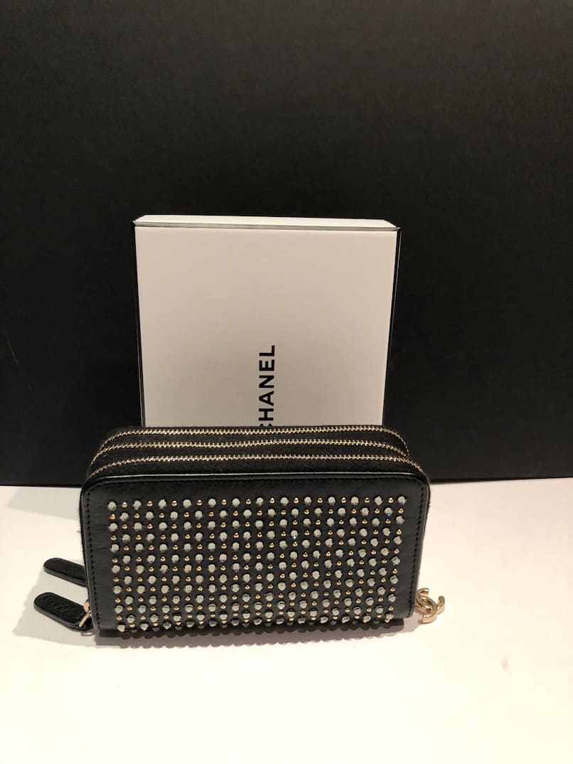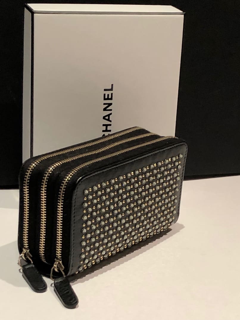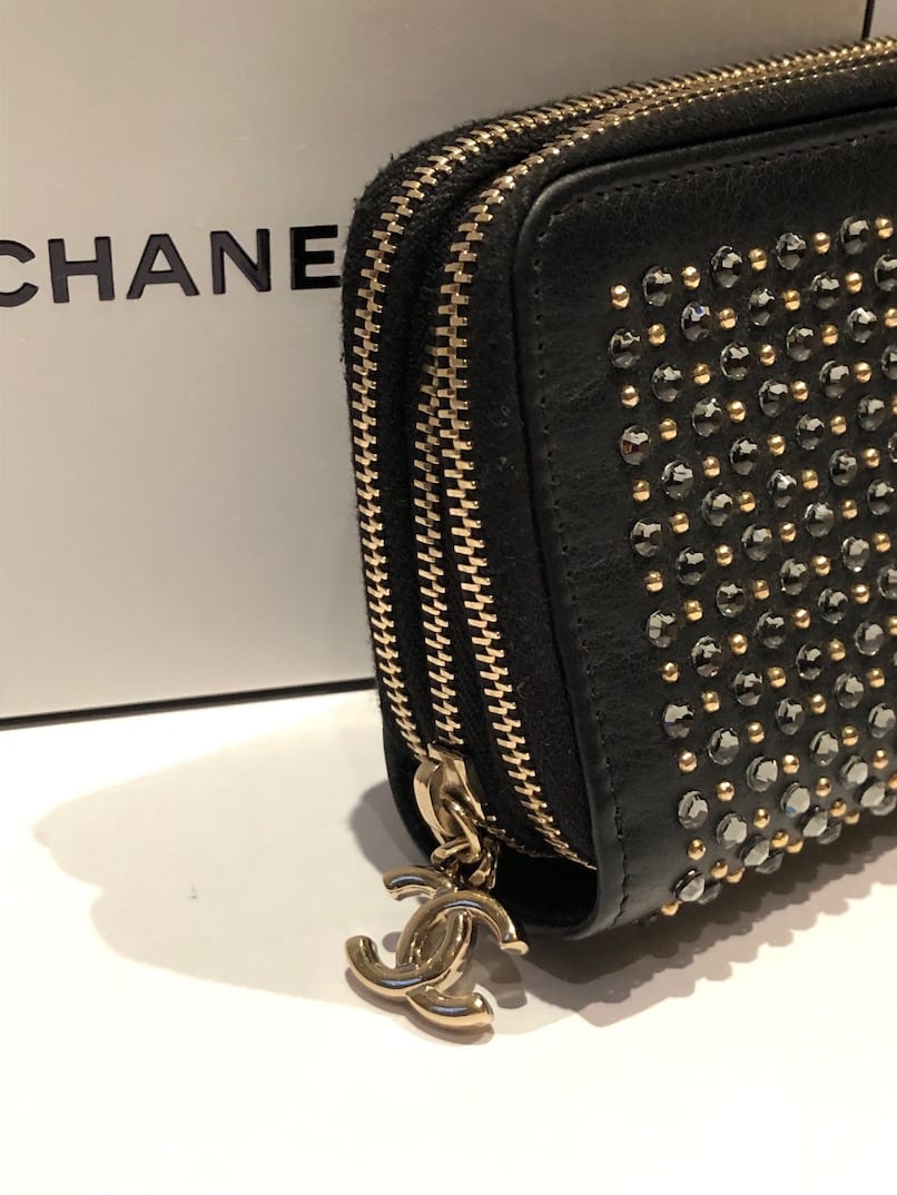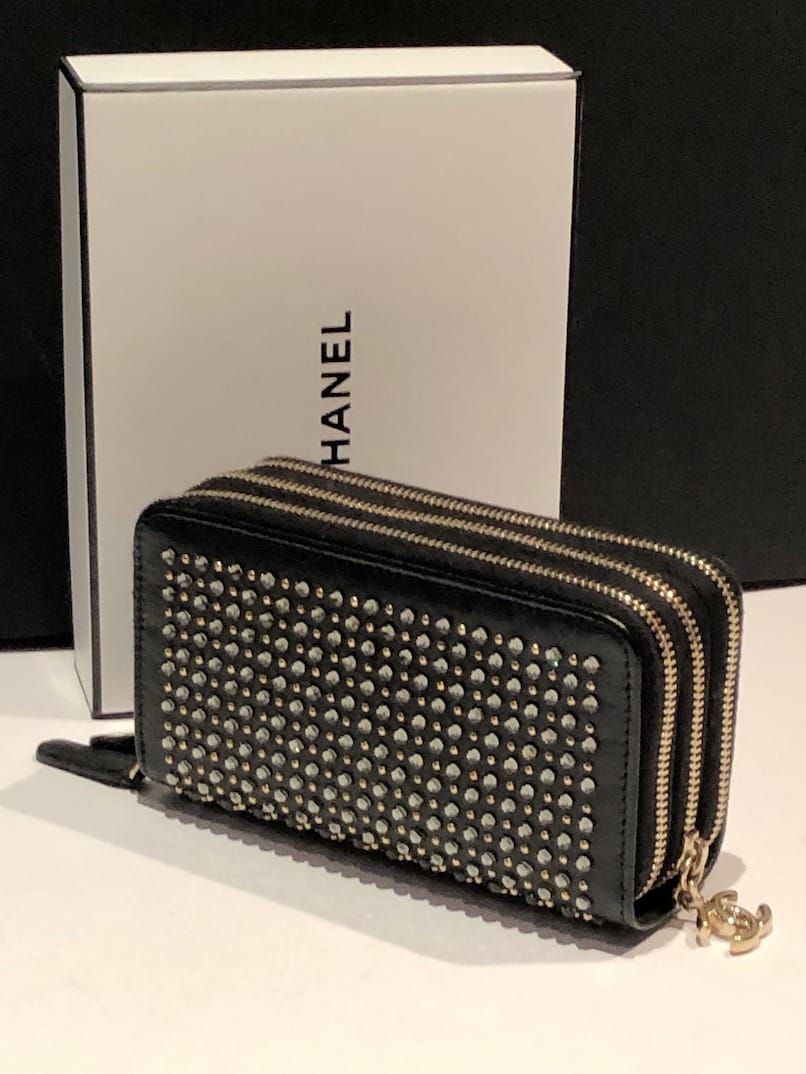 An outstanding CHANEL leather wallet with Swarovski crystals from 2014. Could be carried out as a clutch (the iPhone 8 fits in this wallet). This amazing wallet is handcrafted in black leather embellished with Swarovski crystals. Three compartments with triple zip, gold tone hardware, two side pockets close with a pull out black leather tag and the middle pocket closes with a pull out CC interlaced logo in gold tone. The interior is lined with grosgrain fabric. Lots of space for cards, coins, lipstick. Really beautiful, Must-Have!