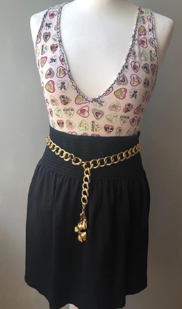 A lovely evening Chanel outfit skirt and top. A beautiful mini skirt, handcrafted in silk incorporated with a large elastic belt, pleats and a CC logo at the buttom. A Black transparent lace top with thrilled, closing in front with two thin strap-ribbons. For better comfort the logo tag label in the transparent top has been removed. Styled with a vintage Chanel belt, a Chanel Heart V-Neck T-Shirt.