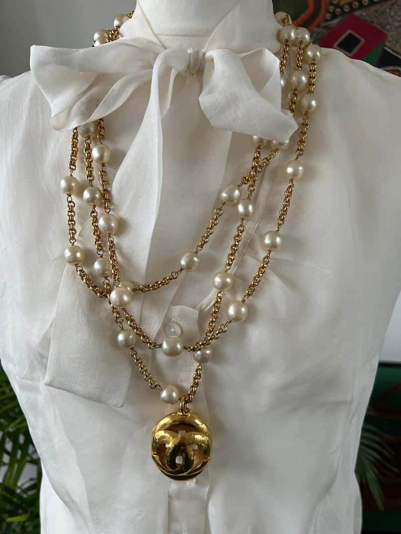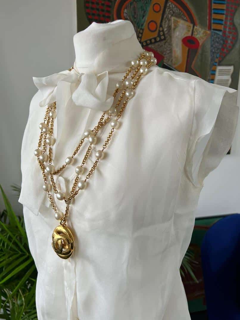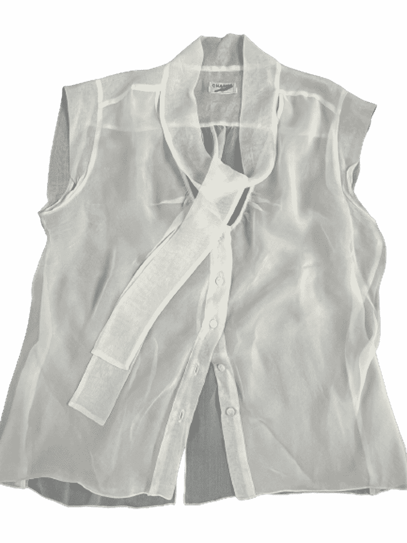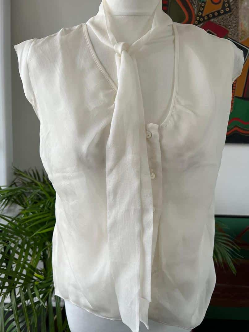 A very lovely elegant Chanel sleeveless silk blouse with bow and with five Chanel Paris Mother of Pearl buttons. The Chanel vintage pearl necklace styled in the photos are for sale separately under Jewellery, Necklace.
