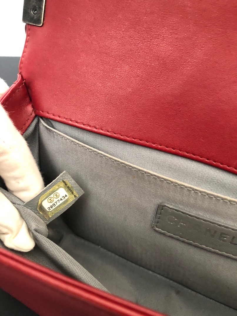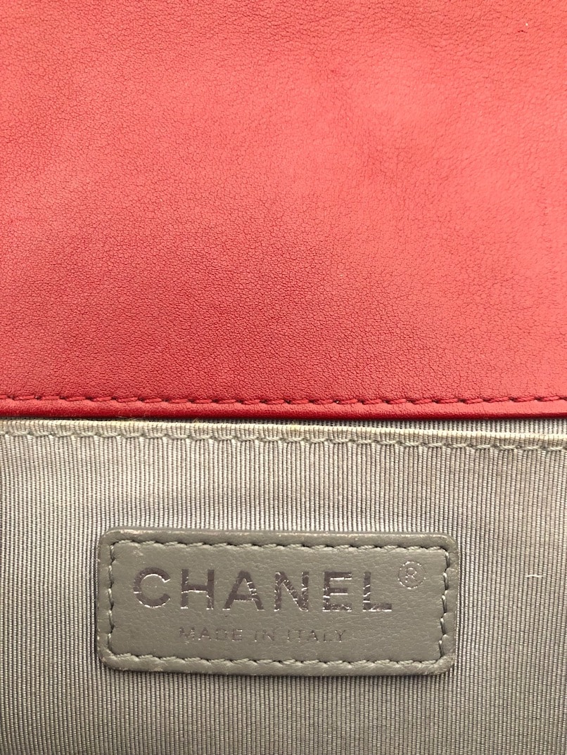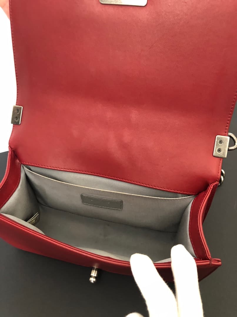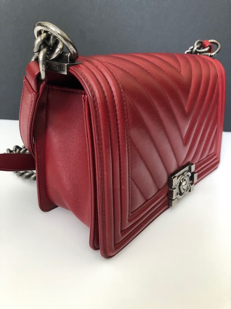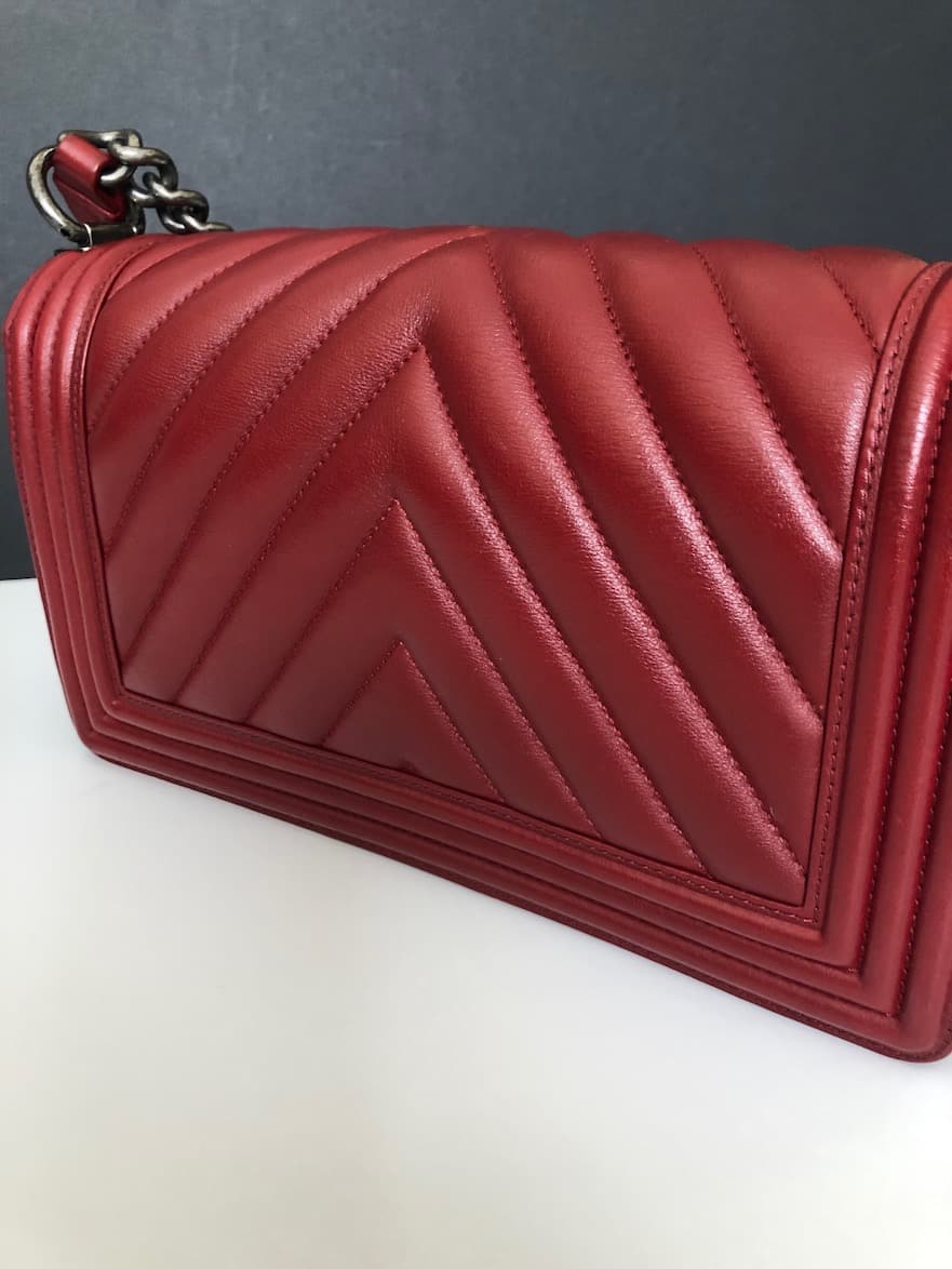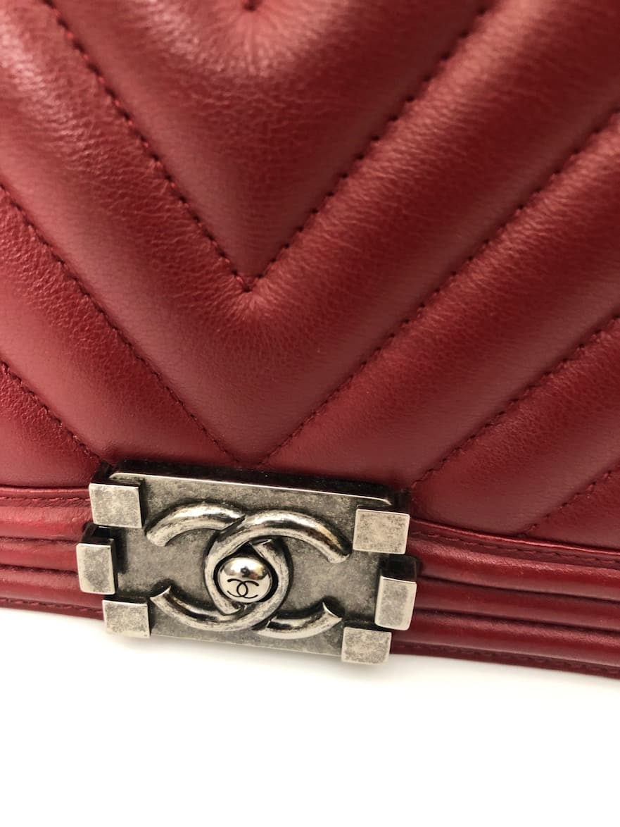 Chanel Boy shoulder flap bag in burgundy, dark red, medium size handbag. Handcrafted in luxurious chevron-stitched lambskin leather, in aged ruthenium hardware. The interior is lined with gros grain fabric with one large slit pocket. Aged Ruthenium silver tone hardware with Boy CC push twist-lock closure on the front. Chunky chain-link shoulder strap mixed with leather strap. Can be used single or crossbody.