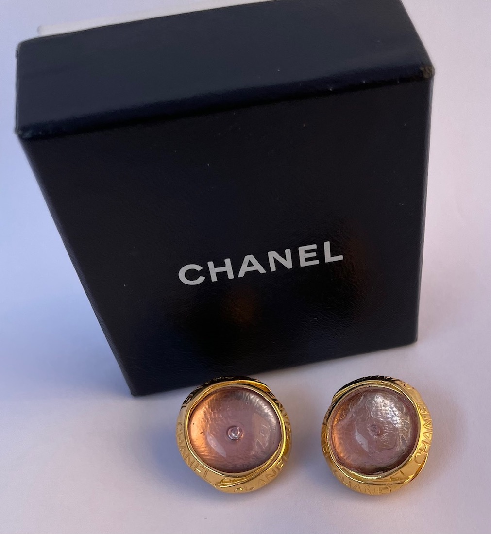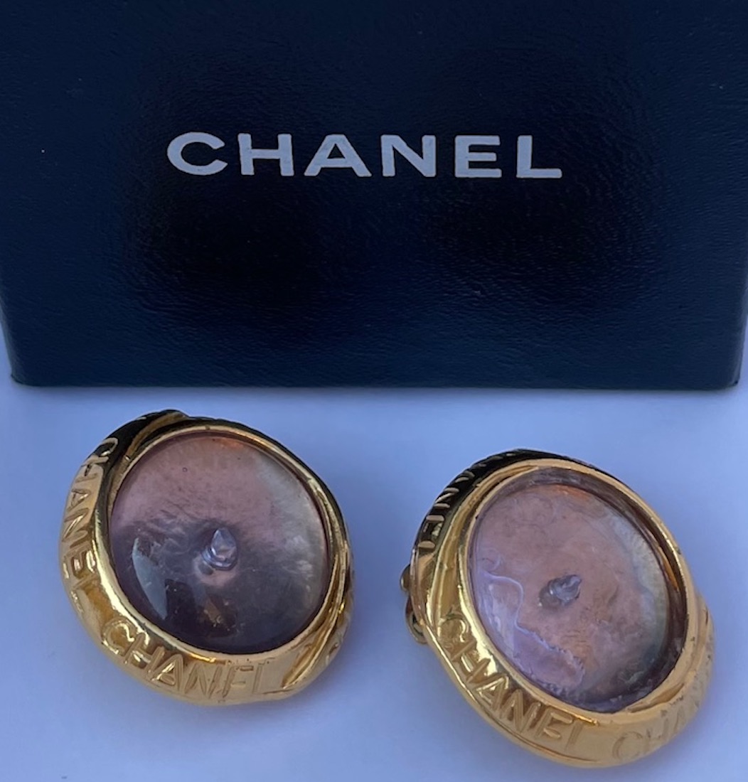 CHANEL By Goossens Cabochons Earrings Gold Tone W/Chanel Letters 1996