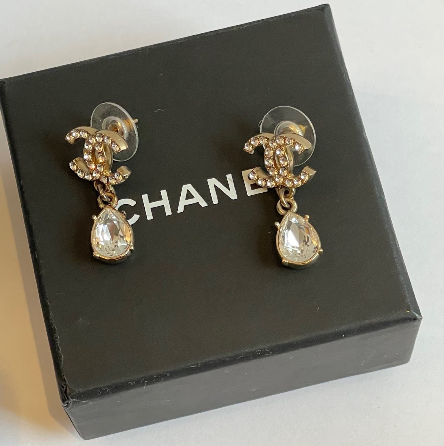 CHANEL CC Logo Crystals Tear Drop Dangle Earrings Gold