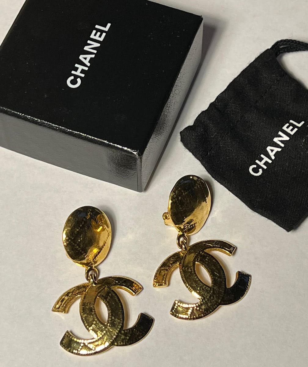 CHANEL CC Logo Gold Metal Earrings Evening Dangle Drop Large Circa 1994