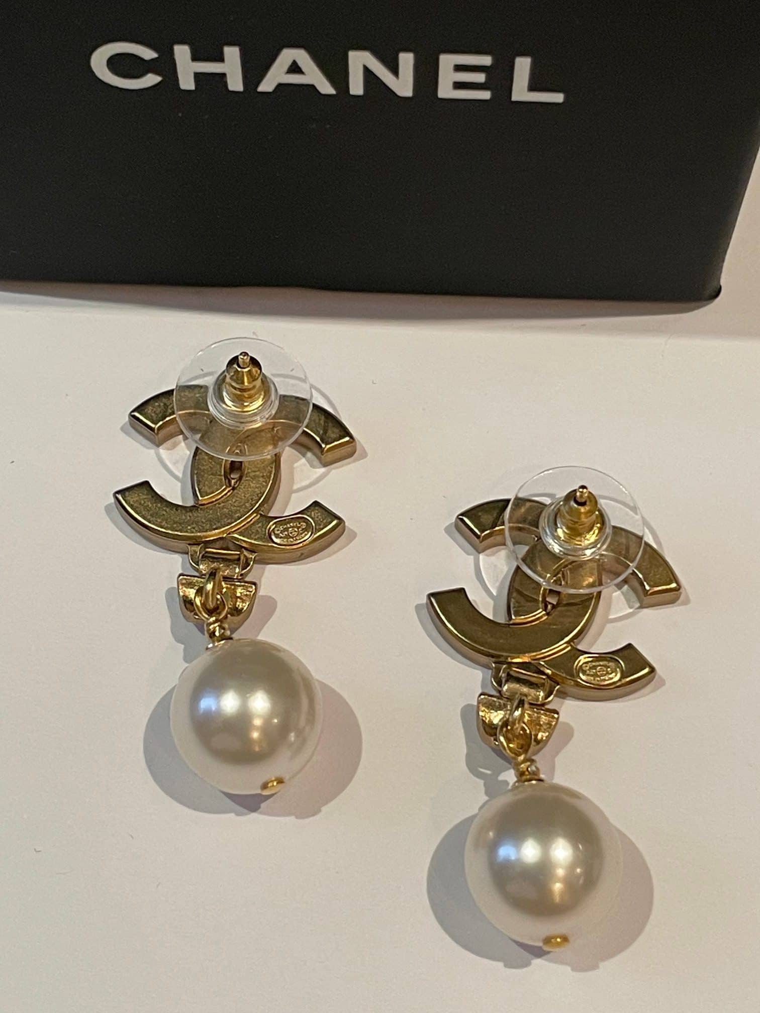 CHANEL CC Logo Pearl & Crystals Drop Pendant Earrings 2021 W/Box