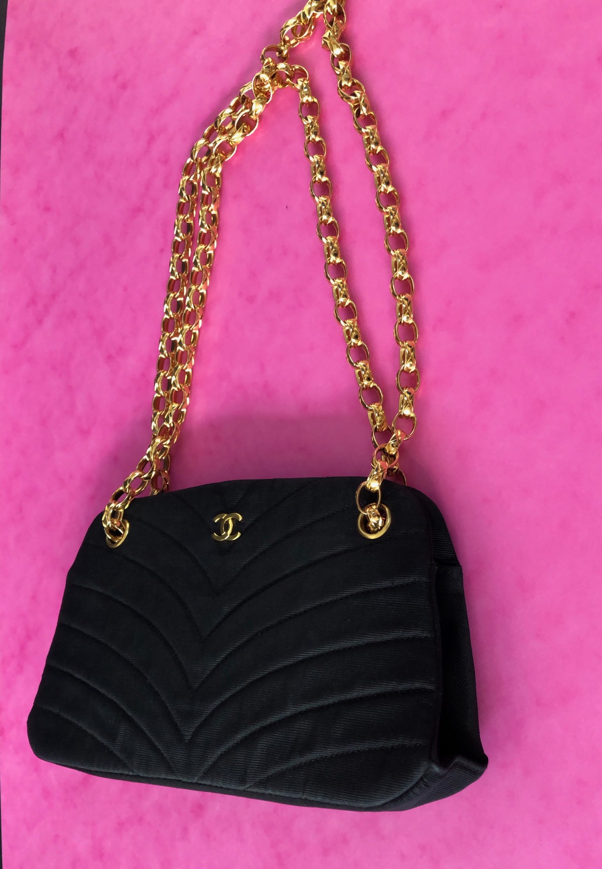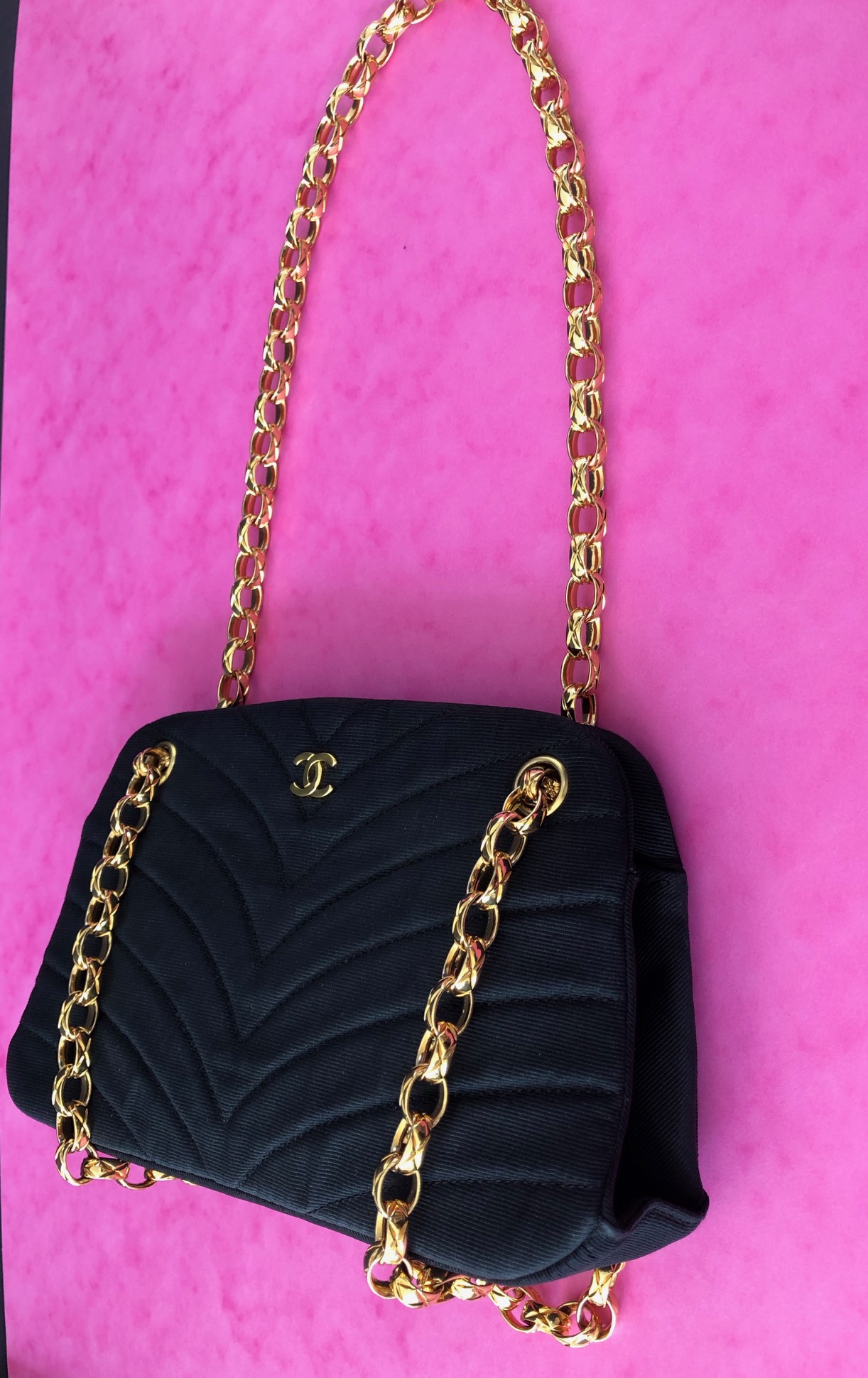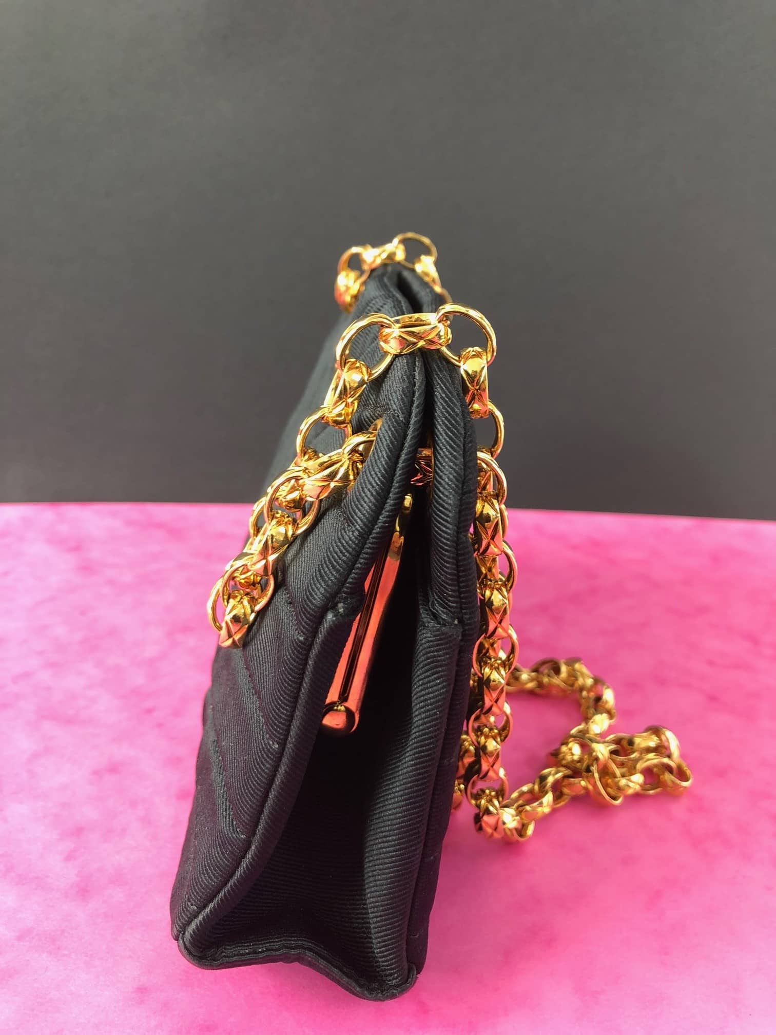 Day and evening 2 in 1 vintage clutch shoulder purse bag. Black chevron cloth, wallet clasp, 2 interior pocket. beautiful gold tone metal chain handles, a beautiful Chanel twist stud CC logo, closure with gold twist buttons. It can be worn /carried higher using the double chain or carried / worn lower using the single chain. A precious and a stunning unique, rare vintage piece dated 1989-1990s.