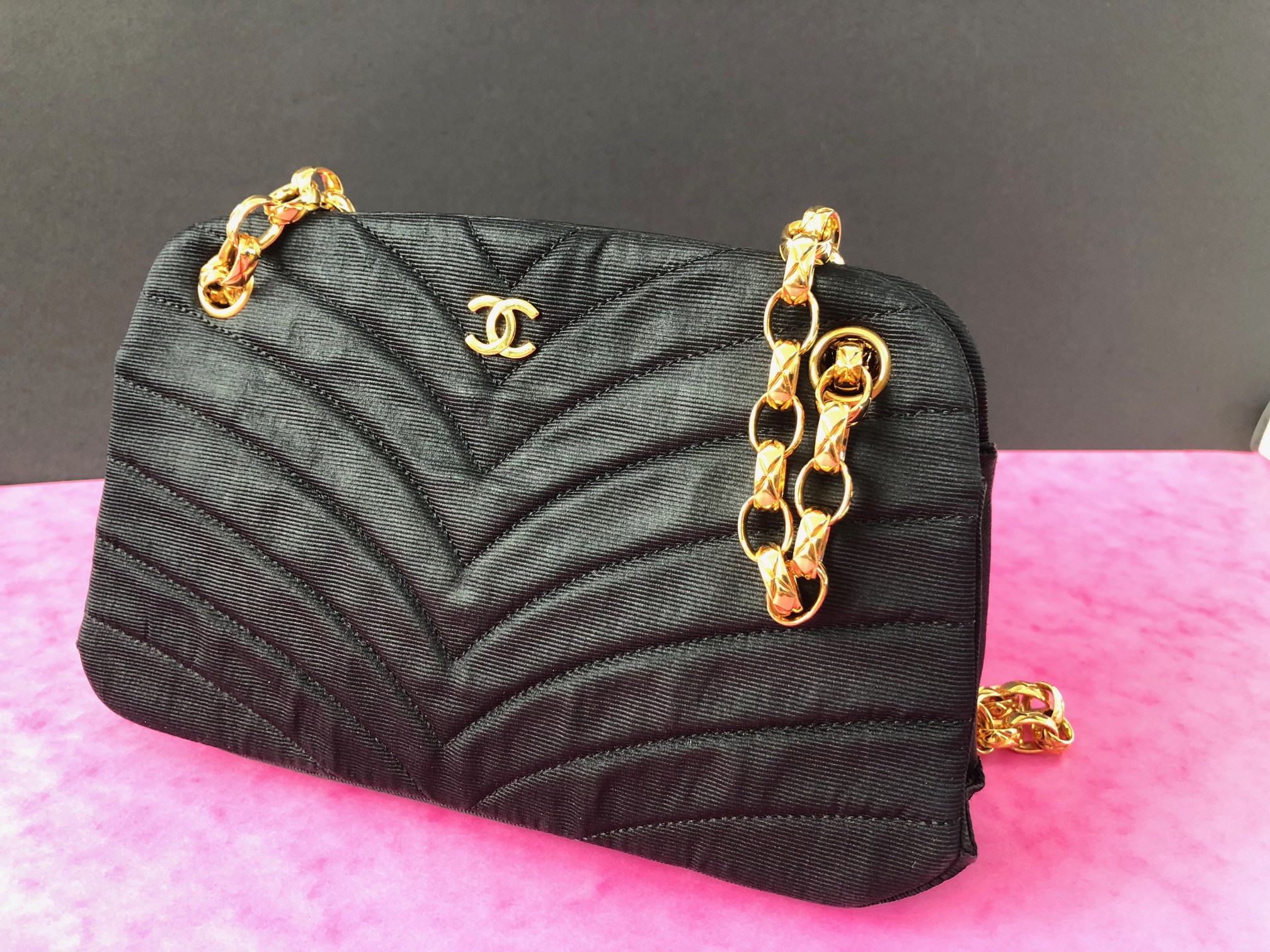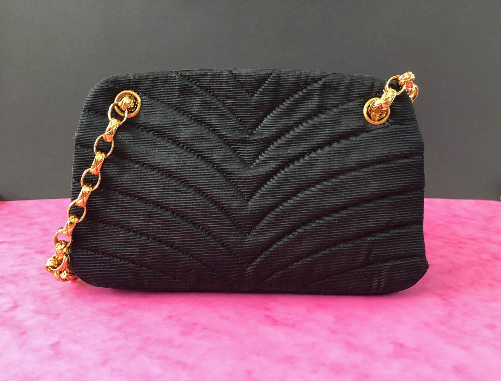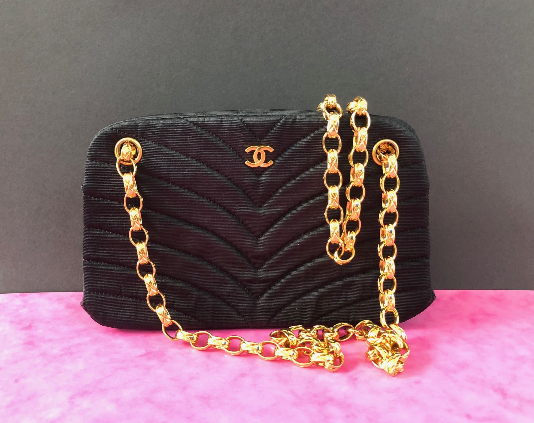 Day and evening 2 in 1 vintage clutch shoulder purse bag. Black chevron cloth, wallet clasp, 2 interior pocket. beautiful gold tone metal chain handles, a beautiful Chanel twist stud CC logo, closure with gold twist buttons. It can be worn /carried higher using the double chain or carried / worn lower using the single chain. A precious and a stunning unique, rare vintage piece dated 1989-1990s.
