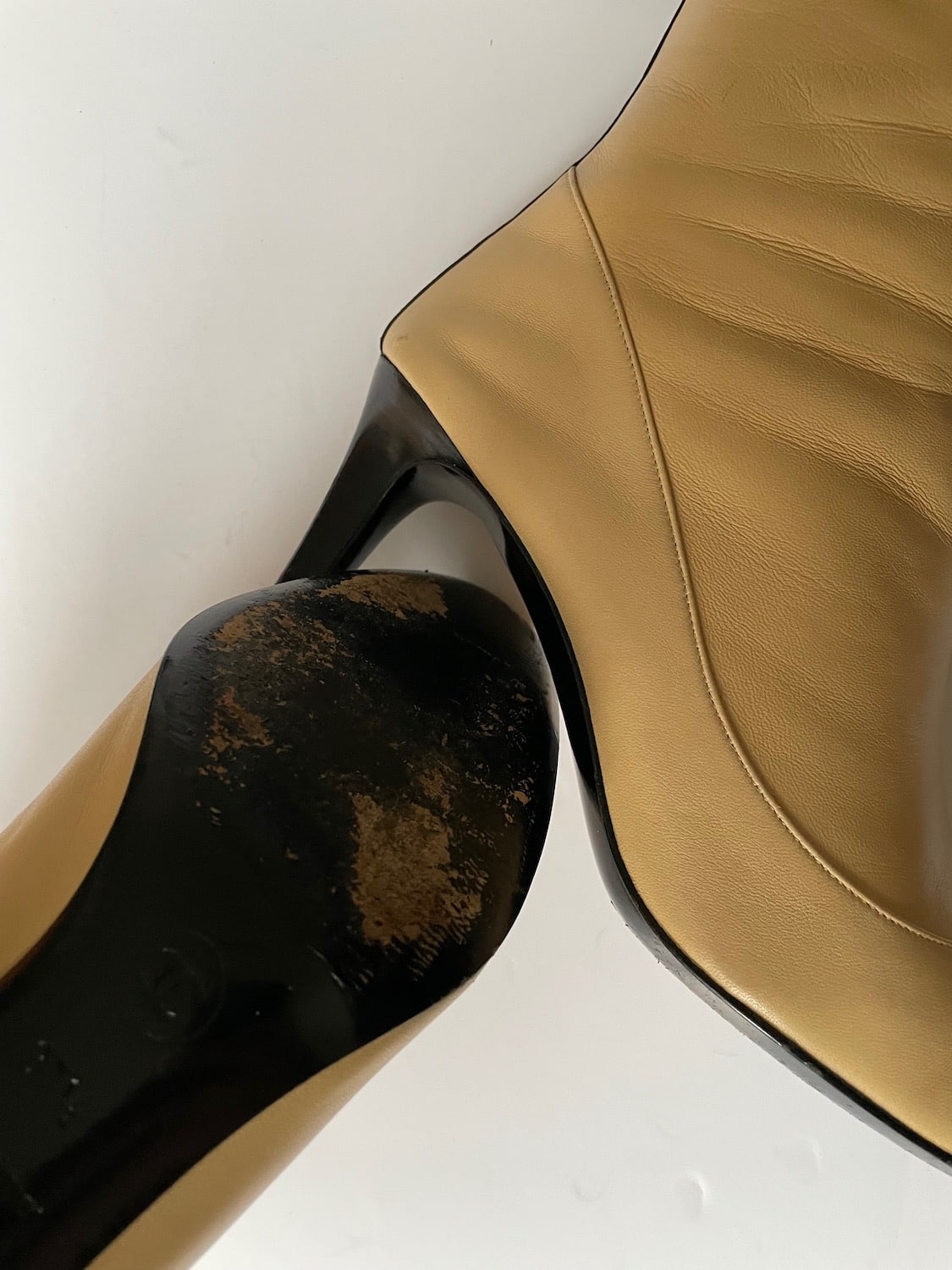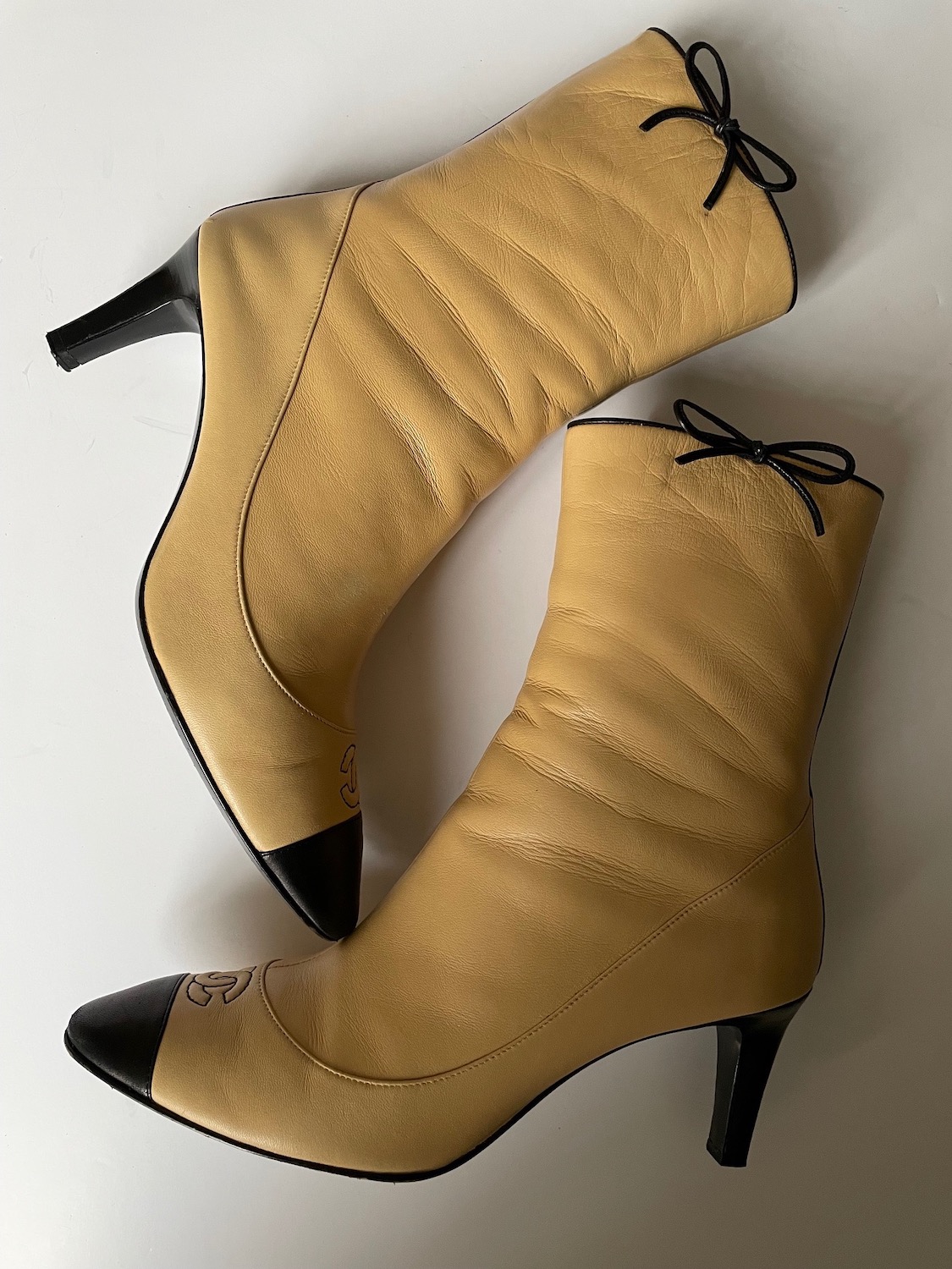 CHANEL High Ankle Boots Calfskin Beige & Black CC Logo Bow & Stripe Rare