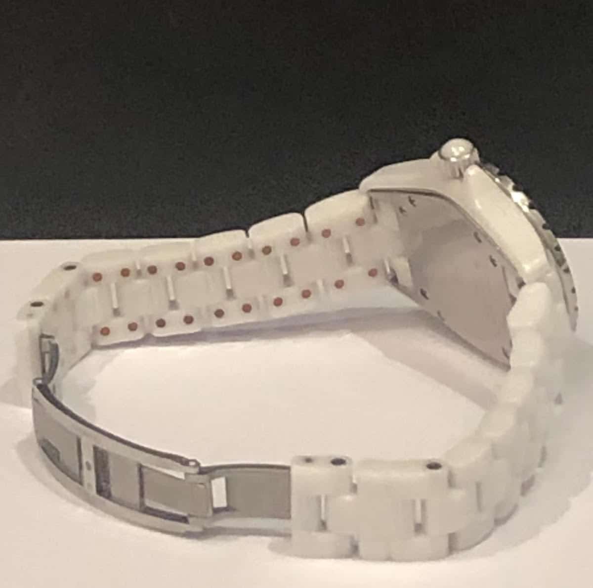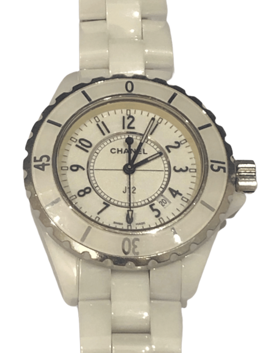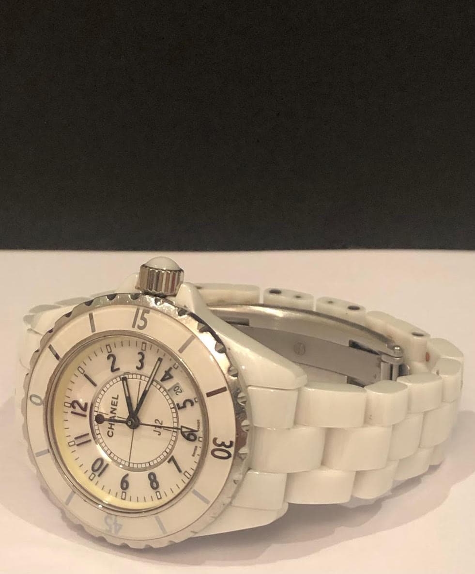 An elegant iconic Chanel ladies (unisex) preowned J12 watch in 33 mm size, featuring the Calibre 12.1 for an elegant and sporty look. The white highly resistant ceramic and steel case is showcased with the unidirectional rotating bezel feature. The white lacquer dial has an inner railway of indicators. The original typeface of the numerals has been redesigned to enhance and refine the design, as they are set in ceramic. The hands are now luminescent in white Super-LumiNova on the J12. The chronometer offers a 70-hour power reserve. The feature of the steel screw-down crown with white highly resistant ceramic cabochon. Presented on a white ceramic bracelet and steel triple-folding buckle. It is Swiss-made with a high precision quartz movement with 200m water resistance. This beautiful watch was purchased in 2007 and it is perfect working order.The J12 is a line of Swiss made luxury watches introduced in 1999 by French haute couture house Chanel. The J12 was launched in 1999 and is considered as a unisex watch. Delivered with the black original case, the authenticity card, the original purchase card and with 2 extra links.