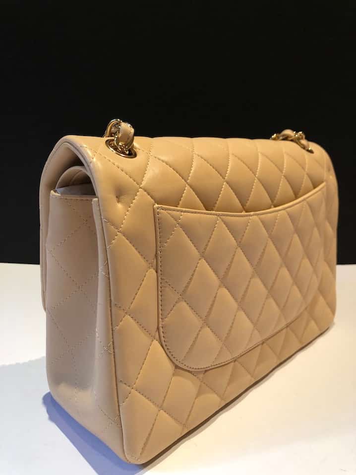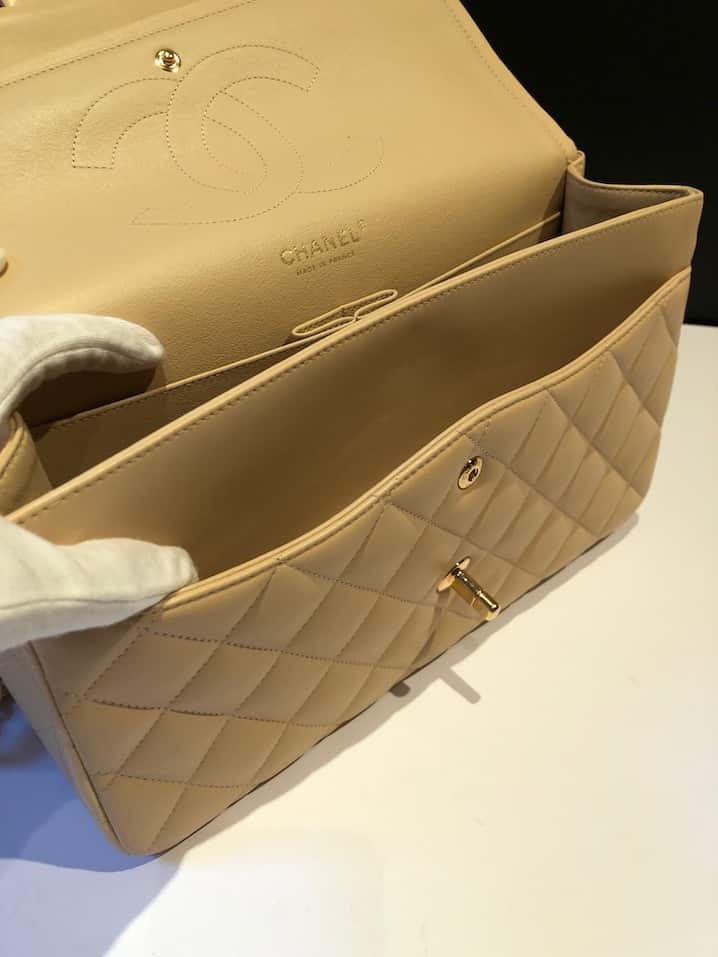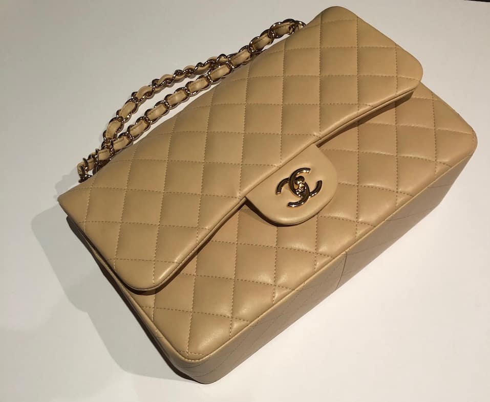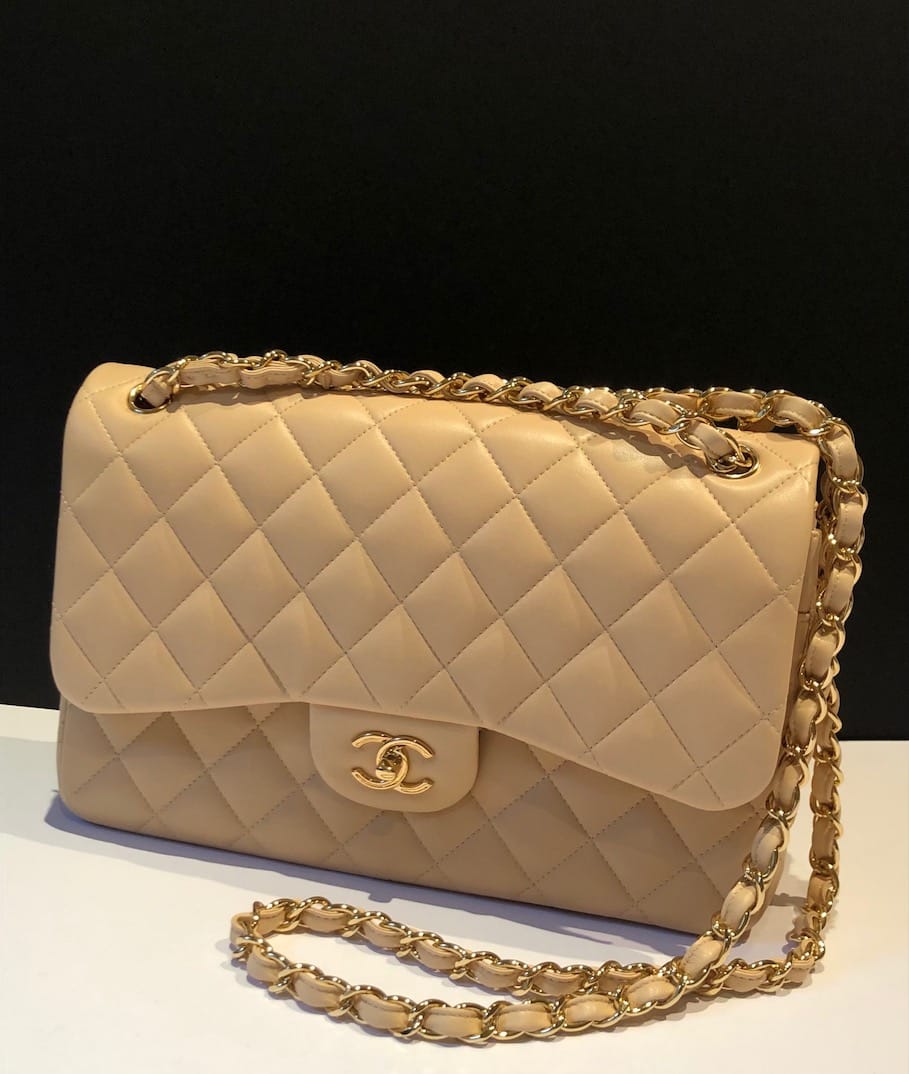 A stunning ‘Must-Have’ Chanel maxi jumbo classic diamond quilted handbag. This is the perfect bag, never been used, it is in beige-camel colour, leather lambskin with a classic interlaced gold tone chain link-leather double shoulder straps and the iconic interlocking CC turn-lock. A rear open pocket, an internal inner large pocket, two internal patch pockets, internal CC stitched logo stamp with CHANEL ® made in France signature. Leather lining with gold-tone hardware. It is a stunning ‘timeless’ bag, ‘Must-Have’.