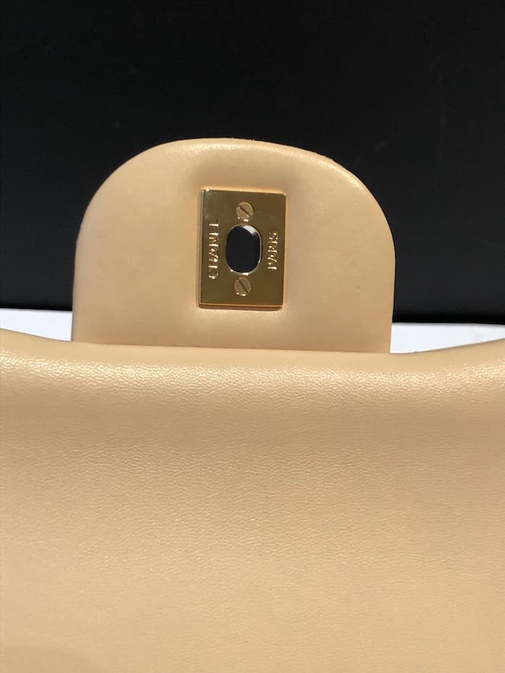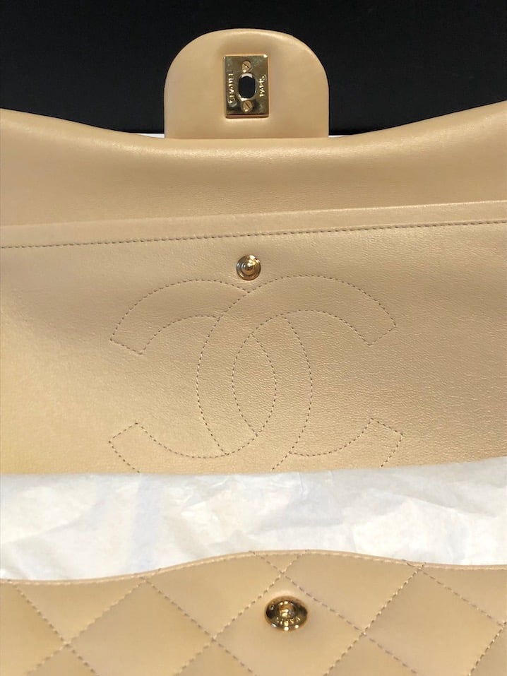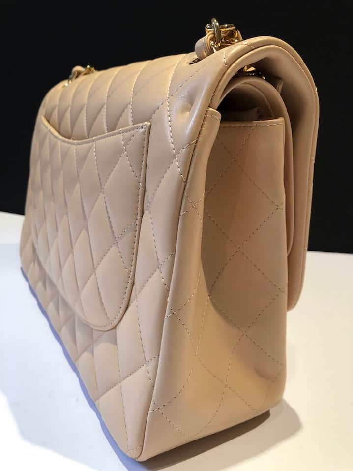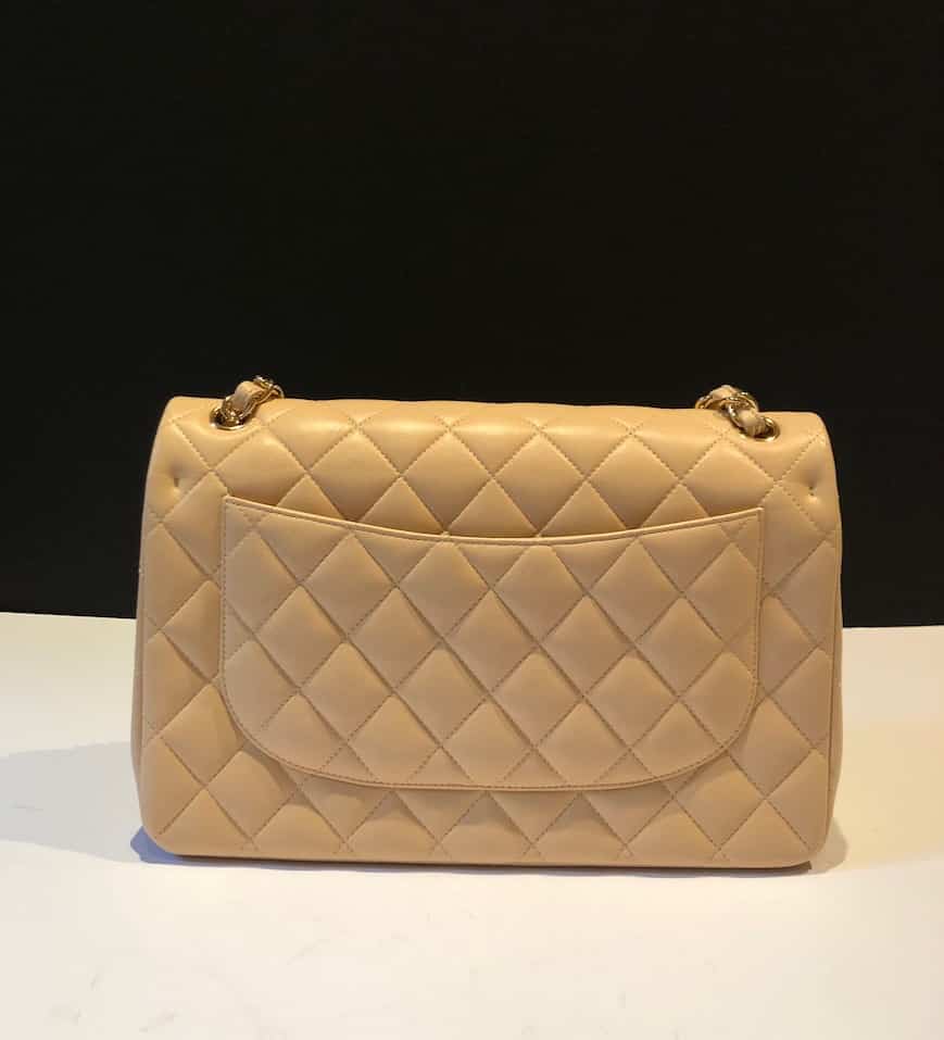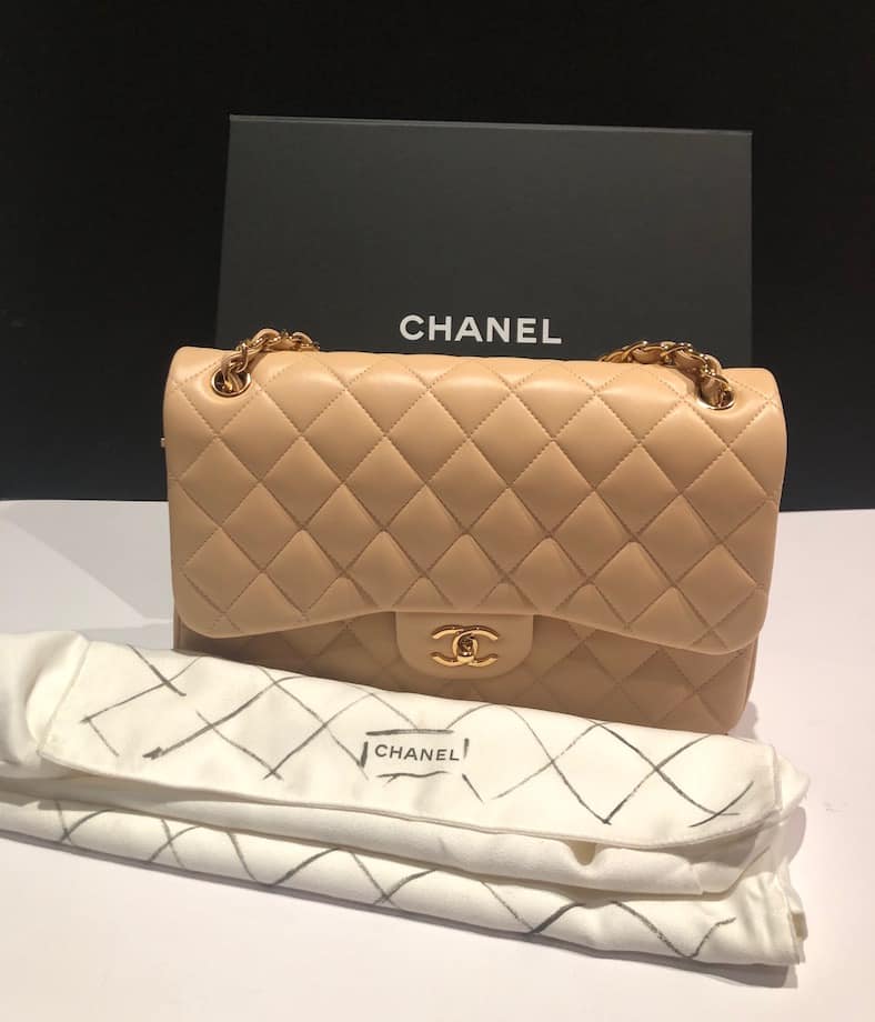 A stunning ‘Must-Have’ Chanel maxi jumbo classic diamond quilted handbag. This is the perfect bag, never been used, it is in beige-camel colour, leather lambskin with a classic interlaced gold tone chain link-leather double shoulder straps and the iconic interlocking CC turn-lock. A rear open pocket, an internal inner large pocket, two internal patch pockets, internal CC stitched logo stamp with CHANEL ® made in France signature. Leather lining with gold-tone hardware. It is a stunning ‘timeless’ bag, ‘Must-Have’.