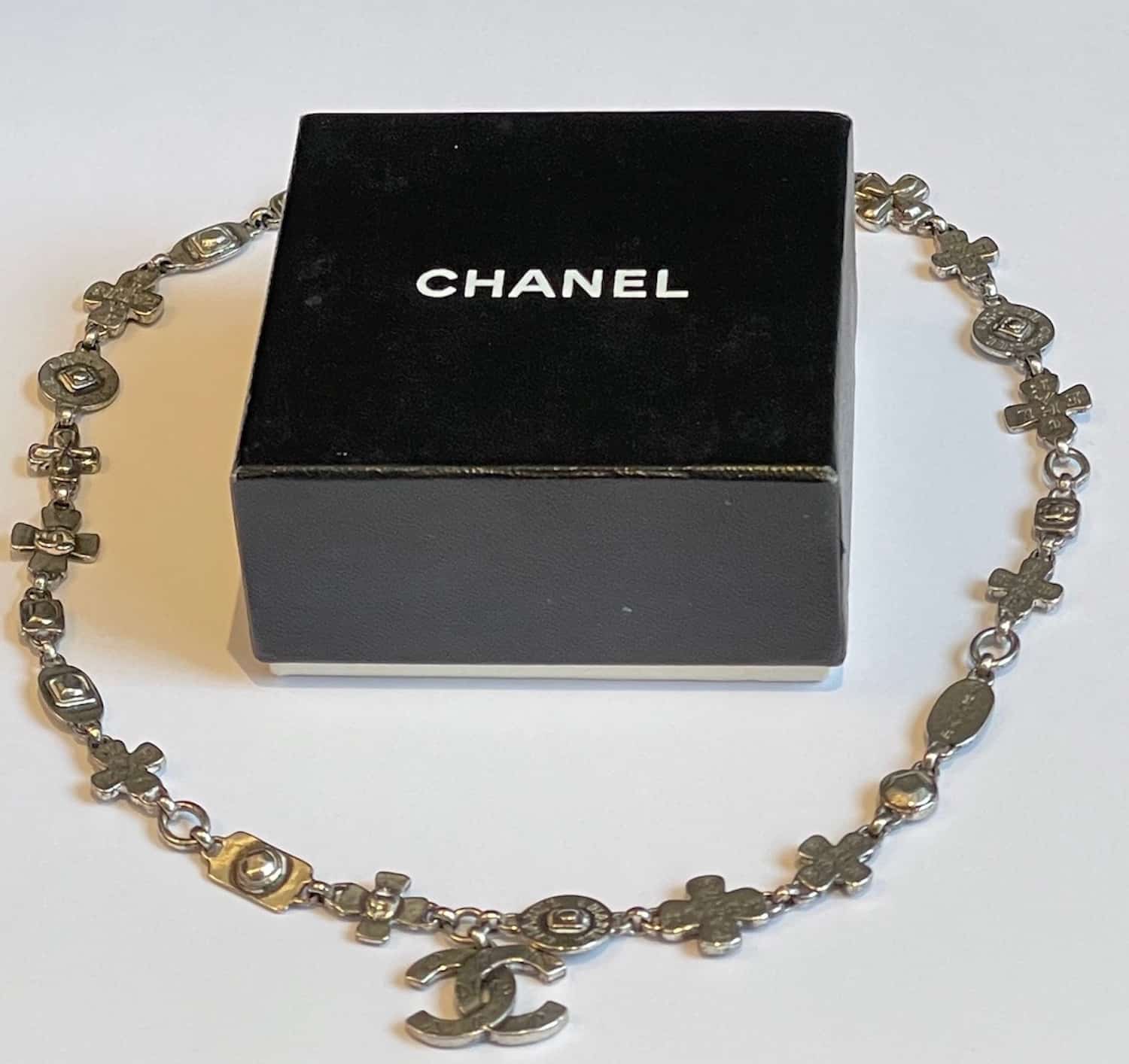 CHANEL Necklace Silver CC Logo Cross Pendant & Leaf Clover W/Box C.1999