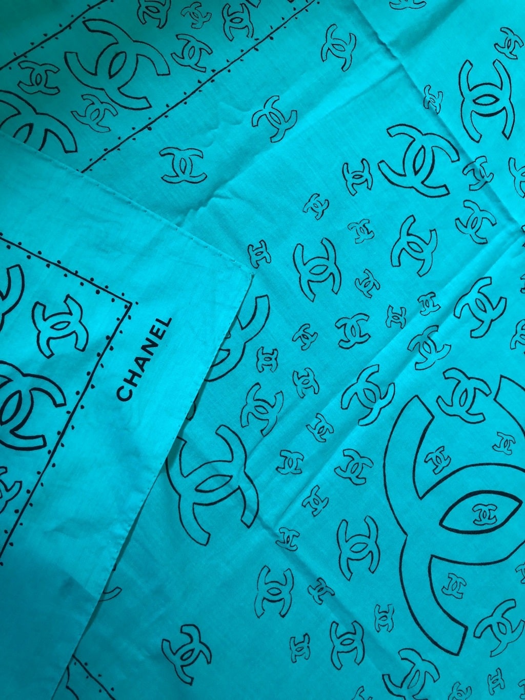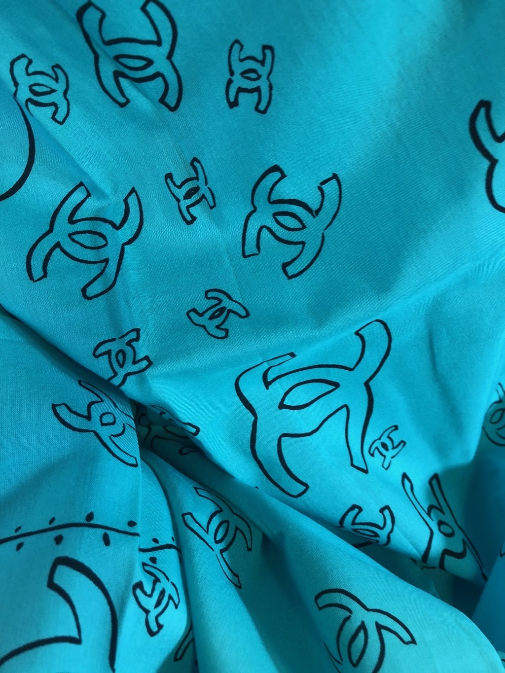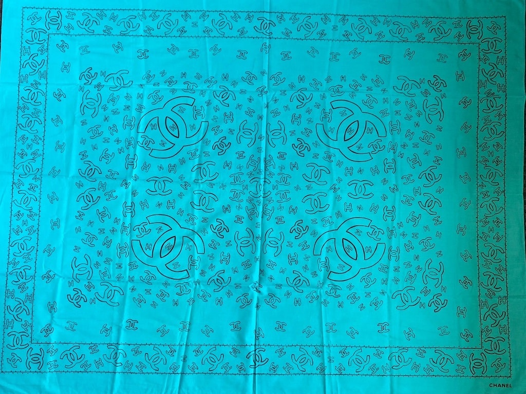 a stylish cotton beach pareo with Chanel CC logo printed boldly in black across the scarf, never worn in blue colour.