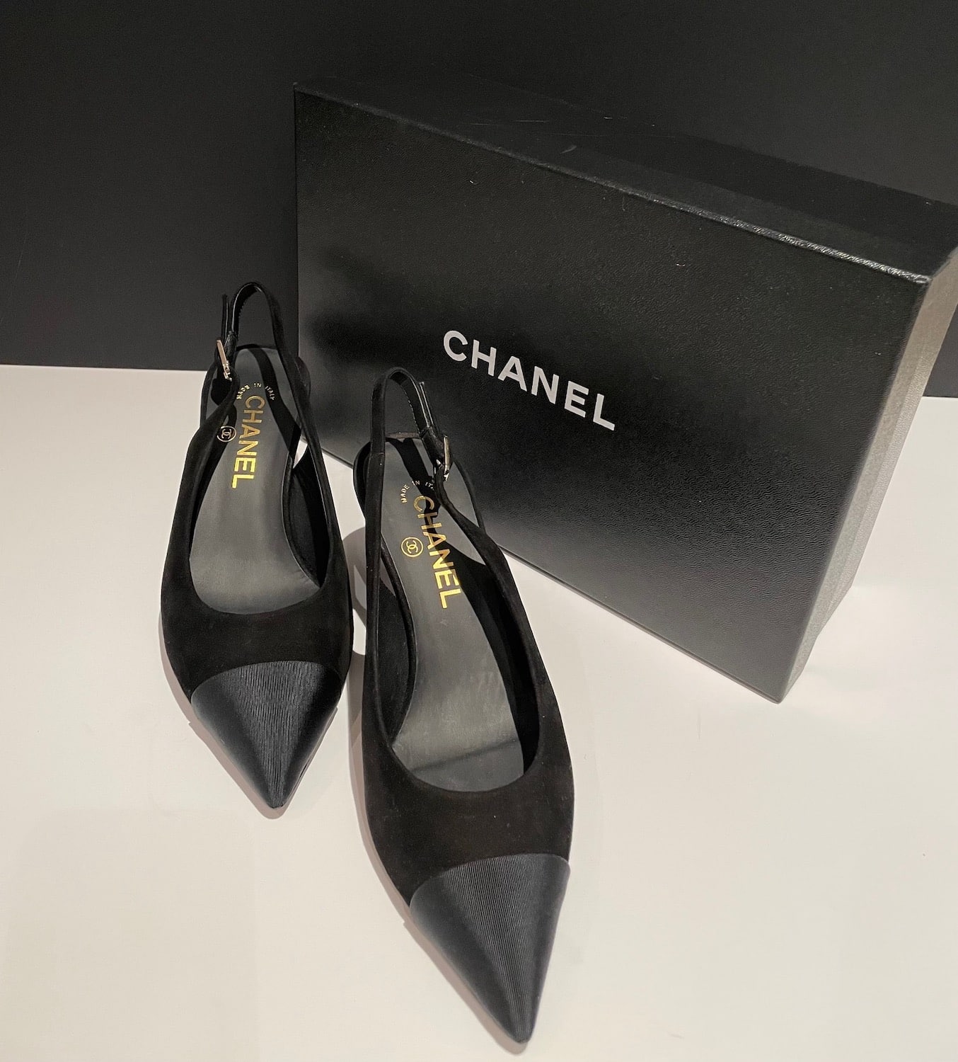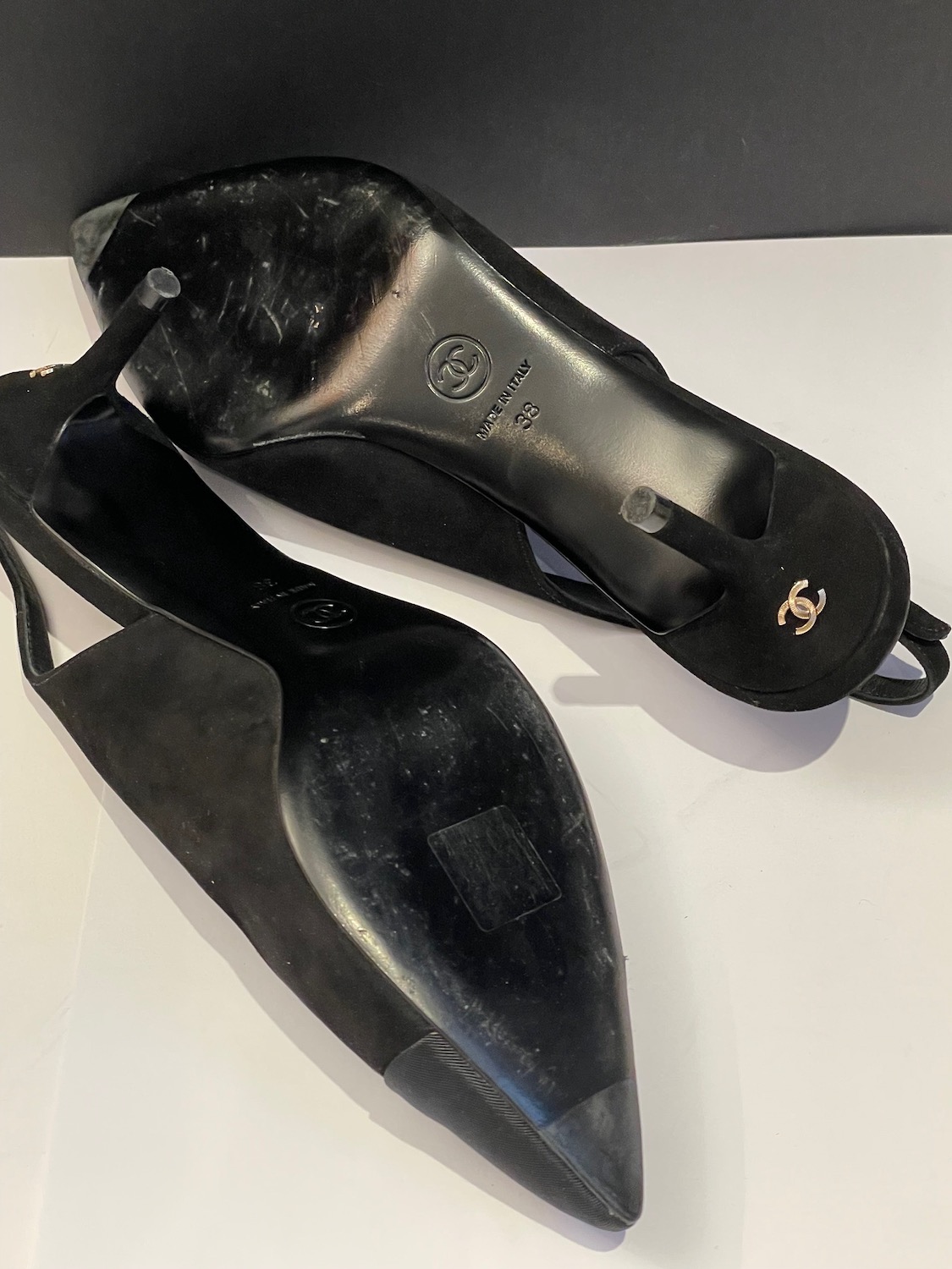 CHANEL Slingback Heels CC Logo Grosgrain Black Suede Shoes Pumps