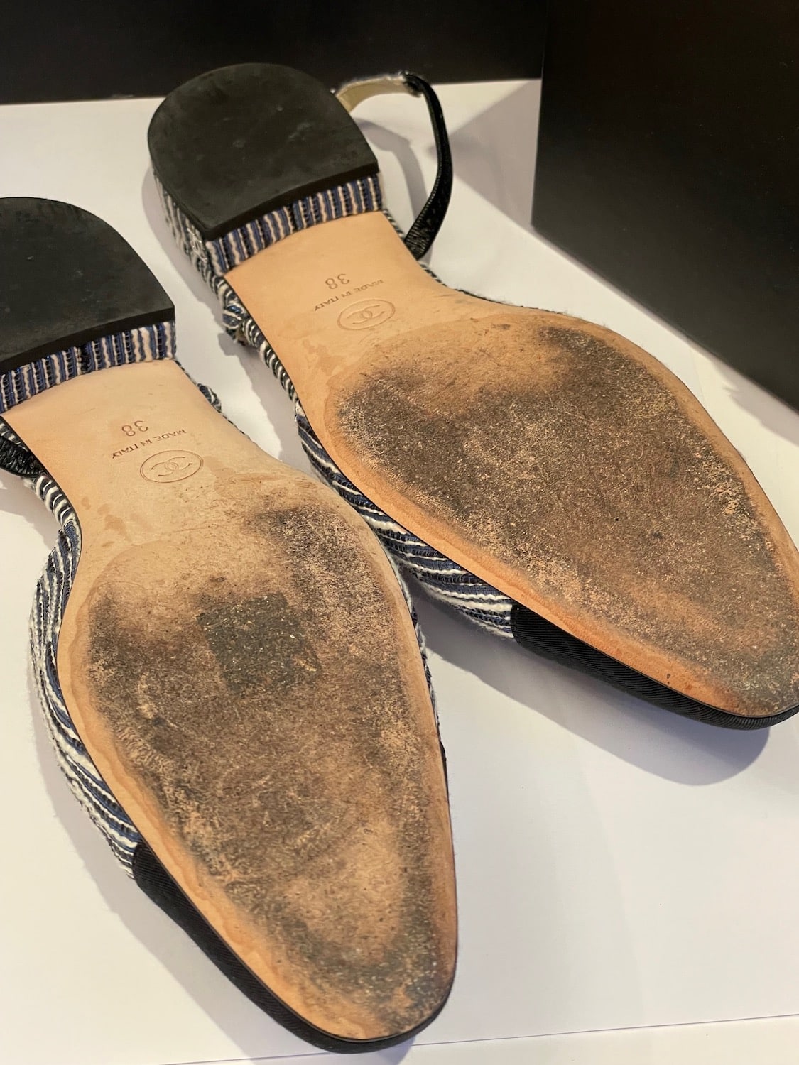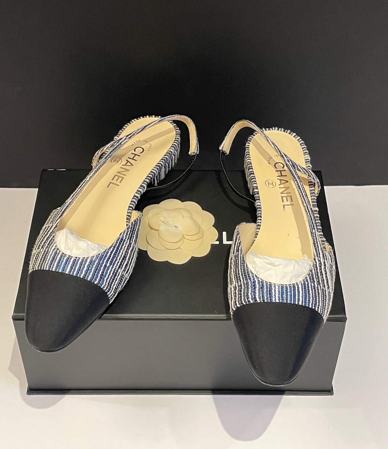 CHANEL Slingback Sandals Tweed Blue & Grosgrain Black