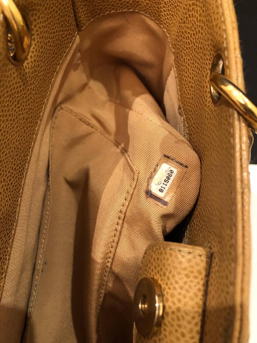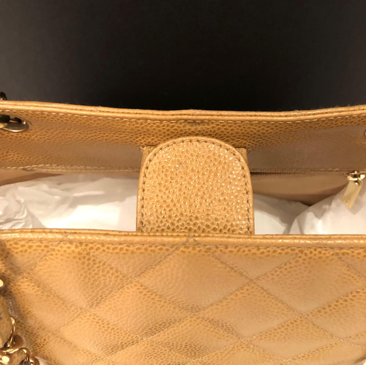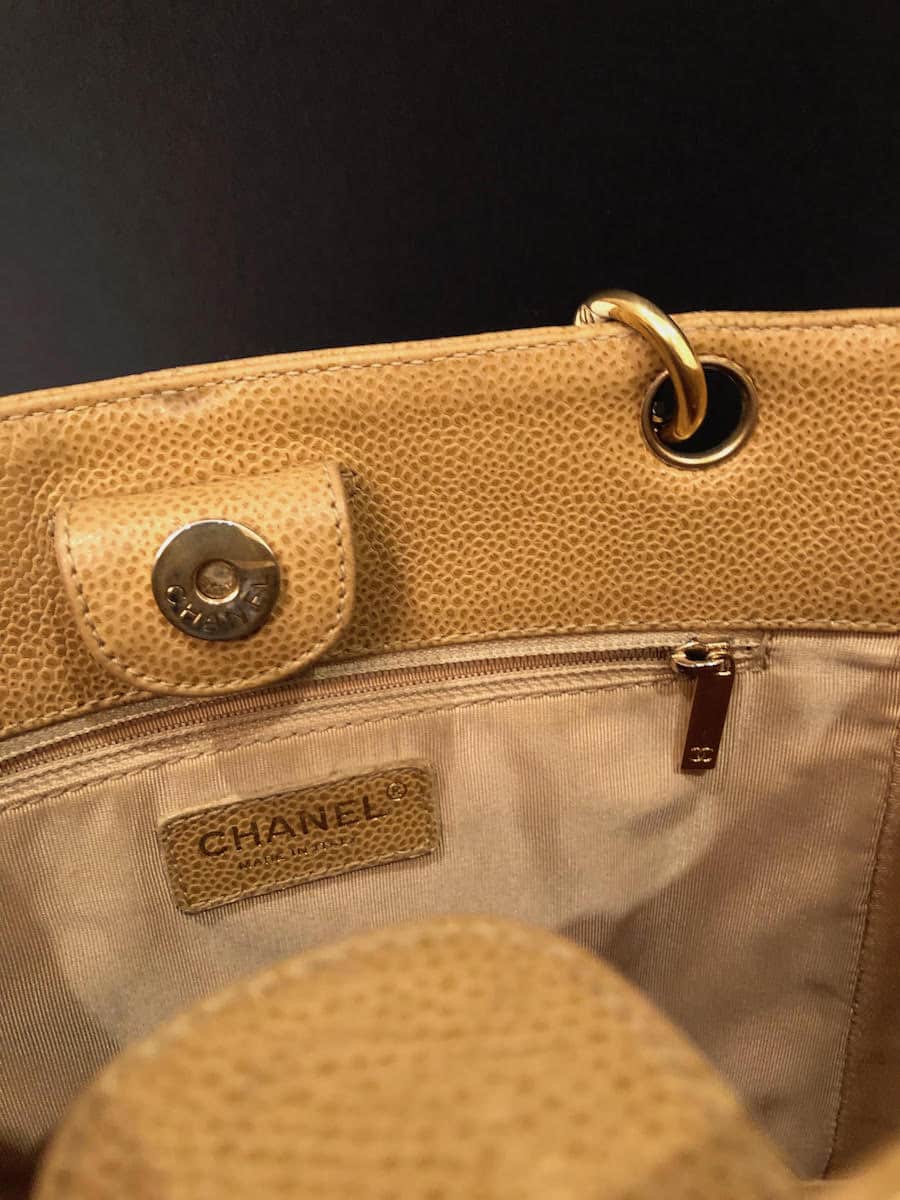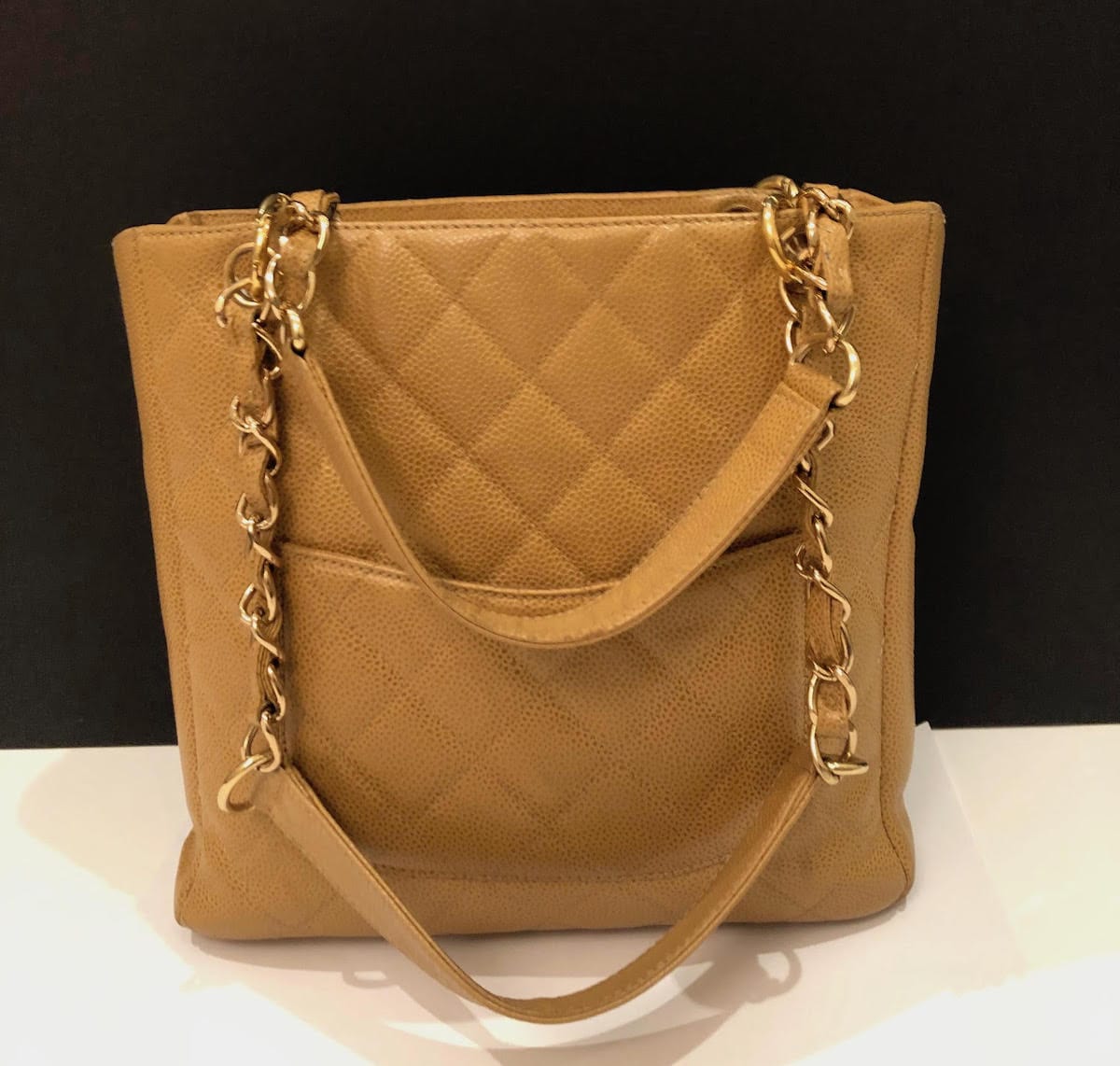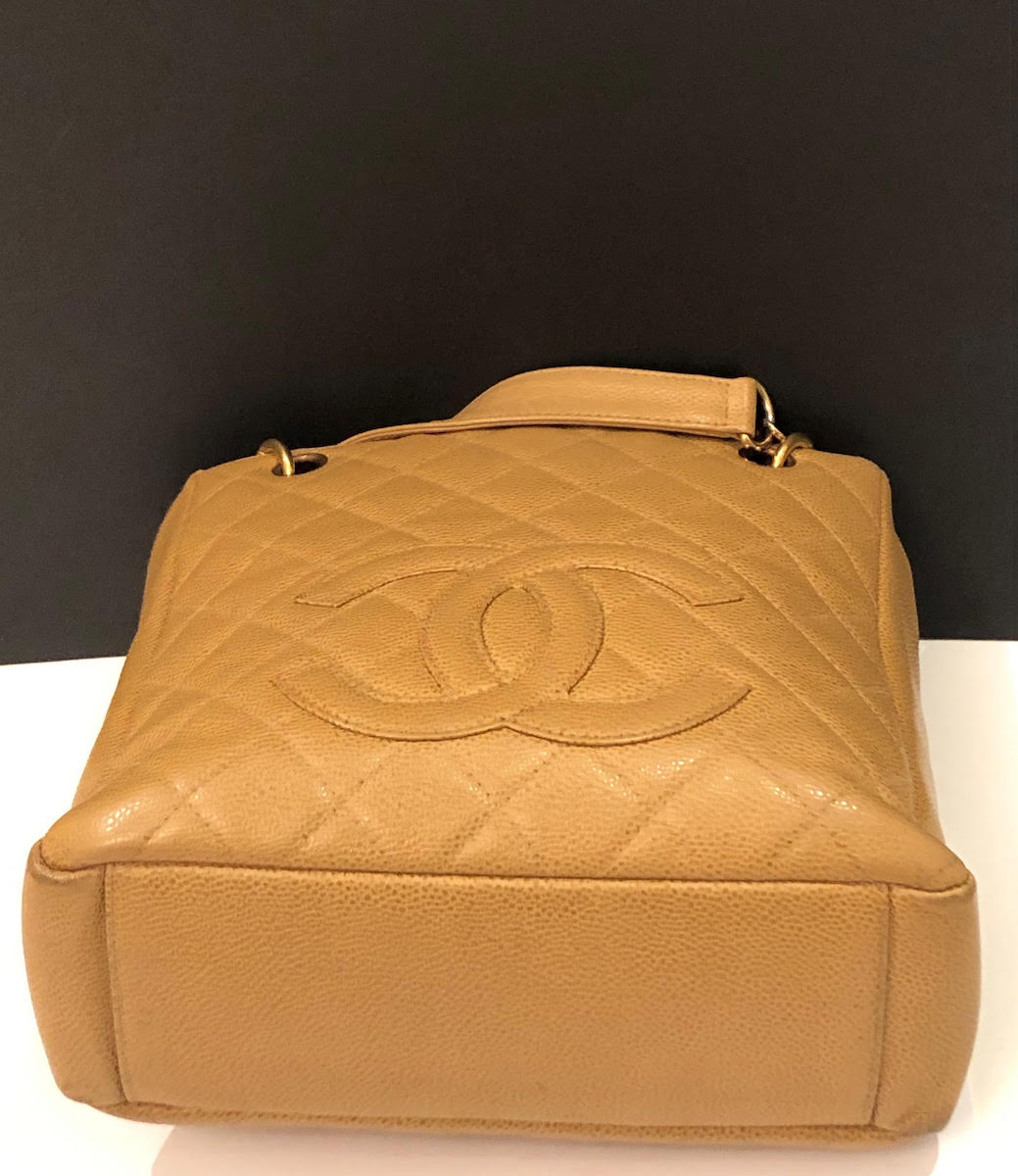 A small, very cute rare ‘petit’ 24 cm Chanel tote bag Circa 2003-2004. This PST bag is handcrafted from camel-beige caviar grained leather and finished with large stitched interlocking CC monogram, classic diamond quilting, Gold tone hardware and two woven leather chain interlaced shoulder straps. Magnetic magnet push button top closure, one half moon rear pocket, two interior pockets, one slit and one zipper pocket, half moon size clip ring, lined with grosgrain cream fabric. This PST bag (Petit Shopping Tote) is the little sister of the GST bag (Grand Shopping Tote) one of the ultimate luxury shopping bag and often referred to as the GST. The GST (PST) is one of the brand’s rarer and sought-after pieces after it was discontinued in 2015. Loved for its practical construction and size combined with all the classic famous Chanel design. ‘Must-Have’ very good condition, rare with serial number and authenticity card and booklet.