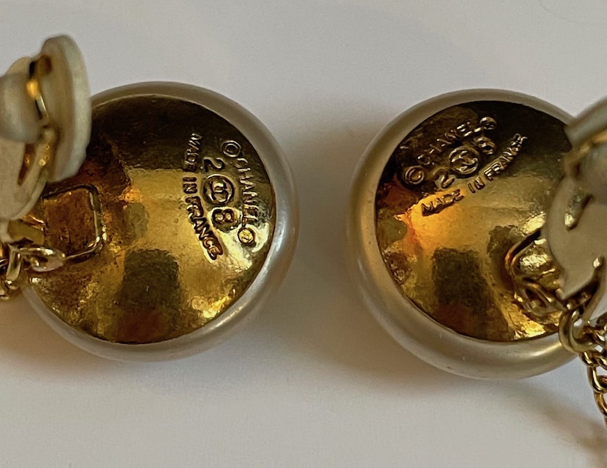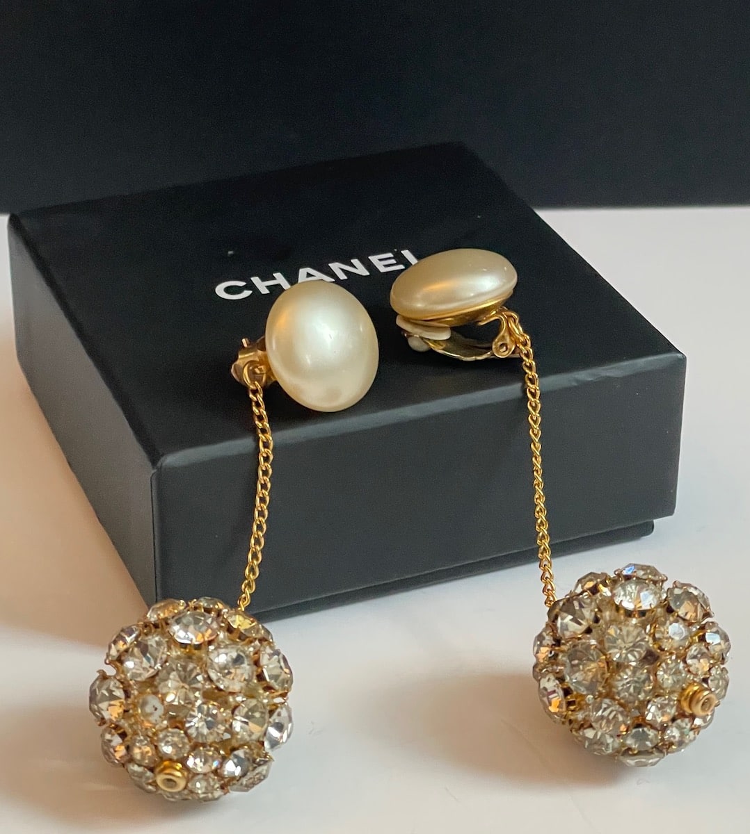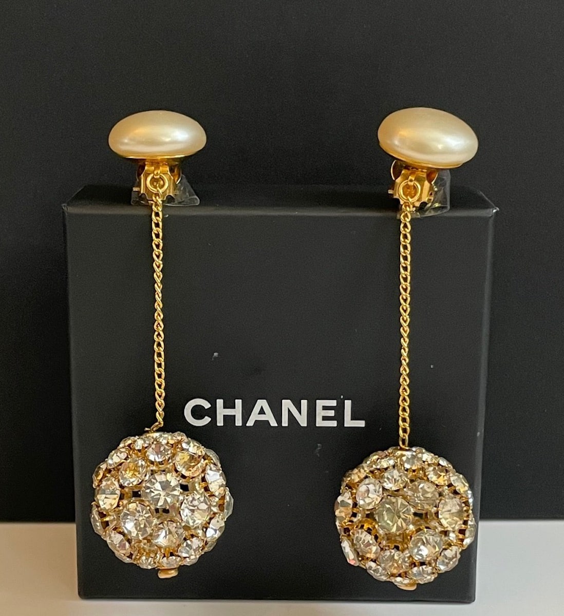 An exquisite VERY RARE pair of vintage CHANEL clip-on drop earrings from the 1992 No. 28 Collection. Handcrafted with classic Chanel faux pearls and long chains in gold plated metal suspended with stunning gold Swarovski clear crystal ball-spheres. A truly collectable statement piece and a “Must-Have” for your wardrobe!