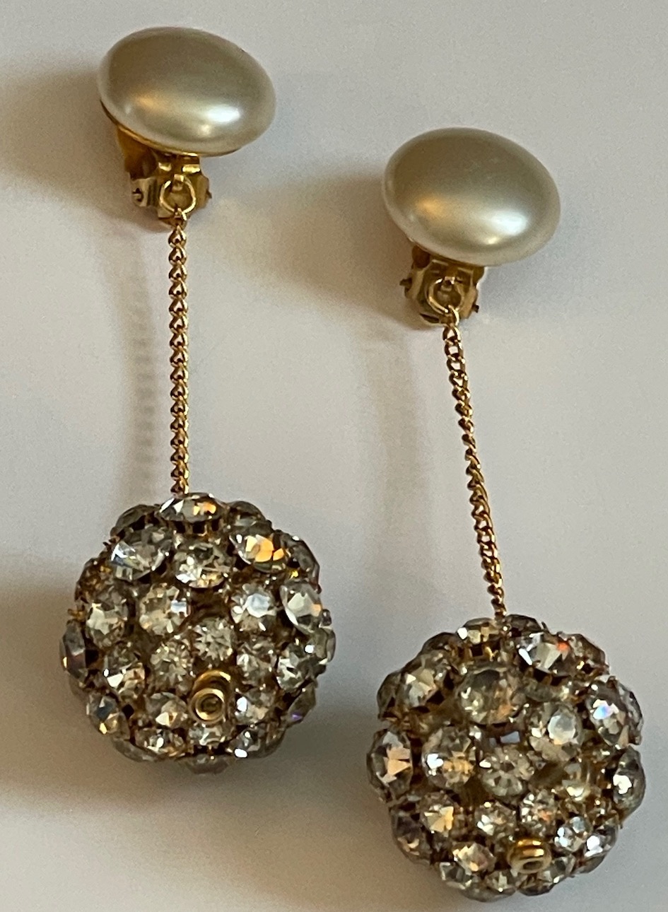 CHANEL Vintage 1992 Gold & Pearl Collection 28 Crystal Sphere Ball Chain Drop Earrings