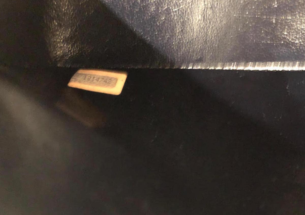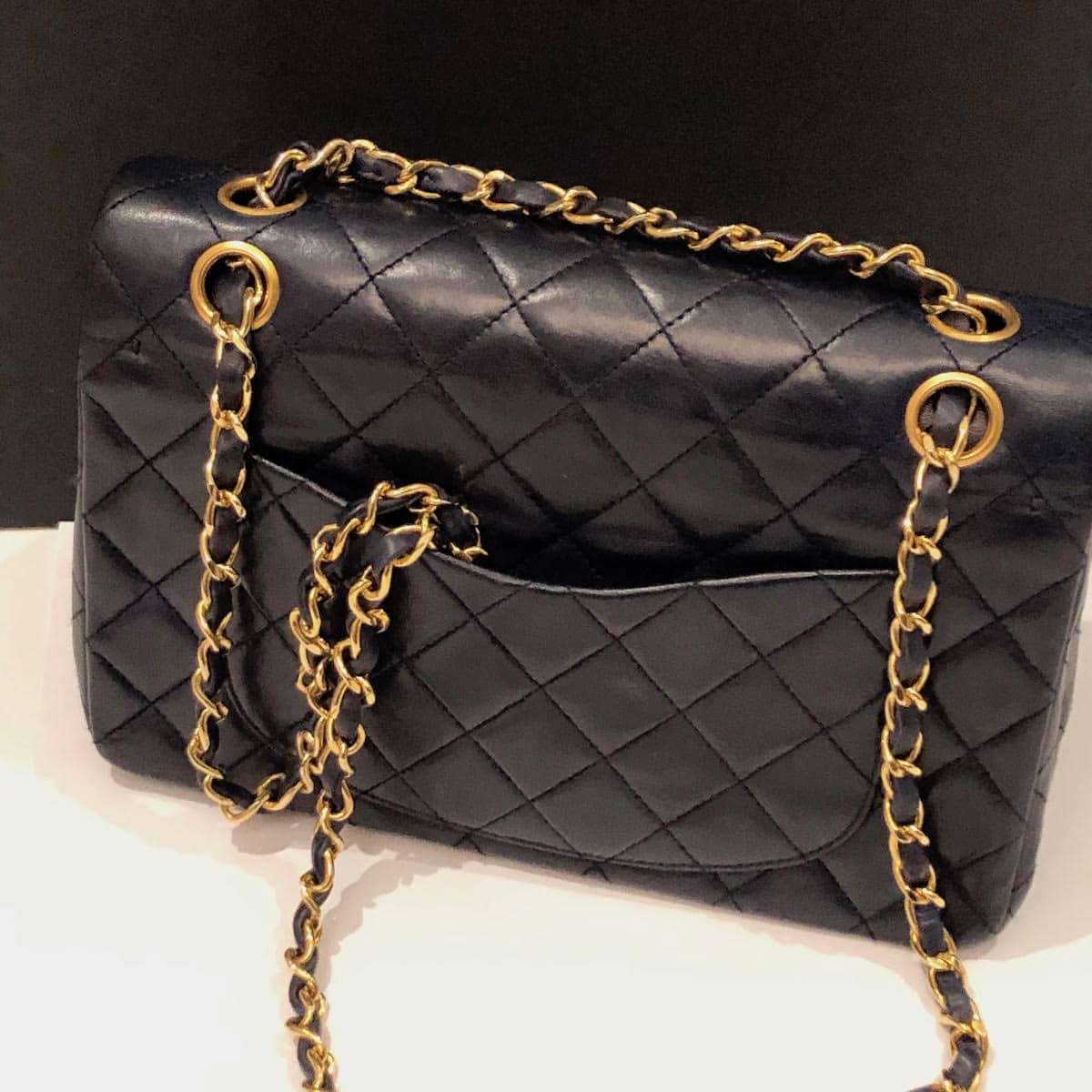 A timeless, outstanding Chanel collector 2.55 from 1989, 23.5 cm in deep navy (almost black) in very good condition with some normal wear as it is a 34 years old classic. It is a classic double flap in deep navy blue, classic quilted leather with excellent 24k gold plated CC turn-lock and hardware, a double strap leather interlaced chain. Rear half moon exterior pocket, the exterior is in very good condition with some normal age related wear on the leather with some trace of the interlaced leather chain strap due to storage, see photo. This is only apparent under certain bright light conditions. The interior compartments are very clean and it is lined with navy lambskin leather, two compartments, two small slit pockets. The small interior slit pockets are of leather and grey felt probably because some interior coating came off in one part inside of the two hidden slit pockets, see photo. Normally nobody are using these slit pockets because they are too rigid and narrow. This outstanding vintage Chanel small-medium handbag is from a private collection and it is ‘A Must-Have’ rare piece in very good condition and still has his sticker hologram inside at the bottom of the bag.