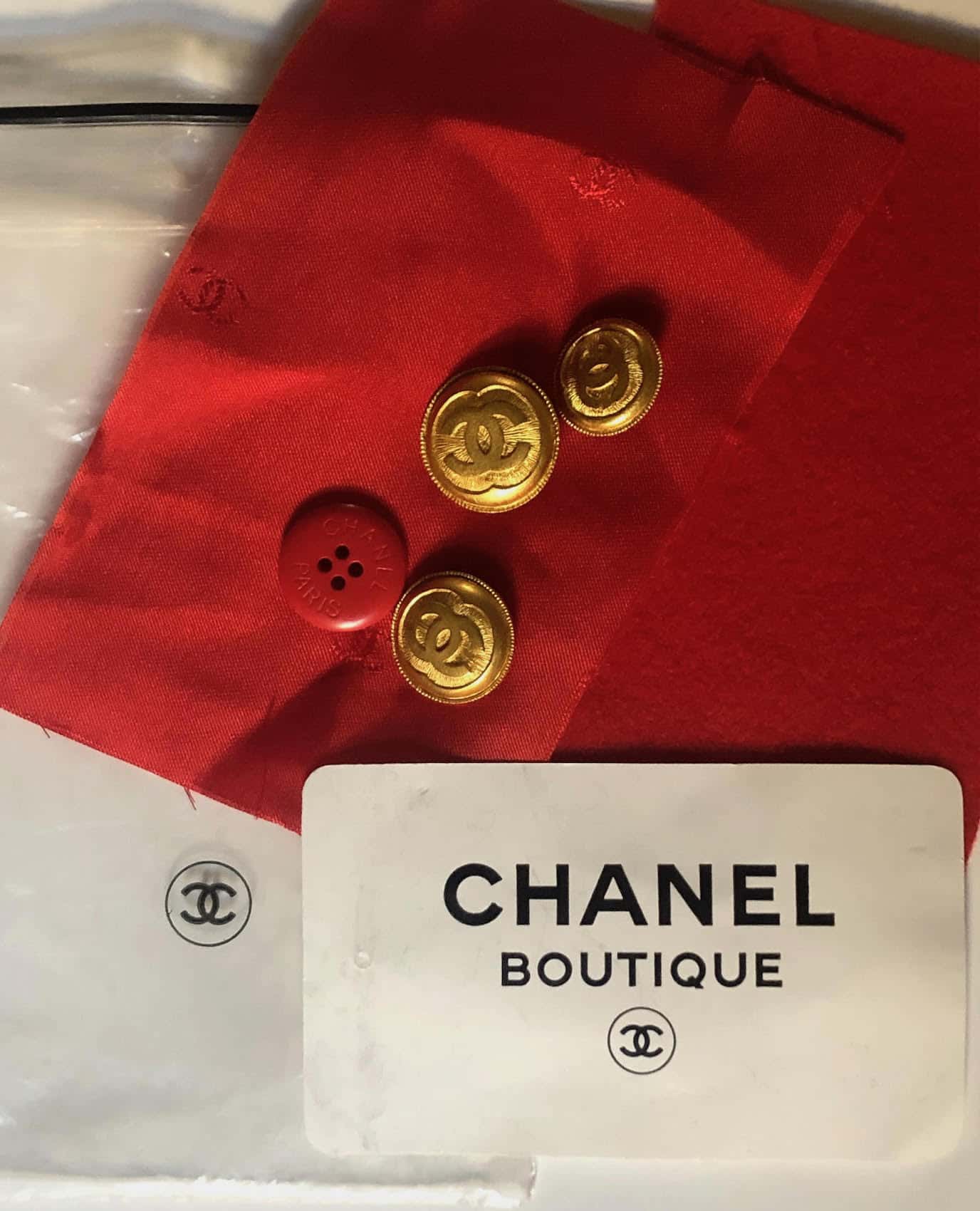 A stunning 90s double breasted Chanel jacket-coat (77 cm long) in letter box red with 12 CC logo buttons. It is handcrafted with pure wool, double silk lining with CC logo pattern. It is a spring-winter-autumn three quarter length tunique jacket with wide front pointed lapels. Closes with six front CC logo large gold tone buttons. Long sleeves with single split ends slit closes with three CC logo gold tone buttons on each sleeve. Two vertical exterior buttoned CC logo pockets one on each side. One interior red Chanel button. Original extra buttons and fabric sample and the original Chanel boutique ID card. Cleaning label still present.