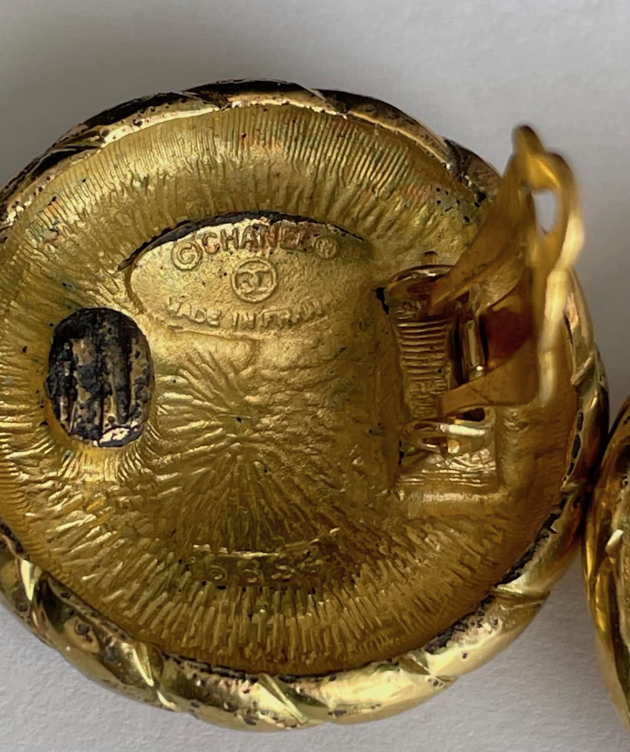 CHANEL Vintage CC Logo Round Gold Textured Earrings C.1980s W/Box
