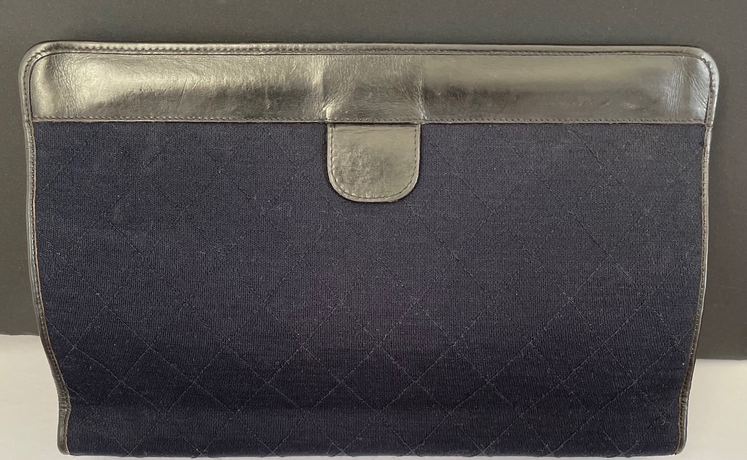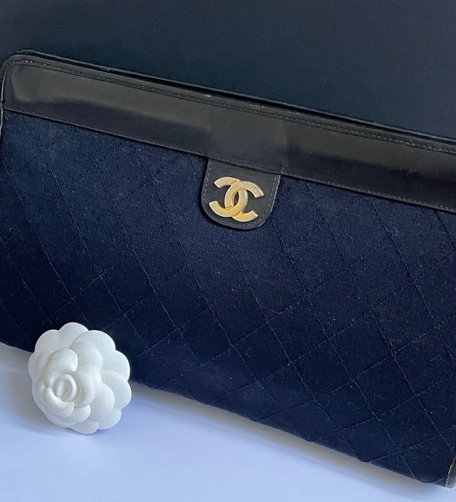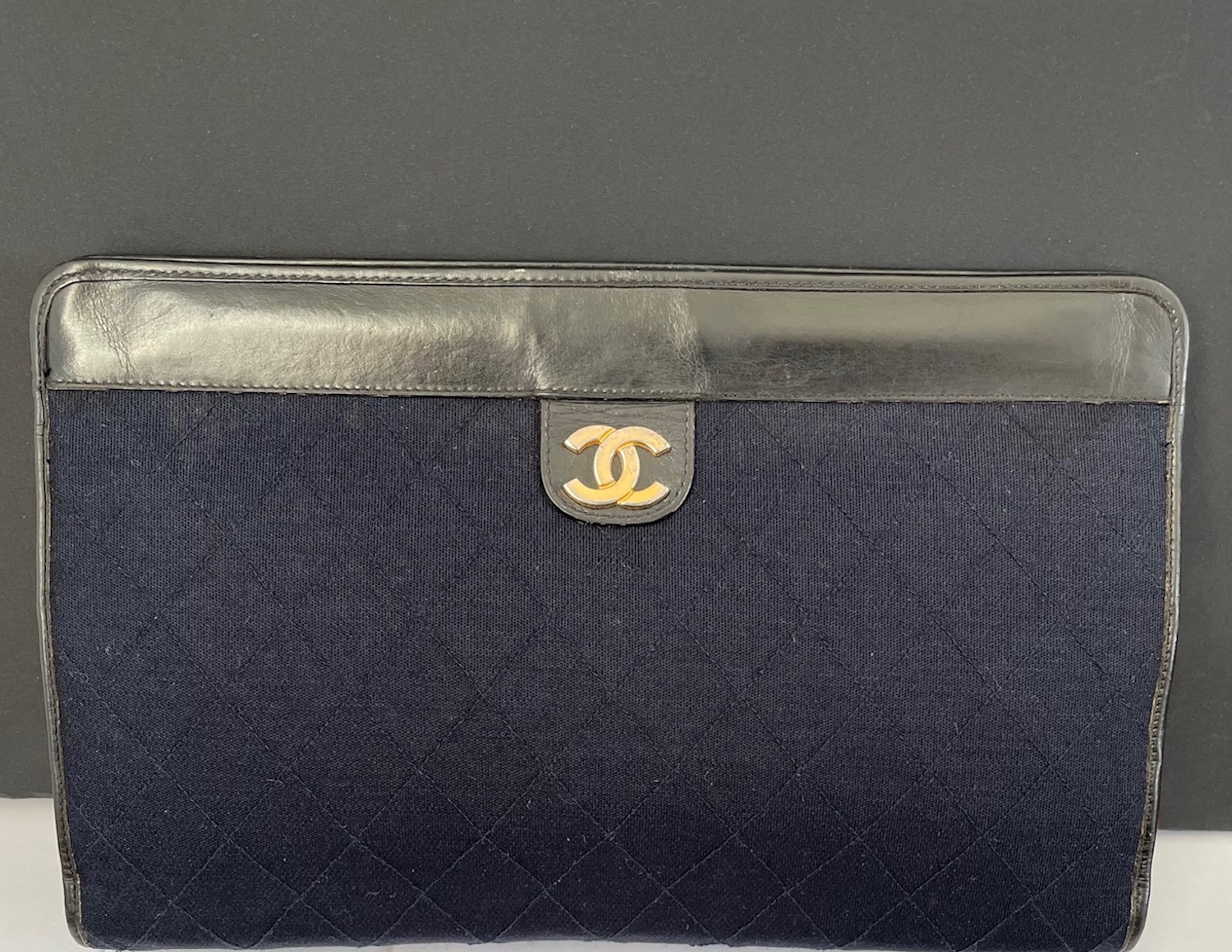 CHANEL Vintage Diamond Quilted Clutch CC Logo Leather & Jersey Handbag C.1970s-1980