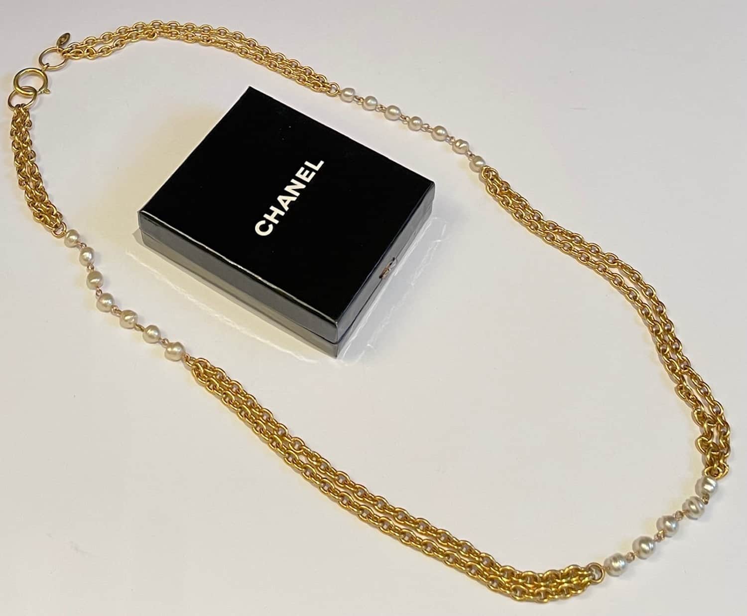CHANEL Vintage Double strand Necklace Gold & Baroque Pearl W/Box C.1980