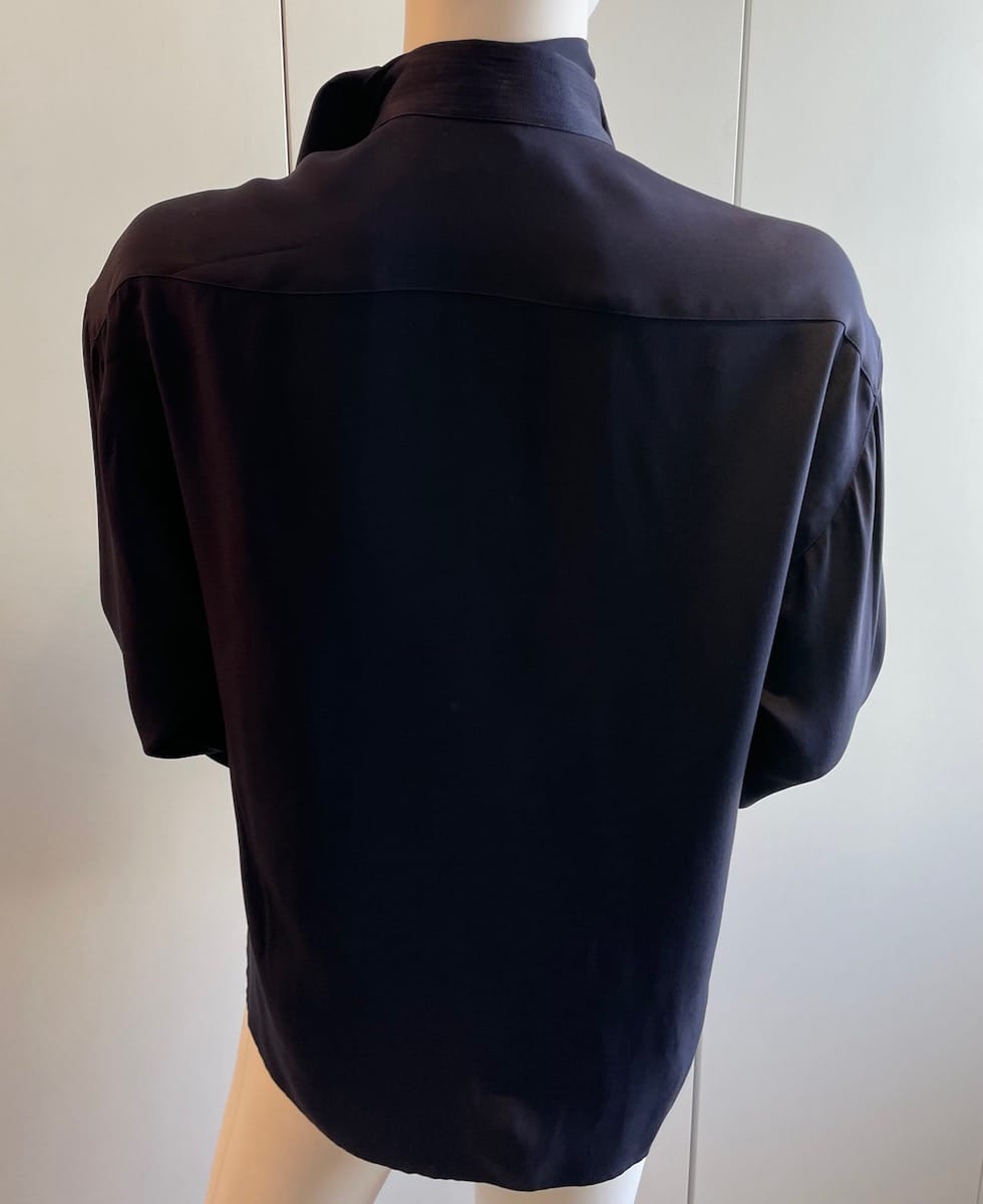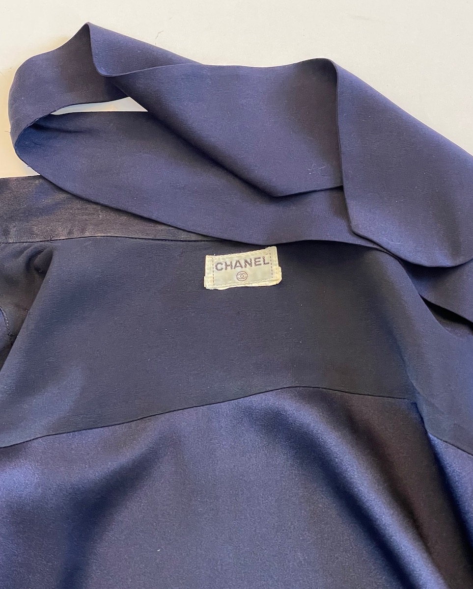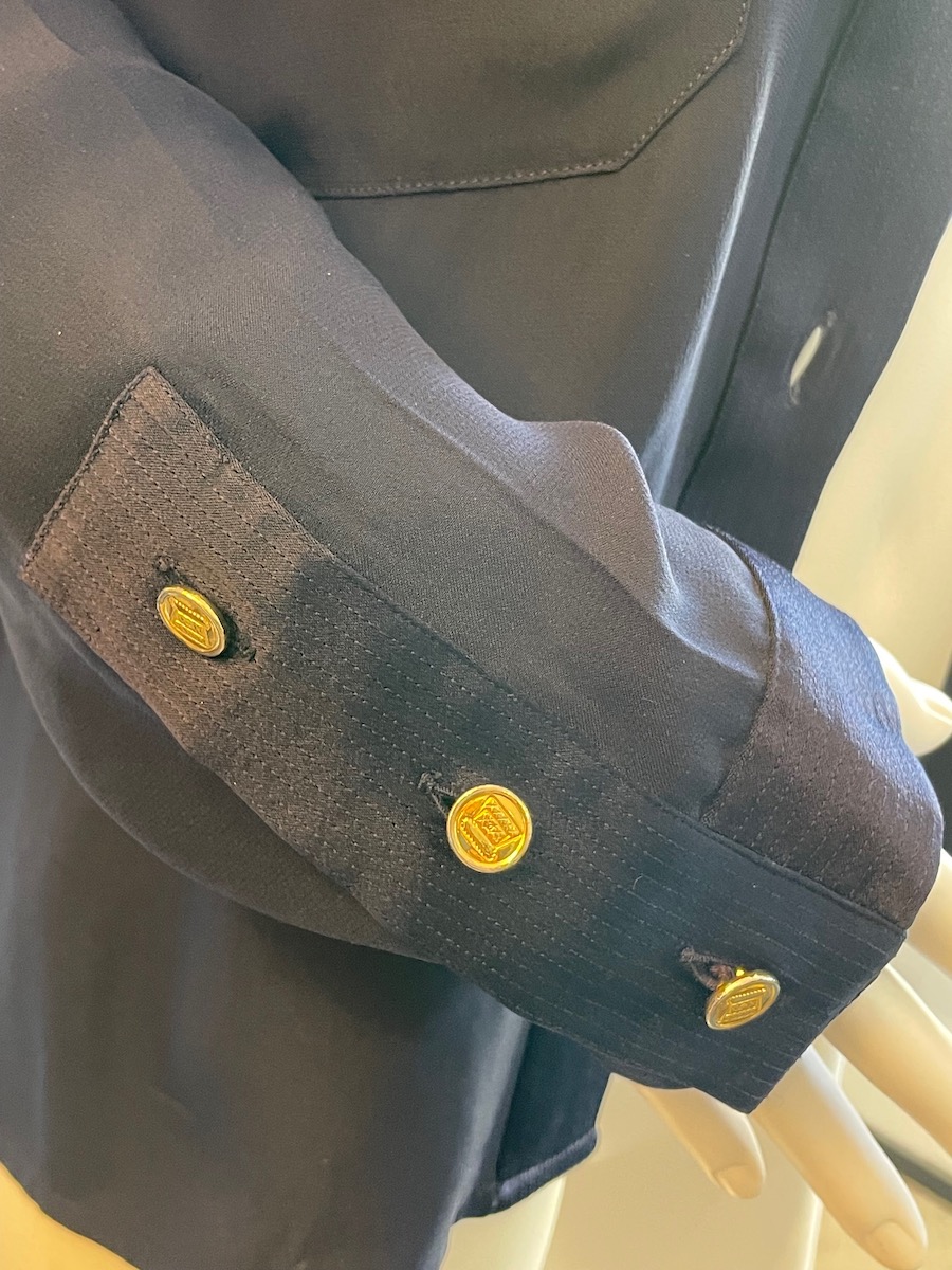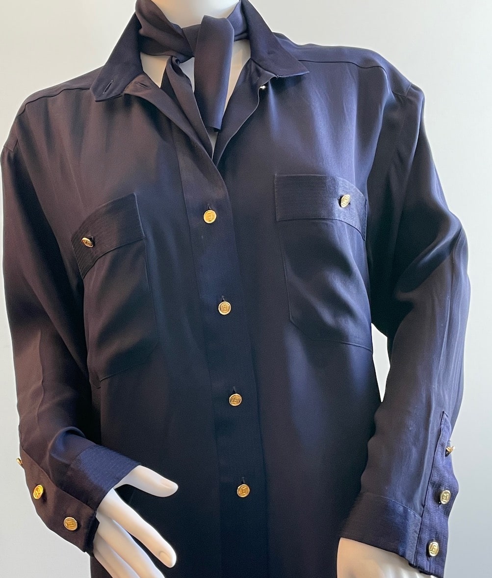 CHANELVin tage Logo Buttons Silk Blouse Shirt Navy Blue