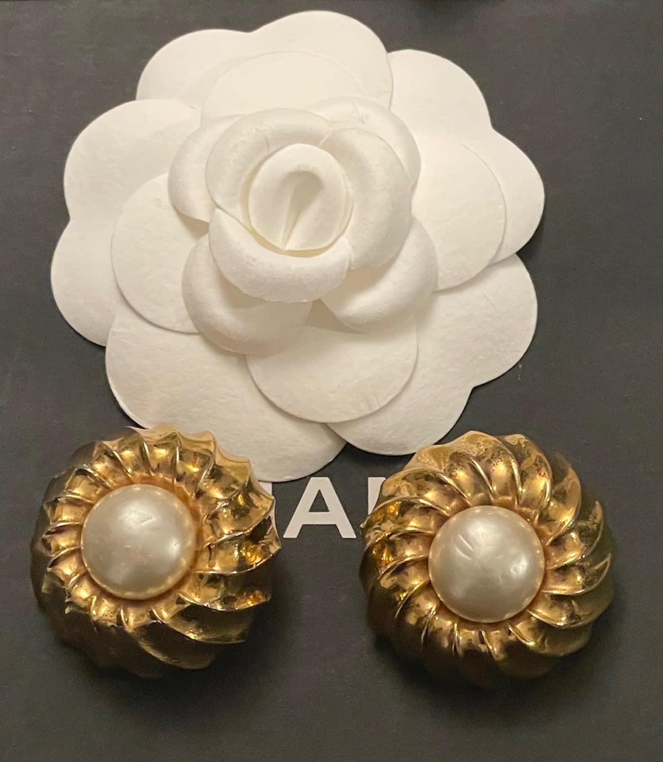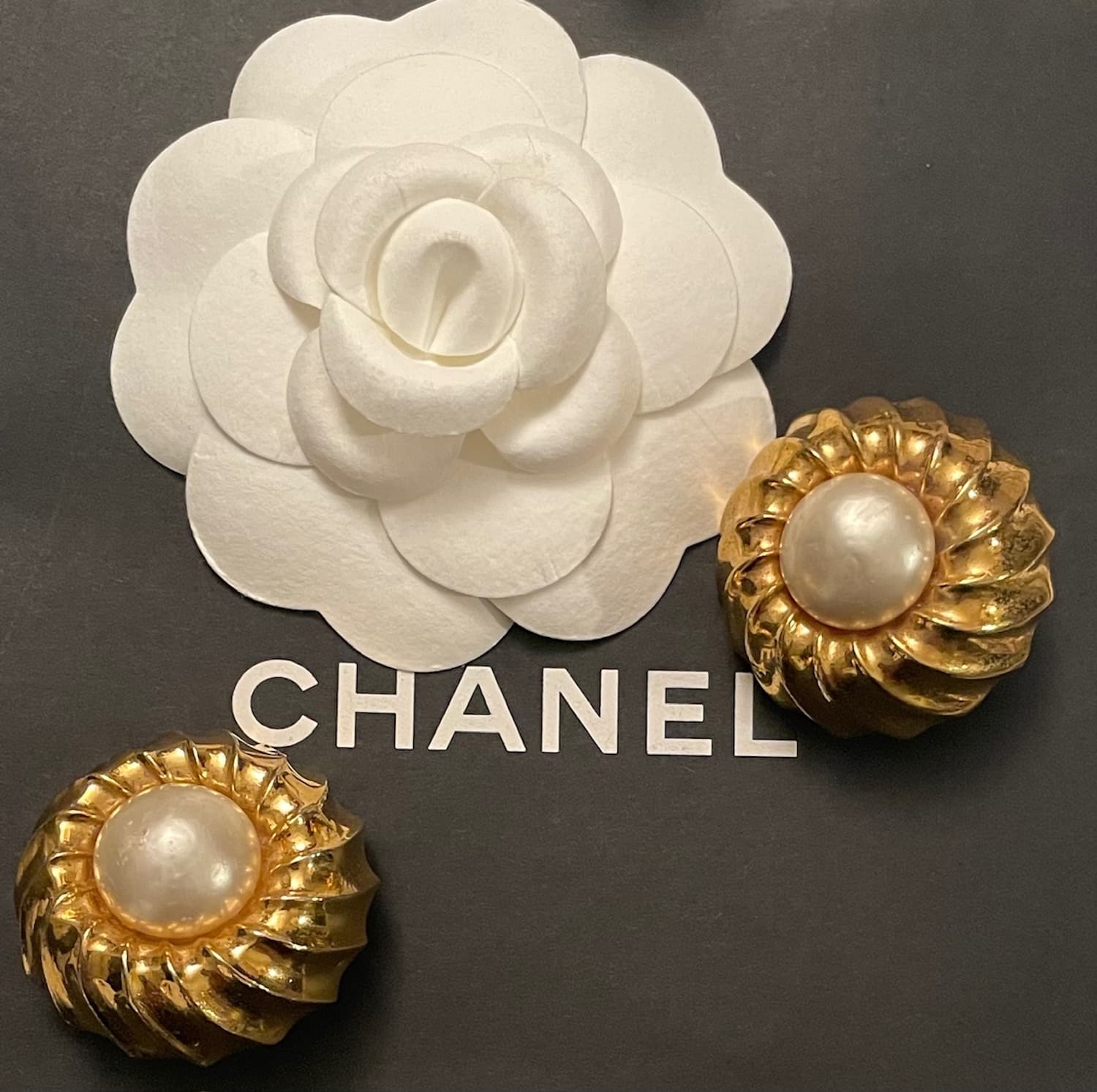 CHANEL Vintage Pearl & Gold Round Sphere Earrings By Coco Chanel W/Box C.1960s