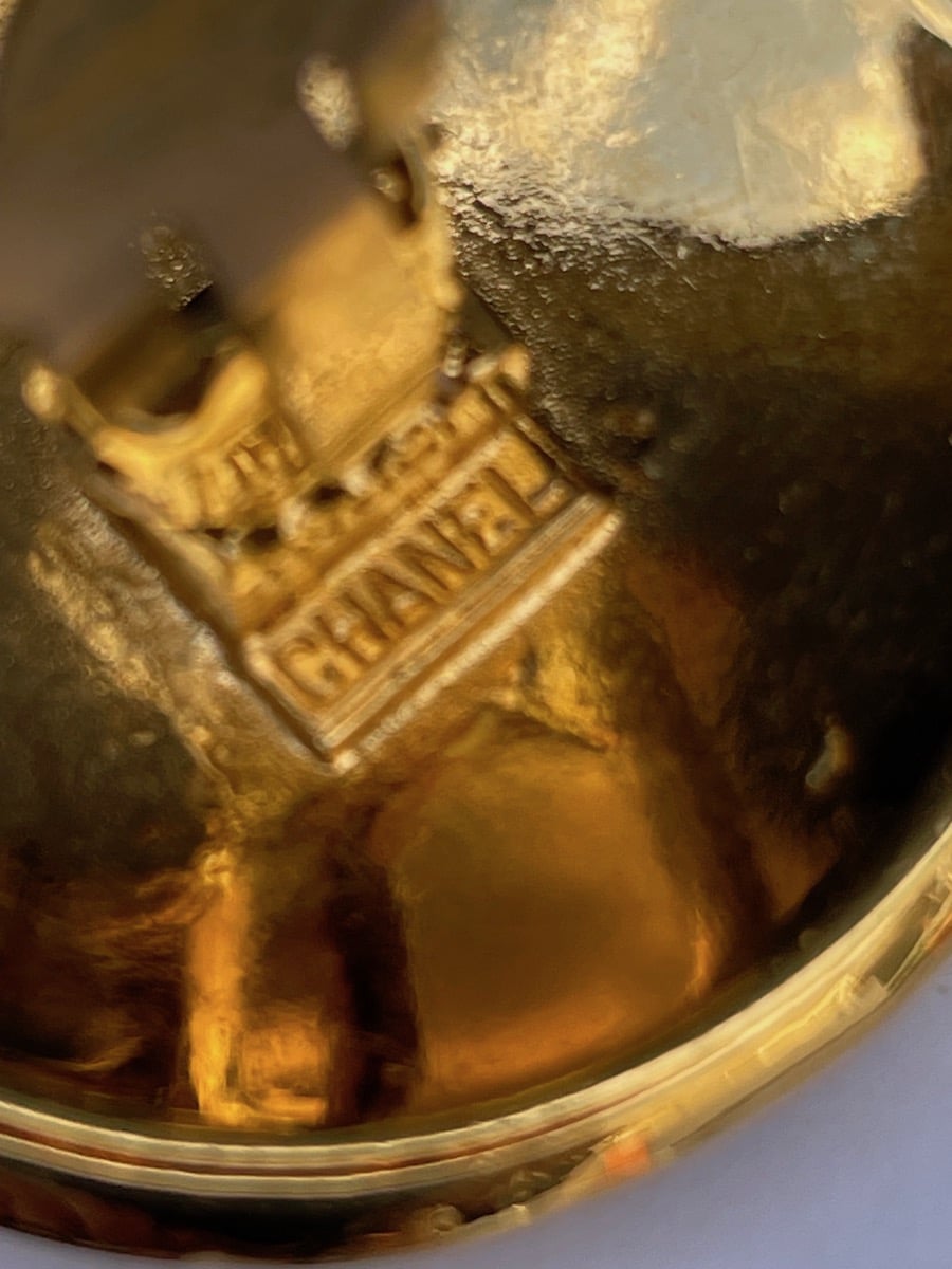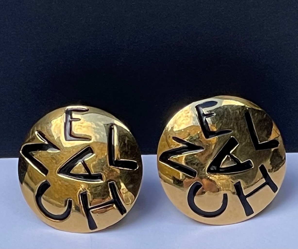 CHANEL Vintage Round Earrings Gold Black Engraved CHANEL Logo C.1983 W/Box
