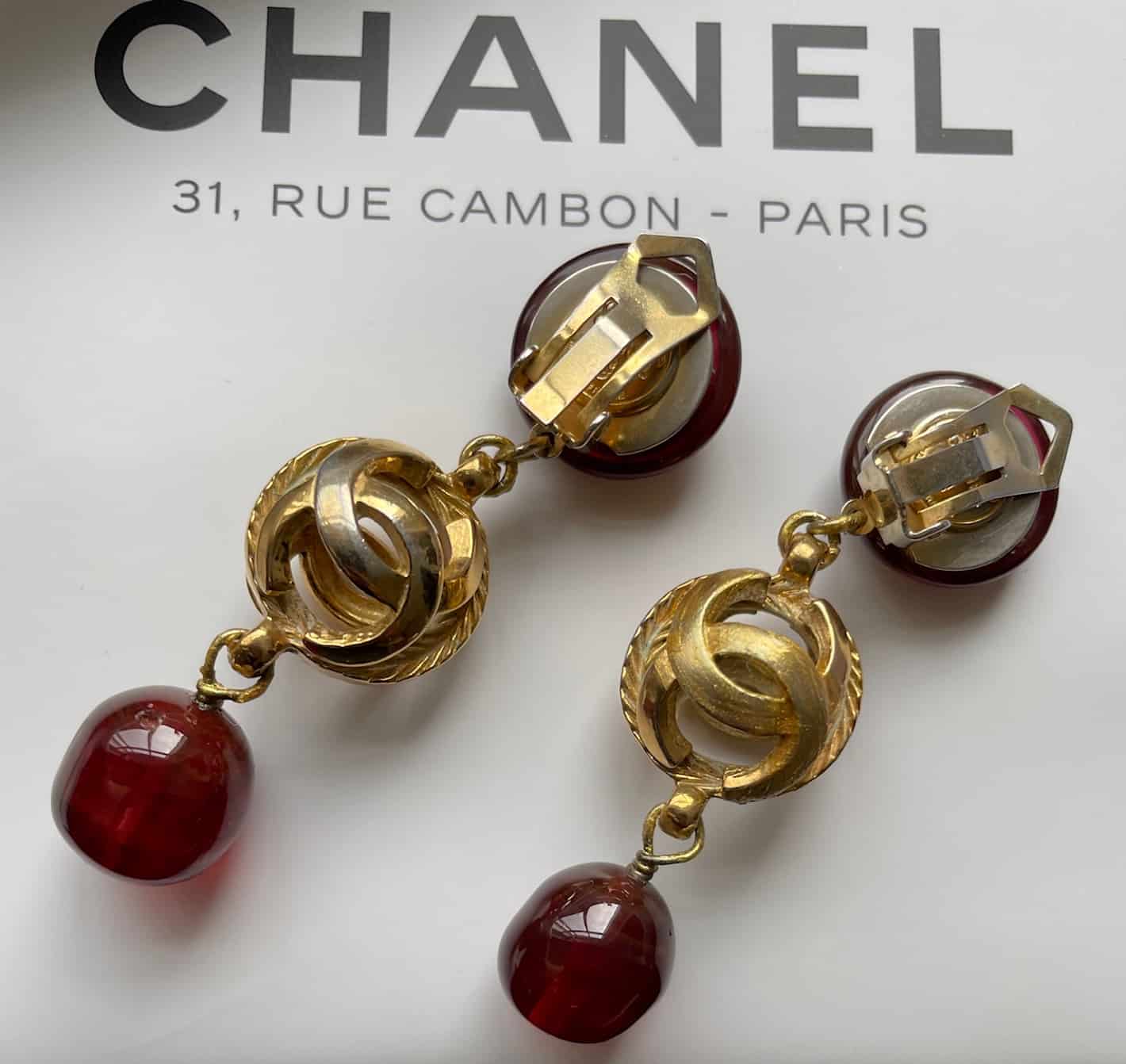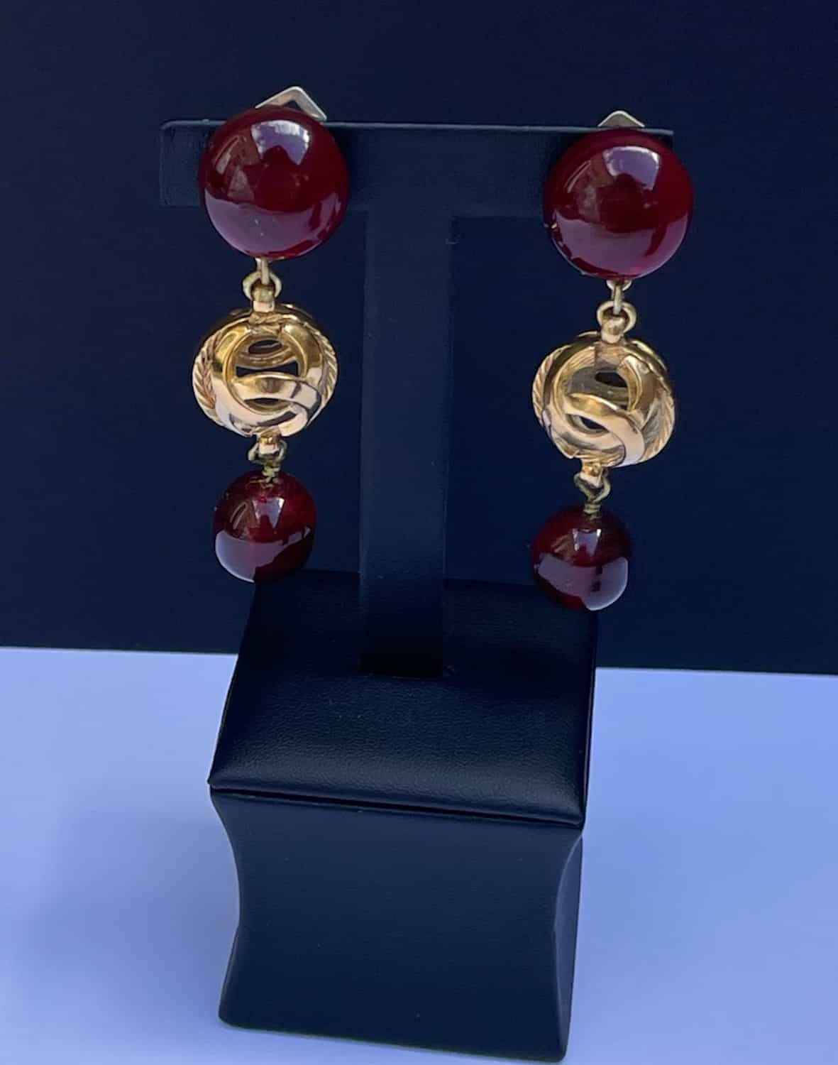 CHANEL Vintage Ruby Gripoix Drop earrings CC Logo Gold Sphere C.1970s W/Box
