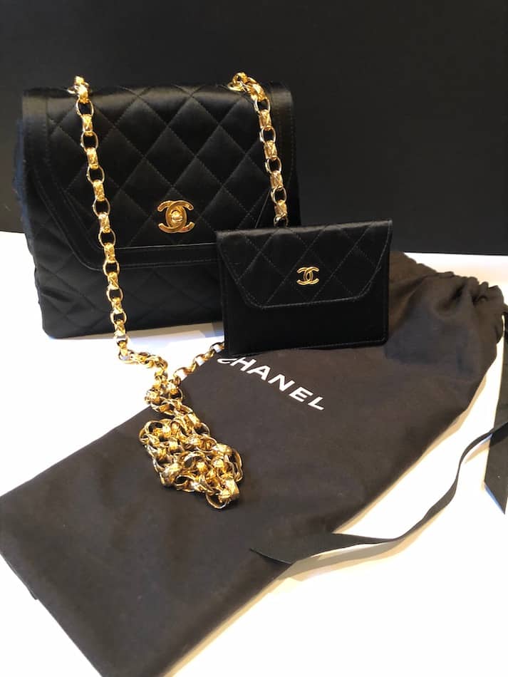A stunning rare Chanel vintage bag with its own small satin wallet. Black quilted satin, gold tone hardware with a CC turn lock and a magnificent gold tone jewel linked chain shoulder strap in very good condition, single rear pocket. The interior is lined with black satin with one slit pocket with one small satin quilted CC logo wallet. This amazing bag could be worn as a cross-body, double shoulder or as a single strap bag. A precious and a stunning unique, rare vintage piece, ‘Must Have’.