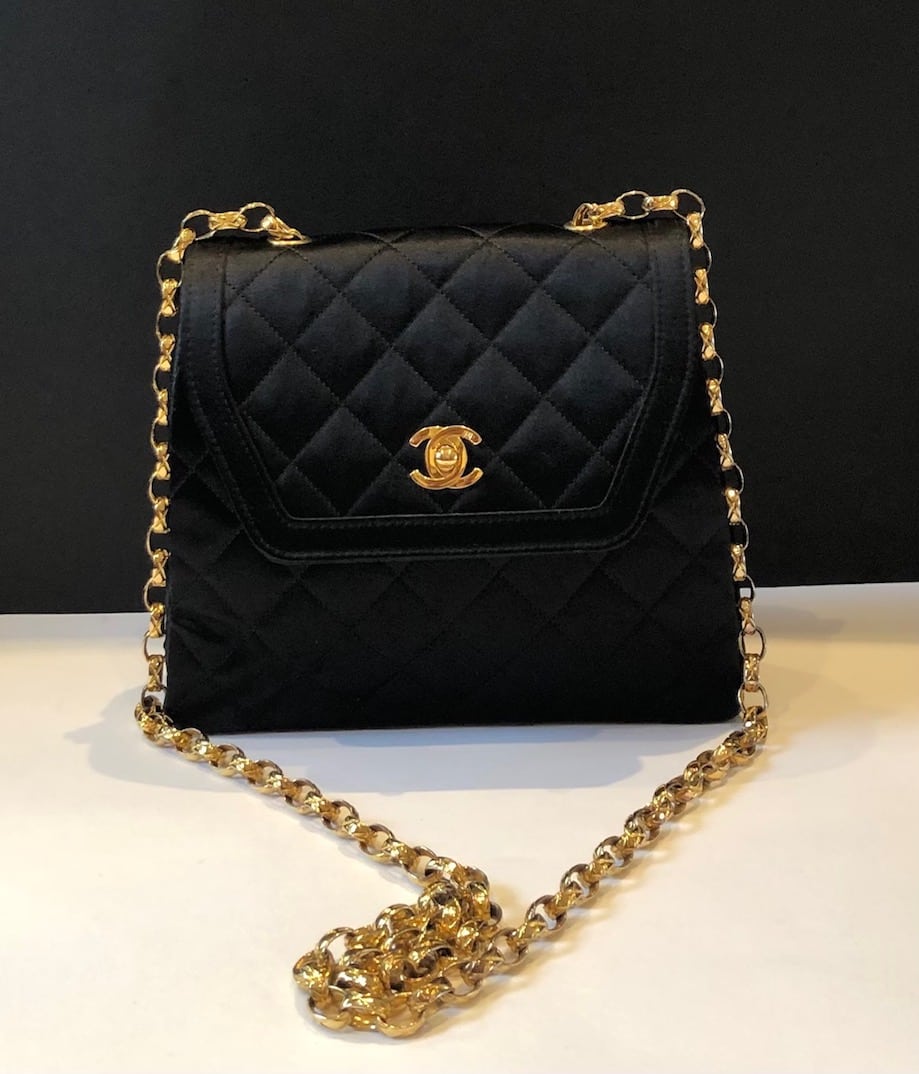 CHANEL Vintage Satin Quilted Black Flap Bag 1990s